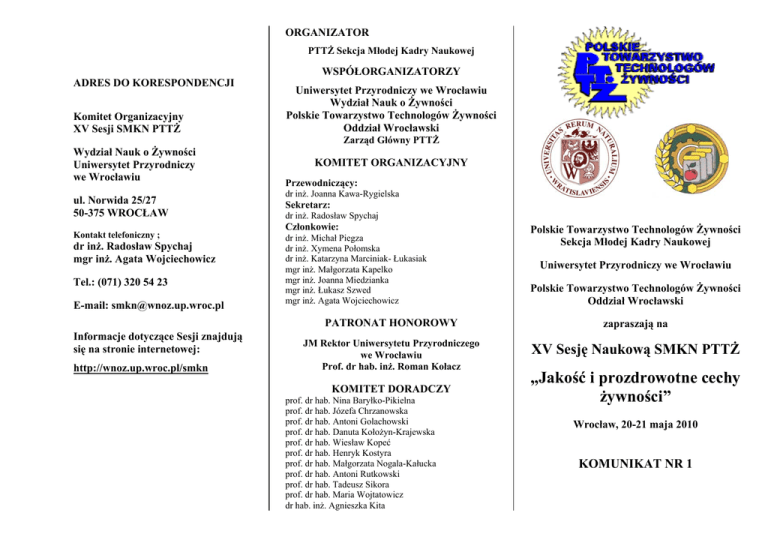 ORGANIZATOR PTTŻ Sekcja Młodej Kadry Naukowej ADRES DO KORESPONDENCJI Komitet Organizacyjny XV Sesji SMKN PTTŻ Wydział Nauk o Żywności Uniwersytet Przyrodniczy we Wrocławiu ul. Norwida 25/27 50-375 WROCŁAW Kontakt telefoniczny ; dr inż. Radosław Spychaj mgr inż. Agata Wojciechowicz Tel.: (071) 320 54 23 E-mail: [email protected] Informacje dotyczące Sesji znajdują się na stronie internetowej: http://wnoz.up.wroc.pl/smkn WSPÓŁORGANIZATORZY Uniwersytet Przyrodniczy we Wrocławiu Wydział Nauk o Żywności Polskie Towarzystwo Technologów Żywności Oddział Wrocławski Zarząd Główny PTTŻ KOMITET ORGANIZACYJNY Przewodniczący: dr inż. Joanna Kawa-Rygielska Sekretarz: dr inż. Radosław Spychaj Członkowie: dr inż. Michał Piegza dr inż. Xymena Połomska dr inż. Katarzyna Marciniak- Łukasiak mgr inż. Małgorzata Kapelko mgr inż. Joanna Miedzianka mgr inż. Łukasz Szwed mgr inż. Agata Wojciechowicz Polskie Towarzystwo Technologów Żywności Sekcja Młodej Kadry Naukowej Uniwersytet Przyrodniczy we Wrocławiu Polskie Towarzystwo Technologów Żywności Oddział Wrocławski PATRONAT HONOROWY zapraszają na JM Rektor Uniwersytetu Przyrodniczego we Wrocławiu Prof. dr hab. inż. Roman Kołacz XV Sesję Naukową SMKN PTTŻ KOMITET DORADCZY prof. dr hab. Nina Baryłko-Pikielna prof. dr hab. Józefa Chrzanowska prof. dr hab. Antoni Golachowski prof. dr hab. Danuta Kołożyn-Krajewska prof. dr hab. Wiesław Kopeć prof. dr hab. Henryk Kostyra prof. dr hab. Małgorzata Nogala-Kałucka prof. dr hab. Antoni Rutkowski prof. dr hab. Tadeusz Sikora prof. dr hab. Maria Wojtatowicz dr hab. inż. Agnieszka Kita „Jakość i prozdrowotne cechy żywności” Wrocław, 20-21 maja 2010 KOMUNIKAT NR 1 INFORMACJE XV Sesja Naukowa SMKN PTTŻ odbędzie się na terenie Centrum Dydaktyczno-Naukowego Uniwersytetu Przyrodniczego we Wrocławiu, Wrocław, pl. Grunwaldzki 24a OPŁATY Koszt uczestnictwa, obejmujący udział w sesji naukowej, materiały konferencyjne oraz wyżywienie wyniesie 400 PLN dla Członków PTTŻ i 450 PLN dla pozostałych uczestników. Wpłaty na konto bankowe: Bank PKO BP S.A. Wrocław Nr konta 62 1020 5242 0000 2102 0029 2045 z dopiskiem: SMKN: 249-39 z podaniem imienia i nazwiska osoby wpłacającej prosimy wnosić do dnia 15 marca 2010 ZAKWATEROWANIE Organizatorzy zapewniają możliwość rezerwacji noclegów w Domach Akademickich lub zapraszamy do skorzystania z bazy hotelowej we Wrocławiu. ZGŁOSZENIA Zgłoszenia uczestnictwa w konferencji prosimy przesyłać w wersji elektronicznej na adres Komitetu Organizacyjnego do dnia 31 stycznia 2010 Streszczenia komunikatów w formie gotowej do druku w wersji elektronicznej prosimy przesyłać na adres Komitetu Organizacyjnego do dnia 15 marca 2010 Na podstawie nadesłanych streszczeń Komitet Doradczy podejmie decyzję o zakwalifikowaniu pracy do prezentacji, o czym Autorzy doniesień zostaną poinformowani do dnia 15 kwietnia 2010 PROGRAM NAUKOWY XV Sesja Naukowa Sekcji Młodej Kadry Naukowej PTTŻ jest kontynuacją corocznych spotkań, których celem jest umożliwienie prezentacji dorobku naukowego doktorantów i młodych pracowników nauki oraz wymiana doświadczeń i poglądów w gronie młodej i doświadczonej kadry naukowej. Mamy nadzieję, że tegoroczna sesja przyczyni się również do dalszej integracji środowiska związanego z szeroko rozumianą nauką o żywności. Prezentowane prace naukowe będą dotyczyły przetwarzania żywności, udoskonalania procesów technologicznych, dodatków do żywności, analizy żywności, kształtowania jakości nowych produktów spożywczych oraz towaroznawstwa. W ramach sesji będą prezentowane doniesienia ustne (10 min.) oraz postery. Wzorem lat poprzednich autorami doniesień winni być młodzi pracownicy nauki. STRESZCZENIA Streszczenia doniesień, powinny zawierać: krótkie wprowadzenie z uzasadnieniem podjęcia danego tematu badań, cel i zakres badań, metodykę lub układ doświadczeń, omówienie wyników (bez tabel i wykresów) oraz wnioski końcowe. Wnioski powinny wiązać się z celem pracy. Na streszczenie należy przeznaczyć 1 stronę formatu papieru A4 (210 mm x 297 mm). Tekst powinien być zawarty w kolumnie: 13 cm x 20 cm łącznie z paginą. Marginesy: górny – 5 cm, dolny – 5,5cm, prawy – 4 cm, lewy od – 4 cm, odstęp między wierszami – pojedynczy, tekst wyjustowany z użyciem opcji dzielenia wyrazów, pierwszy wiersz akapitu 0,5 cm. Edytor tekstu Word 2000 lub 2003, czcionka Times New Roman CE. Streszczenie powinno zawierać: tytuł pracy (centrycznie, pogrubiona czcionka, 12 pkt, wielkie litery), (dwie linie odstępu, 10 pkt), imiona i nazwiska autorów z zaznaczeniem autora prezentującego doniesienie (wyrównanie do lewego marginesu, pogrubiona czcionka, 10 pkt), (jedna linia odstępu, 10 pkt.), miejsce pracy autorów (czcionka 10 pkt), (dwie linie odstępu, 10 pkt) i tekst opracowania (normalna czcionka, 10 pkt.). Streszczenia będą wydrukowane w wersji nadesłanej przez Autorów. Przewiduje się możliwość opublikowania wybranych prac prezentowanych na sesji w kwartalniku „Żywność: Nauka, Technologia, Jakość” przygotowanych zgodnie z wymogami kwartalnika. Termin nadsyłania prac 15 marca 2010. XV Sesja Naukowa Sekcji Młodej Kadry Naukowej PTTŻ „Jakość i prozdrowotne cechy żywności” Wrocław, 20-21 maja 2010 ZGŁOSZENIE UCZESTNICTWA Zgłoszenia należy dokonać poprzez stronę http://wnoz.up.wroc.pl/smkn/zgloszenia uwzględniając następujące dane: Imię i Nazwisko: ............................................... Stopień/Tytuł: ................................................... Instytucja: ......................................................... Adres (do korespondencji): Ulica: .................................................................. Kod pocztowy: .................................................. Miejscowość: ..................................................... Tel./fax: ........................