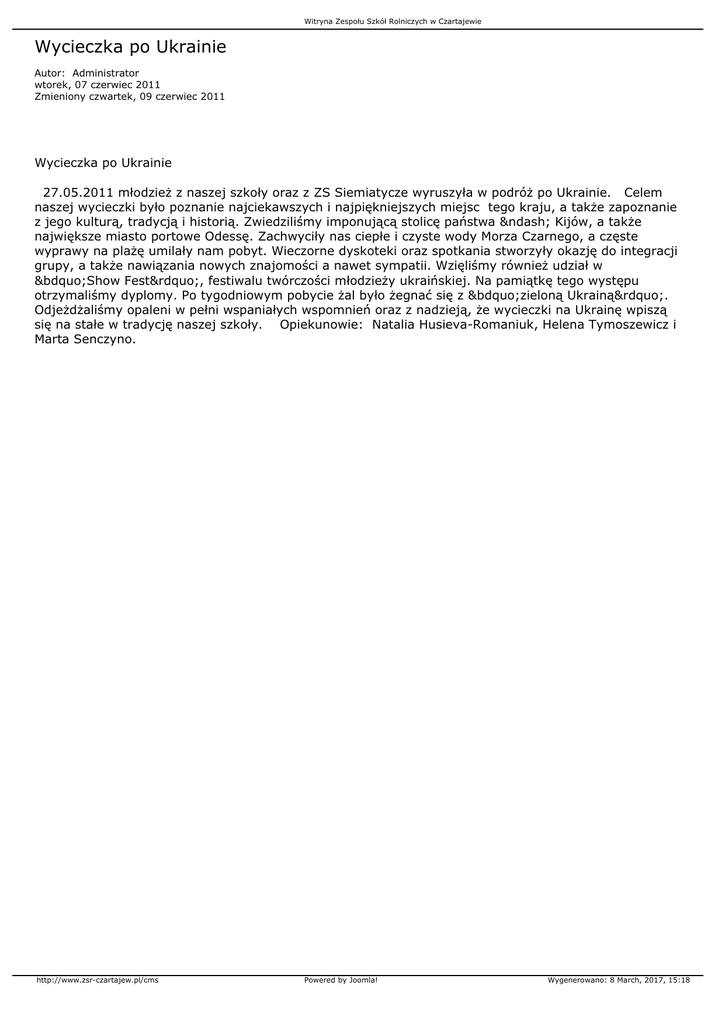 Witryna Zespołu Szkół Rolniczych w Czartajewie Wycieczka po Ukrainie Autor: Administrator wtorek, 07 czerwiec 2011 Zmieniony czwartek, 09 czerwiec 2011 Wycieczka po Ukrainie 27.05.2011 młodzież z naszej szkoły oraz z ZS Siemiatycze wyruszyła w podróż po Ukrainie. Celem naszej wycieczki było poznanie najciekawszych i najpiękniejszych miejsc tego kraju, a także zapoznanie z jego kulturą, tradycją i historią. Zwiedziliśmy imponującą stolicę państwa – Kijów, a także największe miasto portowe Odessę. Zachwyciły nas ciepłe i czyste wody Morza Czarnego, a częste wyprawy na plażę umilały nam pobyt. Wieczorne dyskoteki oraz spotkania stworzyły okazję do integracji grupy, a także nawiązania nowych znajomości a nawet sympatii. Wzięliśmy również udział w „Show Fest”, festiwalu twórczości młodzieży ukraińskiej. Na pamiątkę tego występu otrzymaliśmy dyplomy. Po tygodniowym pobycie żal było żegnać się z „zieloną Ukrainą”. Odjeżdżaliśmy opaleni w pełni wspaniałych wspomnień oraz z nadzieją, że wycieczki na Ukrainę wpiszą się na stałe w tradycję naszej szkoły. Opiekunowie: Natalia Husieva-Romaniuk, Helena Tymoszewicz i Marta Senczyno. http://www.zsr-czartajew.pl/cms Powered by Joomla! Wygenerowano: 8 March, 2017, 15:18