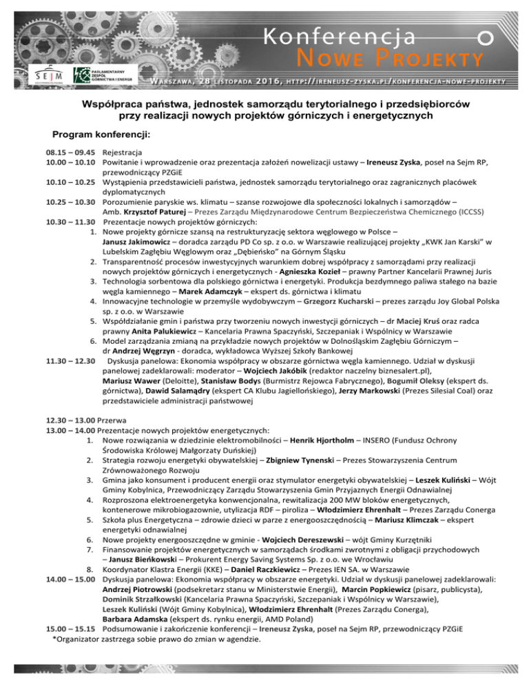 Współpraca państwa, jednostek samorządu terytorialnego i przedsiębiorców przy realizacji nowych projektów górniczych i energetycznych Program konferencji: 08.15 – 09.45 Rejestracja 10.00 – 10.10 Powitanie i wprowadzenie oraz prezentacja założeń nowelizacji ustawy – Ireneusz Zyska, poseł na Sejm RP, przewodniczący PZGiE 10.10 – 10.25 Wystąpienia przedstawicieli państwa, jednostek samorządu terytorialnego oraz zagranicznych placówek dyplomatycznych 10.25 – 10.30 Porozumienie paryskie ws. klimatu – szanse rozwojowe dla społeczności lokalnych i samorządów – Amb. Krzysztof Paturej – Prezes Zarządu Międzynarodowe Centrum Bezpieczeństwa Chemicznego (ICCSS) 10.30 – 11.30 Prezentacje nowych projektów górniczych: 1. Nowe projekty górnicze szansą na restrukturyzację sektora węglowego w Polsce – Janusz Jakimowicz – doradca zarządu PD Co sp. z o.o. w Warszawie realizującej projekty „KWK Jan Karski” w Lubelskim Zagłębiu Węglowym oraz „Dębieńsko” na Górnym Śląsku 2. Transparentność procesów inwestycyjnych warunkiem dobrej współpracy z samorządami przy realizacji nowych projektów górniczych i energetycznych - Agnieszka Kozieł – prawny Partner Kancelarii Prawnej Juris 3. Technologia sorbentowa dla polskiego górnictwa i energetyki. Produkcja bezdymnego paliwa stałego na bazie węgla kamiennego – Marek Adamczyk – ekspert ds. górnictwa i klimatu 4. Innowacyjne technologie w przemyśle wydobywczym – Grzegorz Kucharski – prezes zarządu Joy Global Polska sp. z o.o. w Warszawie 5. Współdziałanie gmin i państwa przy tworzeniu nowych inwestycji górniczych – dr Maciej Kruś oraz radca prawny Anita Palukiewicz – Kancelaria Prawna Spaczyński, Szczepaniak i Wspólnicy w Warszawie 6. Model zarządzania zmianą na przykładzie nowych projektów w Dolnośląskim Zagłębiu Górniczym – dr Andrzej Węgrzyn - doradca, wykładowca Wyższej Szkoły Bankowej 11.30 – 12.30 Dyskusja panelowa: Ekonomia współpracy w obszarze górnictwa węgla kamiennego. Udział w dyskusji panelowej zadeklarowali: moderator – Wojciech Jakóbik (redaktor naczelny biznesalert.pl), Mariusz Wawer (Deloitte), Stanisław Bodys (Burmistrz Rejowca Fabrycznego), Bogumił Oleksy (ekspert ds. górnictwa), Dawid Salamądry (ekspert CA Klubu Jagiellońskiego), Jerzy Markowski (Prezes Silesial Coal) oraz przedstawiciele administracji państwowej 12.30 – 13.00 Przerwa 13.00 – 14.00 Prezentacje nowych projektów energetycznych: 1. Nowe rozwiązania w dziedzinie elektromobilności – Henrik Hjortholm – INSERO (Fundusz Ochrony Środowiska Królowej Małgorzaty Duńskiej) 2. Strategia rozwoju energetyki obywatelskiej – Zbigniew Tynenski – Prezes Stowarzyszenia Centrum Zrównoważonego Rozwoju 3. Gmina jako konsument i producent energii oraz stymulator energetyki obywatelskiej – Leszek Kuliński – Wójt Gminy Kobylnica, Przewodniczący Zarządu Stowarzyszenia Gmin Przyjaznych Energii Odnawialnej 4. Rozproszona elektroenergetyka konwencjonalna, rewitalizacja 200 MW bloków energetycznych, kontenerowe mikrobiogazownie, utylizacja RDF – piroliza – Włodzimierz Ehrenhalt – Prezes Zarządu Conerga 5. Szkoła plus Energetyczna – zdrowie dzieci w parze z energooszczędnością – Mariusz Klimczak – ekspert energetyki odnawialnej 6. Nowe projekty energooszczędne w gminie - Wojciech Dereszewski – wójt Gminy Kurzętniki 7. Finansowanie projektów energetycznych w samorządach środkami zwrotnymi z obligacji przychodowych – Janusz Bieńkowski – Prokurent Energy Saving Systems Sp. z o.o. we Wrocławiu 8. Koordynator Klastra Energii (KKE) – Daniel Raczkiewicz – Prezes IEN SA. w Warszawie 14.00 – 15.00 Dyskusja panelowa: Ekonomia współpracy w obszarze energetyki. Udział w dyskusji panelowej zadeklarowali: Andrzej Piotrowski (podsekretarz stanu w Ministerstwie Energii), Marcin Popkiewicz (pisarz, publicysta), Dominik Strzałkowski (Kancelaria Prawna Spaczyński, Szczepaniak i Wspólnicy w Warszawie), Leszek Kuliński (Wójt Gminy Kobylnica), Włodzimierz Ehrenhalt (Prezes Zarządu Conerga), Barbara Adamska (ekspert ds. rynku energii, AMD Poland) 15.00 – 15.15 Podsumowanie i zakończenie konferencji – Ireneusz Zyska, poseł na Sejm RP, przewodniczący PZGiE *Organizator zastrzega sobie prawo do zmian w agendzie.