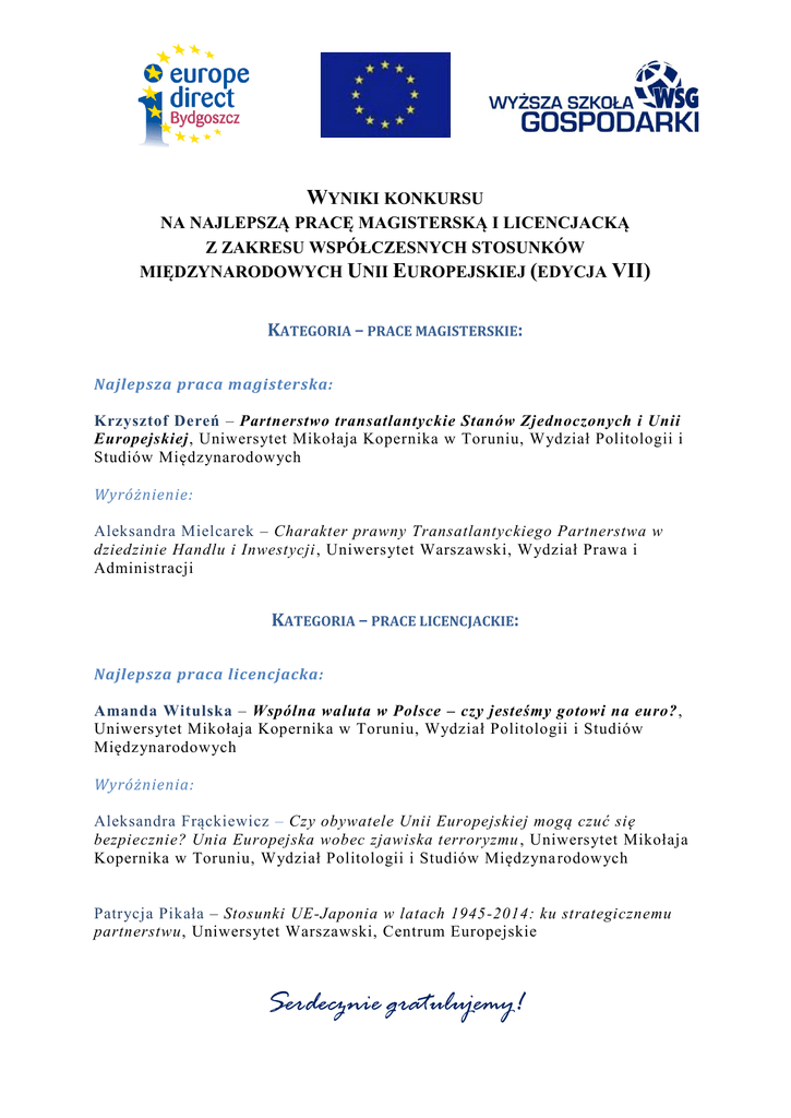 WYNIKI KONKURSU NA NAJLEPSZĄ PRACĘ MAGISTERSKĄ I LICENCJACKĄ Z ZAKRESU WSPÓŁCZESNYCH STOSUNKÓW MIĘDZYNARODOWYCH UNII EUROPEJSKIEJ (EDYCJA VII) KATEGORIA – PRACE MAGISTERSKIE: Najlepsza praca magisterska: Krzysztof Dereń – Partnerstwo transatlantyckie Stanów Zjednoczonych i Unii Europejskiej, Uniwersytet Mikołaja Kopernika w Toruniu, Wydział Politologii i Studiów Międzynarodowych Wyróżnienie: Aleksandra Mielcarek – Charakter prawny Transatlantyckiego Partnerstwa w dziedzinie Handlu i Inwestycji , Uniwersytet Warszawski, Wydział Prawa i Administracji KATEGORIA – PRACE LICENCJACKIE: Najlepsza praca licencjacka: Amanda Witulska – Wspólna waluta w Polsce – czy jesteśmy gotowi na euro?, Uniwersytet Mikołaja Kopernika w Toruniu, Wydział Politologii i Studiów Międzynarodowych Wyróżnienia: Aleksandra Frąckiewicz – Czy obywatele Unii Europejskiej mogą czuć się bezpiecznie? Unia Europejska wobec zjawiska terroryzmu , Uniwersytet Mikołaja Kopernika w Toruniu, Wydział Politologii i Studiów Międzyna rodowych Patrycja Pikała – Stosunki UE-Japonia w latach 1945-2014: ku strategicznemu partnerstwu, Uniwersytet Warszawski, Centrum Europejskie Serdecznie gratulujemy!