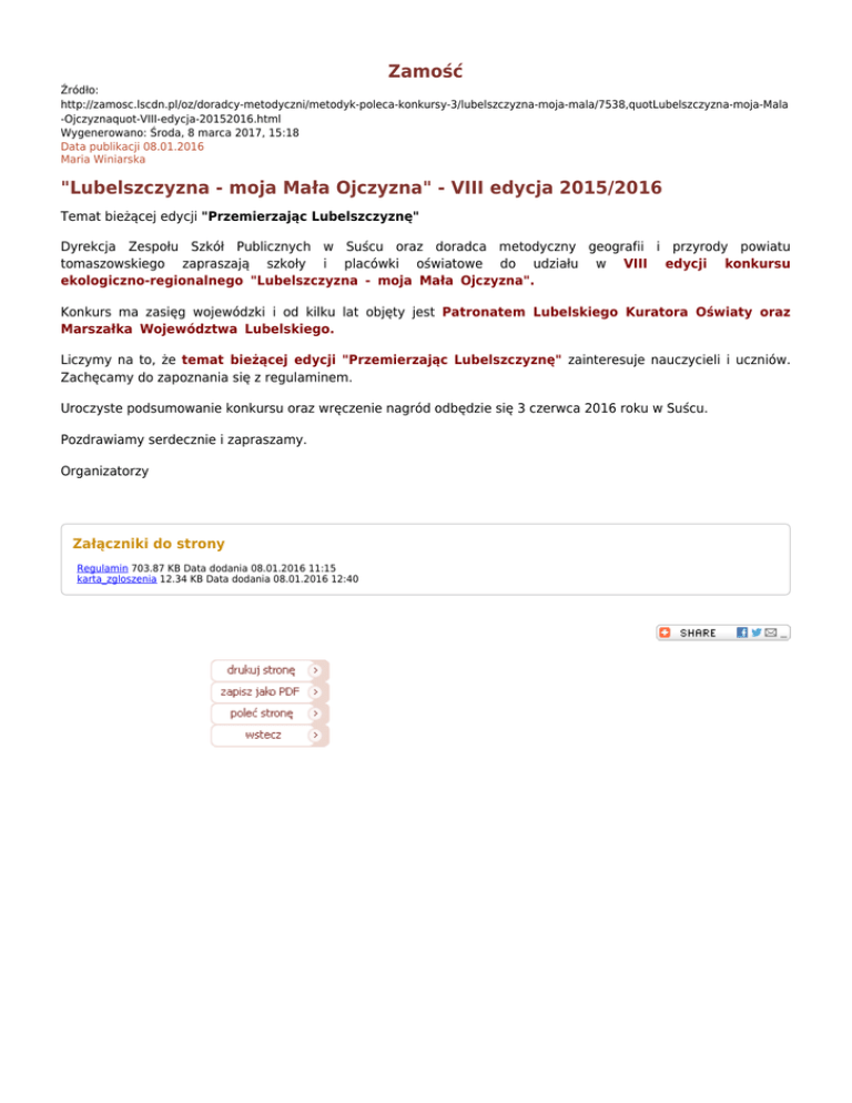 Zamość Źródło: http://zamosc.lscdn.pl/oz/doradcy-metodyczni/metodyk-poleca-konkursy-3/lubelszczyzna-moja-mala/7538,quotLubelszczyzna-moja-Mala -Ojczyznaquot-VIII-edycja-20152016.html Wygenerowano: Środa, 8 marca 2017, 15:18 Data publikacji 08.01.2016 Maria Winiarska "Lubelszczyzna - moja Mała Ojczyzna" - VIII edycja 2015/2016 Temat bieżącej edycji "Przemierzając Lubelszczyznę" Dyrekcja Zespołu Szkół Publicznych w Suścu oraz doradca metodyczny geografii i przyrody powiatu tomaszowskiego zapraszają szkoły i placówki oświatowe do udziału w VIII edycji konkursu ekologiczno-regionalnego "Lubelszczyzna - moja Mała Ojczyzna". Konkurs ma zasięg wojewódzki i od kilku lat objęty jest Patronatem Lubelskiego Kuratora Oświaty oraz Marszałka Województwa Lubelskiego. Liczymy na to, że temat bieżącej edycji "Przemierzając Lubelszczyznę" zainteresuje nauczycieli i uczniów. Zachęcamy do zapoznania się z regulaminem. Uroczyste podsumowanie konkursu oraz wręczenie nagród odbędzie się 3 czerwca 2016 roku w Suścu. Pozdrawiamy serdecznie i zapraszamy. Organizatorzy Załączniki do strony Regulamin 703.87 KB Data dodania 08.01.2016 11:15 karta_zgloszenia 12.34 KB Data dodania 08.01.2016 12:40