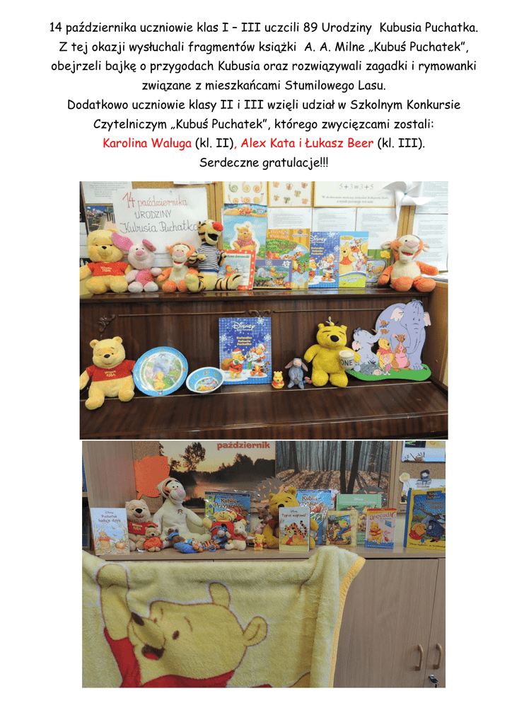 14 października uczniowie klas I – III uczcili 89 Urodziny Kubusia Puchatka. Z tej okazji wysłuchali fragmentów książki A. A. Milne „Kubuś Puchatek”, obejrzeli bajkę o przygodach Kubusia oraz rozwiązywali zagadki i rymowanki związane z mieszkańcami Stumilowego Lasu. Dodatkowo uczniowie klasy II i III wzięli udział w Szkolnym Konkursie Czytelniczym „Kubuś Puchatek”, którego zwycięzcami zostali: Karolina Waluga (kl. II), Alex Kata i Łukasz Beer (kl. III). Serdeczne gratulacje!!! Klasa II Klasa III