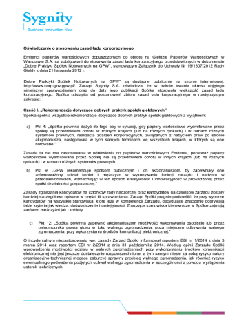 Oświadczenie o stosowaniu zasad ładu korporacyjnego Emitenci papierów wartościowych dopuszczonych do obrotu na Giełdzie Papierów Wartościowych w Warszawie S.A. są zobligowani do stosowania zasad ładu korporacyjnego przedstawionych w dokumencie „Dobre Praktyki Spółek Notowanych na GPW”, stanowiącym Załącznik do Uchwały Nr 19/1307/2012 Rady Giełdy z dnia 21 listopada 2012 r. Dobre Praktyki Spółek Notowanych na GPW” są dostępne publicznie na stronie internetowej: http://www.corp-gov.gpw.pl/. Zarząd Sygnity S.A. oświadcza, że w trakcie trwania okresu objętego niniejszym sprawozdaniem oraz do daty jego publikacji Spółka stosowała większość zasad ładu korporacyjnego. Spółka odstąpiła od postanowień zbioru zasad ładu korporacyjnego w następującym zakresie: Część I. „Rekomendacje dotyczące dobrych praktyk spółek giełdowych” Spółka spełnia wszystkie rekomendacje dotyczące dobrych praktyk spółek giełdowych z wyjątkiem: a) Pkt 4: „Spółka powinna dążyć do tego aby w sytuacji, gdy papiery wartościowe wyemitowane przez spółkę są przedmiotem obrotu w różnych krajach (lub na różnych rynkach) i w ramach różnych systemów prawnych, realizacja zdarzeń korporacyjnych, związanych z nabyciem praw po stronie akcjonariusza, następowała w tych samych terminach we wszystkich krajach, w których są one notowane.” Zasada ta nie ma zastosowania w odniesieniu do papierów wartościowych Emitenta, ponieważ papiery wartościowe wyemitowane przez Spółkę nie są przedmiotem obrotu w innych krajach (lub na różnych rynkach) i w ramach różnych systemów prawnych. b) Pkt 9: „GPW rekomenduje spółkom publicznym i ich akcjonariuszom, by zapewniały one zrównoważony udział kobiet i mężczyzn w wykonywaniu funkcji zarządu i nadzoru w przedsiębiorstwach, wzmacniając w ten sposób kreatywność i innowacyjność w prowadzonej przez spółki działalności gospodarczej.” Zasady zgłaszania kandydatów na członków rady nadzorczej oraz kandydatów na członków zarządu zostały bardziej szczegółowo opisane w części III sprawozdania. Zarząd Spółki pragnie podkreślić, że przy wyborze kandydatów na wszystkie stanowiska, które leżą w kompetencji Zarządu, decydujące znaczenie odgrywają takie kryteria jak wiedza, doświadczenie i umiejętności. Znaczące stanowiska kierownicze w Spółce zajmują zarówno mężczyźni jak i kobiety. c) Pkt 12: „Spółka powinna zapewnić akcjonariuszom możliwość wykonywania osobiście lub przez pełnomocnika prawa głosu w toku walnego zgromadzenia, poza miejscem odbywania walnego zgromadzenia, przy wykorzystaniu środków komunikacji elektronicznej.” O incydentalnym niezastosowaniu ww. zasady Zarząd Spółki informował raportem EBI nr 1/2014 z dnia 3 marca 2014 oraz raportem EBI nr 2/2014 z dnia 31 października 2014. Według opinii Zarządu Spółki wprowadzenie możliwości udziału w walnych zgromadzeniach przy wykorzystaniu środków komunikacji elektronicznej nie jest jeszcze dostatecznie rozpowszechnione, a tym samym niesie za sobą ryzyko natury organizacyjno-technicznej mogące zaburzyć sprawny przebieg walnego zgromadzenia, jak również ryzyko ewentualnego podważenia podjętych uchwał walnego zgromadzenia w szczególności z powodu wystąpienia usterek technicznych. W przyszłości Zarząd Grupy rozważy stosowanie przedmiotowej zasady ładu korporacyjnego. Część II. „Dobre praktyki realizowane przez zarządy spółek giełdowych” Spółka spełnia wszystkie dobre praktyki realizowane przez zarządy spółek giełdowych z wyjątkiem: a) Pkt 1 lit. 2a odnośnie zamieszczania na korporacyjnej stronie internetowej corocznie, w czwartym kwartale - informacji o udziale kobiet i mężczyzn odpowiednio w zarządzie i w radzie nadzorczej spółki Na stronie internetowej Spółki na stałe zamieszczone są szczegółowe informacje o aktualnych członkach zarządu oraz rady nadzorczej (wraz z ich zdjęciami i życiorysami). Spółka nie widzi potrzeby by dodatkowo przedstawiać informację o udziale kobiet i mężczyzn odpowiednio w zarządzie i radzie nadzorczej spółki, gdyż informacja ta wynika bezpośrednio z dostępnej listy osób pełniących funkcje w organach zarządczych. b) Pkt 1 lit. 9a odnośnie zamieszczania na korporacyjnej stronie internetowej zapisu przebiegu obrad walnego zgromadzenia, w formie audio lub wideo Spółka nie rejestruje obrad walnego zgromadzenia. Za pomocą raportów bieżących Spółka publikuje treść uchwał podjętych przez walne zgromadzenie wraz z informacją o sposobie oddania głosów oraz wykaz akcjonariuszy Spółki, posiadających na walnym zgromadzeniu co najmniej 5% ogólnej liczby głosów na tym walnym zgromadzeniu, z określeniem liczby głosów przysługujących każdemu z nich z posiadanych akcji i wskazaniem ich procentowego udziału w liczbie głosów na tym walnym zgromadzeniu oraz w ogólnej liczbie głosów. Spółka przeanalizuje możliwość dostosowania się do zaleceń Dobrych Praktyk w tym zakresie. Część III. „Dobre praktyki stosowane przez członków rad nadzorczych” Spółka spełnia wszystkie dobre praktyki stosowane przez członków rad nadzorczych. Część IV. „Dobre praktyki stosowane przez akcjonariuszy” Spółka spełnia wszystkie dobre praktyki stosowane przez akcjonariuszy, z wyjątkiem: a) Pkt 10: „Spółka powinna zapewnić akcjonariuszom możliwość udziału w walnym zgromadzeniu przy wykorzystaniu środków komunikacji elektronicznej, polegającego na: 1) transmisji obrad walnego zgromadzenia w czasie rzeczywistym, 2) dwustronnej komunikacji w czasie rzeczywistym, w ramach której akcjonariusze mogą wypowiadać się w toku obrad walnego zgromadzenia przebywając w miejscu innym niż miejsce obrad.” O incydentalnym niezastosowaniu ww. zasady Zarząd Spółki informował raportem EBI nr 1/2014 z dnia 3 marca 2014 oraz raportem EBI nr 2/2014 z dnia 31 października 2