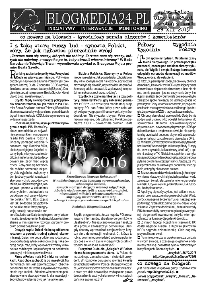 wpisz tylko blogmedia24.pl i zostañ z nami! 29 XII 2015 ========================================================================================== 284 co nowego na blogach - tygodniowy serwis blogerów i komentatorów ========================================================================================== tygodnia Po³owy I z tak¹ wiar¹ ruszy lud - synowie Polski, Po³owy tygodnia córy. ¯e jak mg³awica pierzchnie wróg! „Zarzuca nam się rzeczy, których nie robimy. Zarzuca nam się rzeczy, których nie mówimy, a wszystko po to, żeby obronić własne interesy.” W Boże Narodzenie Telewizja Trwam wyemitowała wywiad o. Grzegorza Moja z premier Beatą Szydło. R anking zaufania do polityków. Prezydent Duda na pierwszym miejscu. Politykiem budzącym największe zaufanie Polaków jest prezydent Andrzej Duda. Z sondażu CBOS wynika, że ufa mu ponad połowa badanych (52 proc.). Drugie miejsce zajmuje premier Beata Szydło, której ufa 46 proc. ankietowanych. Szydło: Nigdy nie wyprowadzę policji przeciw demonstrantom, tak jak robiła to PO. Premier Beata Szydło na antenie Telewizji Republika skomentowała odbywające się od ponad dwóch tygodni manifestacje KOD, które wymierzone są w działania jej rządu. Rodzina najważniejszym punktem w programie rządu PiS. Beata Szydło zapowiedziała, że najważniejszym punktem w programie rządu PiS będzie rodzina. Chcemy pomagać rodzinie finansowo, stąd Rodzina 500+, ale też pamiętajmy, że jeżeli rodziny będą miały poczucie stabilizacji materialnej, będą decydowały się, żeby mieć więcej dzieci . Żeby czuć się bezpiecznie, rodzina potrzebuje też pracy. Jak wyjaśniła, związany z tym jest cały pakiet rozwiązań skierowanych do pracodawców, takich jak ulgi inwestycyjne, rozwojowe, pomoc w zakładaniu własnych firm, postawienie na polski przemysł, uprzywilejowanie polskich firm. Dziś często jest tak, że dobrze przygotowane polskie małe firmy przegrywają, bo stają naprzeciwko konsorcjów, które zaniżają dumpingowo ceny. Wspomniała, że wicepremier Mateusz Morawiecki realizuje w ministerstwie rozwoju „ogromny program pod nazwą Bilion plus”. Decyzja rządu: Dzieci nie będą odbierane rodzicom z powodu trudnej sytuacji ekonomicznej. Dzieci nie będą odbierane rodzicom z powodu trudnej sytuacji ekonomicznej. Taką decyzję podjął rząd, który wprowadził zmiany w Kodeksie rodzinnym i opiekuńczym na podstawie propozycji ministra sprawiedliwości. Firmy w Polsce mają 240 mld zł na rachunkach. Rząd chce zachęcić je do inwestycji. Na rachunkach firm jest zgromadzonych obecnie ponad 240 mld zł i trzeba aktywizować wykorzystanie tego kapitału. Zdaniem wicepremiera państwo powinno stworzyć warunki dla inwestycji żeby ich prowadzenie było jak najłatwiejsze. Elzbieta Rafalska: Stworzymy w Polsce modę na rodzinę. Jak powiedziała, „chciałabym, aby w Polsce była moda na rodzinę, aby rodziną można było się chwalić, aby człowiek, który mówi, że mu się udało, dodawał, iż w pierwszej kolejności ten sukces szedł przez rodzinę”. Szydło: Na czele manifestacji stoją politycy. Gdzie był Petru, gdy zabierano pieniądze z OFE? - Na czele tych manifestacji stoją politycy PO, pan Petru, który przez całe lata był związany z grupami finansowymi, z tym środowiskiem. Nie słyszałam, by pan Petru organizował marsze, gdy zabierano Polakom pieniądze z OFE - powiedziała premier. Beata Szydło przypomniała, że „za rządów PO aresztowano internautów, strzelano do górników w „Jastrzębiu”. - Nie rzucano wówczas haseł, że ktoś próbuje zawłaszczyć demokrację. Dziś, gdy chcemy wprowadzać swoje zmiany, krzyczy się o demokracji i wolności. Ci, którzy to robią, powinni odpowiedzieć sobie na pytanie: czy coś się w ich życiu w ciągu tych ostatnich tygodni zmieniło na niekorzyść? Prezydent Duda dla „Spiegla”: W Polsce nie ma żadnego zamachu stanu. - W Polsce nie ma żadnego zamachu stanu - stwierdził prezydent. W rozmowie poruszono również kwestię ostatnich protestów w Polsce. Duda powiedział, że „w wyniku wyborów doszło do zmiany władzy”, a co za tym idzie nowa ekipa rządząca ma prawo do obsadzenia ważnych stanowisk w instytucjach państwa swoimi ludźmi”. 2 T o był spokojny tydzień. Ostatnimi czasy to coś niebywałego. Co prawda początek przeszedł jeszcze pod znakiem obrony trybunału, ale Wigilia i święta Bożego Narodzenia odpędziły obrońców demokracji od mediów. Wrócą, wrócą, ale osłabieni. Otóż „Superekspres” podał, że czołowy obrońca demokracji, kierownik tzw. KOD-u jest ścigany przez komornika za niepłacenie alimentów, a facet nic nie ma, bo nie pracuje i jest na utrzymaniu żony. Inni (Łęski) znaleźli, że ów demokrata co sie zowie był w zarządzie spółki należącej do jednego gościa od przekrętów. To by w skrócie oznaczało, że po pierwsze faceta muszą wymienić na coś innego i po drugie, że powstanie KOD-u przypadkowe nie było... Obrońcy demokracji apelowali do Dudy by nie podpisywał ustawy, tylko odesłał Trybunałowi do sprawdzenia. Taki żarcik... Apelowali wszyscy od obywatelskich i nowoczesnych przez rpo i KRS po dziennikarstwo d. rządowe co dziwi, bo nie pamiętam by przejawiali podobna aktywność w przeszłości przy lustracji czy zabieraniu pieniędzy z OFE. Minister SZ Waszczykowski skierował pytanie do tzw. Komisji Weneckiej (to taki narząd Rady Europy ds. praw obywatela, kaktusów czy jakoś tak) o opinie nt. ustawy o TK. Nieistotne zupełnie, a zamyka naszym obrońcom demokracji gęby, gdyż skierował pytanie do ich najwyższej instancji. Sądzę, że PIS jest przekonany, że ustawa jest poprawna, więc pytanie jest z góry skazane na sukces... Bez szumu mediów władze dokonują kolejnych wymian w kluczowych instytucjach państwa, warto zauważyć, że sekretarzem stanu (energia) został Naimski. Ożywili się NIK, prokuratura i CBA. Szkoda, że dopi
