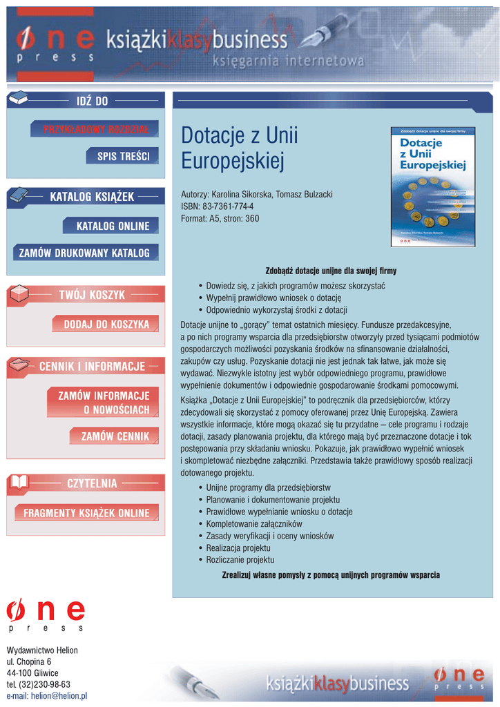 Dotacje z Unii Europejskiej Autorzy: Karolina Sikorska, Tomasz Bulzacki ISBN: 83-7361-774-4 Format: A5, stron: 360 Zdob¹dŸ dotacje unijne dla swojej firmy • Dowiedz siê, z jakich programów mo¿esz skorzystaæ • Wype³nij prawid³owo wniosek o dotacjê • Odpowiednio wykorzystaj œrodki z dotacji Dotacje unijne to „gor¹cy” temat ostatnich miesiêcy. Fundusze przedakcesyjne, a po nich programy wsparcia dla przedsiêbiorstw otworzy³y przed tysi¹cami podmiotów gospodarczych mo¿liwoœci pozyskania œrodków na sfinansowanie dzia³alnoœci, zakupów czy us³ug. Pozyskanie dotacji nie jest jednak tak ³atwe, jak mo¿e siê wydawaæ. Niezwykle istotny jest wybór odpowiedniego programu, prawid³owe wype³nienie dokumentów i odpowiednie gospodarowanie œrodkami pomocowymi. Ksi¹¿ka „Dotacje z Unii Europejskiej” to podrêcznik dla przedsiêbiorców, którzy zdecydowali siê skorzystaæ z pomocy oferowanej przez Uniê Europejsk¹. Zawiera wszystkie informacje, które mog¹ okazaæ siê tu przydatne — cele programu i rodzaje dotacji, zasady planowania projektu, dla którego maj¹ byæ przeznaczone dotacje i tok postêpowania przy sk³adaniu wniosku. Pokazuje, jak prawid³owo wype³niæ wniosek i skompletowaæ niezbêdne za³¹czniki. Przedstawia tak¿e prawid³owy sposób realizacji dotowanego projektu. • Unijne programy dla przedsiêbiorstw • Planowanie i dokumentowanie projektu • Prawid³owe wype³nianie wniosku o dotacje • Kompletowanie za³¹czników • Zasady weryfikacji i oceny wniosków • Realizacja projektu • Rozliczanie projektu Zrealizuj w³asne pomys³y z pomoc¹ unijnych programów wsparcia Spis treści Wstęp 1. Starajmy się jak najwięcej dowiedzieć… Podstawy prawne korzystania z funduszy? Definicja przedsiębiorcy Małe przedsiębiorstwo Średnie przedsiębiorstwo Kilka przeszkód, które stoją na drodze po dofinansowanie 2. Jest w czym wybierać… Dotacje dla firm rozwijających się Zainwestuj Cel: NOWE BUDYNKI / MODERNIZACJA STARYCH BUDYNKÓW Cel: OCHRONA ŚRODOWISKA Cel: SAMOCHODY / SPECJALISTYCZNE ŚRODKI TRANSPORTU Pokaż się klientowi Fachowiec podpowie Będąc na rozbiegu Dla firm innowacyjnych Nie tylko nowe technologie Najczęstsze błędy 7 11 12 21 22 22 23 25 26 26 26 27 28 30 31 34 36 36 36 4 3. 4. DOTACJE Z UNII EUROPEJSKIEJ Dobry projekt jest kluczem do sukcesu 40 42 46 48 51 58 67 68 68 68 69 73 73 Wypełniamy wniosek o dotację 75 W jakiej formie złożyć wniosek? Złożenie wniosku o dofinansowanie, który nie wymaga zaciągnięcia kredytu Złożenie wniosku o dofinansowanie, który wymaga finansowania ze środków kredytu Najczęstsze błędy Przykładowy wniosek Objaśnienia 5. Kompletujemy załączniki Biznesplan i studium wykonalności — co to jest? Elementy niezbędne do stworzenia biznesplanu i studium wykonalności Analiza ekonomiczna 6. Gdzie złożyć wniosek? Sposób ustalenia miejsca lokalizacji projektu 7. 39 Zarządzanie cyklem projektu Najtrudniejsze są początki 1. Analiza 2. Formułowanie celu 3. Realizacja projektu 4. Budżet Najczęstsze błędy Zgodność projektu z polityką UE Polityka konkurencji Zasada de minimis Zamówienia publiczne Ochrona środowiska Równe traktowanie kobiet i mężczyzn Wniosek podlega weryfikacji i ocenie Ocena formalna Ocena ekonomiczno-techniczna Kryteria techniczno-ekonomiczne Ocena merytoryczna Kryteria merytoryczne 76 76 77 78 79 93 103 103 104 126 161 161 163 163 170 171 173 173 SPIS 8. TREŚCI Podpisujemy umowę Umowa o dofinansowanie Treść umowy Zawarcie umowy kredytowej Warunki wypłaty środków finansowych Rozwiązanie umowy o dofinansowanie 9. Realizacja projektu Kontrola — monitoring — ocena (ewaluacja) Różnice Kontrola realizacji projektu Sprawozdania składane przez wnioskodawcę Ocena Rodzaje oceny Etapy procedury ewaluacyjnej 5 183 183 183 185 186 187 191 191 192 194 197 198 198 199 10. Rozliczamy się — otrzymujemy dotację! 207 Procedura płatności Rozliczenie projektu i wypłata dofinansowania 207 208 Podsumowanie A 211 213 Lista instytucji wdrażających SPO WKP Lista regionalnych instytucji finansujących B 213 214 217 Centra Euro Info w Polsce C 217 221 Z jakich dotacji korzystają przedsiębiorcy? Programy przedakcesyjne Phare 2003 Programy wewnętrzne Unii Europejskiej Fundusze strukturalne Pomoc dla przedsiębiorców w ramach SPO WKP 1. Pomoc w zakresie dostępu do usług i informacji 2. Pomoc w zakresie doradztwa 3. Pomoc w zakresie tworzenia korzystnych warunków dla rozwoju przedsiębiorstw 4. Pomoc w zakresie wsparcia finansowego 221 222 233 237 246 247 247 252 254 258 6 DOTACJE Z UNII EUROPEJSKIEJ Pomoc dla przedsiębiorców w ramach SPO RZL 1. Działania pośrednie Pomoc dla przedsiębiorców w ramach ZPORR 1. Działania pośrednie nakierowane na przedsiębiorstwa D 263 263 265 265 269 Certyfikaty jakości HACCP Oznakowanie CE Norma ISO Rodzaje ISO E 269 269 289 295 296 301 Kredyty Kredyt pomostowy Fundusz Poręczeń Unijnych Jak wybrać bank? — cztery kroki Najczęstsze błędy Lista banków F 301 301 304 306 306 307 311 Matryca logiczna projektu G 311 315 Tabela kwalifikowalności szczególnych wydatków H 315 327 Słowniczek Skorowidz 327 341 7 Wniosek podlega weryfikacji i ocenie Ocena formalna Ocenie formalnej poddane zostaną wyłącznie te wnioski o dofinansowanie, które zostały złożone w RIF zgodnie z zasadami opisanymi w poprzednich rozdziałach. Podczas wstępnej oceny sprawdzane jest przede wszystkim, czy: ♦ wniosek został złożony w terminie; ♦ wniosek wypełniono zgodnie z obowiązującym formatem łącznie z podpisaną deklaracją wnioskodawcy, zamieszczoną we „Wniosku o dofinansowanie”; ♦ załączono komplet dokumentów wymienionych w załączniku do „Wniosku o dofinansowanie”; ♦ wnioskodawca jest właścicielem małego lub średniego przedsiębiorstwa, mającego siedzibę na terytorium Rzeczypospolitej Polskiej z wyłączeniem właściciela mikroprzedsiębiorstwa, chyba że prowadzi on dz