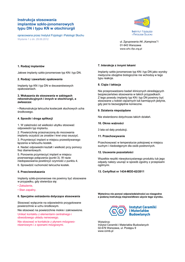 Instrukcja stosowania implantów szkło-jonomerowych typu DN i typu KN w otochirurgii opracowana przez Instytut Fizjologii i Patologii Słuchu Wydanie 1 z dn. 29.06.2012 ul. Zgrupowania AK „Kampinos”1 01-943 Warszawa www.whc.ifps.org.pl 1. Rodzaj implantów 7. Interakcje z innymi lekami Jałowe implanty szkło-jonomerowe typ KN i typ DN. Implanty szkło-jonomerowe typ KN i typ DN jako wyroby medyczne obojętne biologicznie nie wchodzą w tego typu reakcje. 2. Rodzaj i zawartość opakowania Implanty typ KN i typ DN w dwuwarstwowych opakowaniach. 8. Ciąża i laktacja 3. Wskazania do stosowania w zabiegach rekonstrukcyjnych i innych w otochirurgii, a zwłaszcza: Nie przeprowadzano badań klinicznych określających bezpieczeństwo stosowania w takich przypadkach. Z tego powodu implanty typ KN i typ DN powinny być stosowane u kobiet ciężarnych lub karmiących jedynie, gdy jest to bezwzględnie konieczne. • Rekonstrukcja łańcucha kosteczek słuchowych ucha środkowego. 9. Działania niepożądane 4. Sposób i droga aplikacji Nie stwierdzono dotychczas takich działań. 10. Okres ważności 1. W zależności od wielkości ubytku stosować odpowiedni typ implantu. 2. Powierzchnię przeznaczoną do mocowania implantu oczyścić ze zrostów i krwi oraz osuszyć. 3. Przymierzyć implant w miejscu przewidywanego łączenia w łańcuchu kostek. 4. Nadać odpowiedni kształt i wielkość przy pomocy frez diamentowych. 5. Ponownie przymierzyć implant w miejscu przerwanego połączenia (punkt 3). W razie niedopasowania powtórzyć czynność z punktu 4. 6. Sprawdzić ruchomość łańcucha kostek. Wszelkie resztki niewykorzystanego produktu lub jego odpady należy usunąć w sposób zgodny z przepisami ogólnymi. 5. Przeciwwskazania 13. Certyfikat nr 1434-MDD-62/2011 3 lata od daty produkcji. 11. Przechowywanie Przechowywać w temperaturze pokojowej w miejscu suchym i niedostępnym dla osób postronnych. 12. Usuwanie pozostałości Implanty szkło-jonomerowe nie powinny być stosowane w przypadku, gdy stwierdza się: • Zakażenie, • Stan zapalny. 6. Specjalne ostrzeżenia dotyczące stosowania Stosować wyłącznie na odpowiednio przygotowane powierzchnie w uchu środkowym. Nie stosować na powierzchnie mokre i zakrwawione. Unikać kontaktu z elementami centralnego i obwodowego układu nerwowego. Nie stosować w kontakcie z płynem mózgowordzeniowym i z oponami mózgowymi. Wytwórca nie ponosi odpowiedzialności za niezgodne z podaną instrukcją nieprawidłowe użycie tego wyrobu. Wytwórca: Instytut Ceramiki i Materiałów Budowlanych 02-676 Warszawa, ul. Postępu 9 www.icimb.pl
