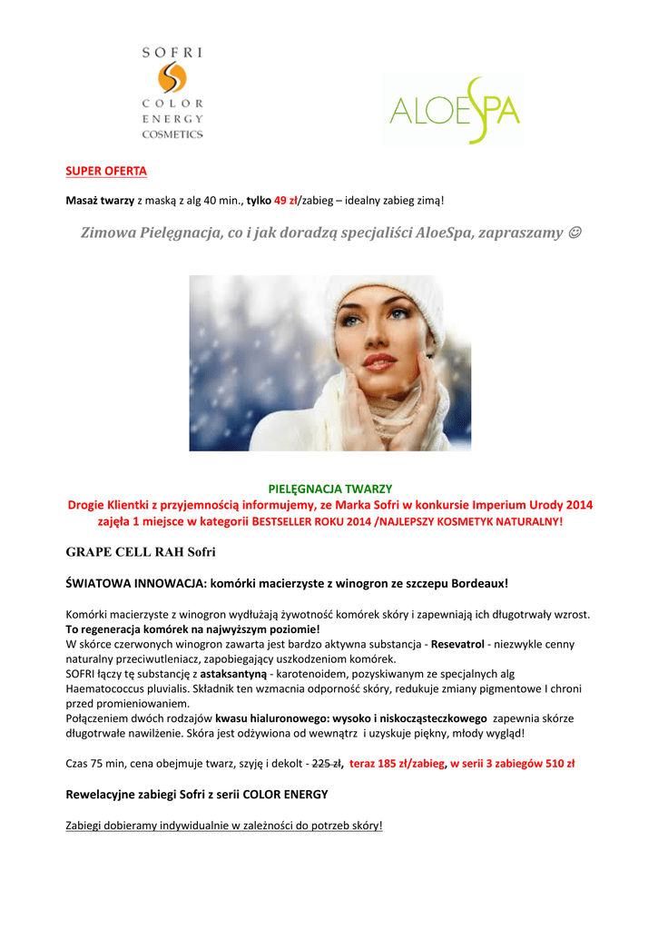 SUPER OFERTA Masaż twarzy z maską z alg 40 min., tylko 49 zł/zabieg – idealny zabieg zimą! Zimowa Pielęgnacja, co i jak doradzą specjaliści AloeSpa, zapraszamy PIELĘGNACJA TWARZY Drogie Klientki z przyjemnością informujemy, ze Marka Sofri w konkursie Imperium Urody 2014 zajęła 1 miejsce w kategorii BESTSELLER ROKU 2014 /NAJLEPSZY KOSMETYK NATURALNY! GRAPE CELL RAH Sofri ŚWIATOWA INNOWACJA: komórki macierzyste z winogron ze szczepu Bordeaux! Komórki macierzyste z winogron wydłużają żywotność komórek skóry i zapewniają ich długotrwały wzrost. To regeneracja komórek na najwyższym poziomie! W skórce czerwonych winogron zawarta jest bardzo aktywna substancja - Resevatrol - niezwykle cenny naturalny przeciwutleniacz, zapobiegający uszkodzeniom komórek. SOFRI łączy tę substancję z astaksantyną - karotenoidem, pozyskiwanym ze specjalnych alg Haematococcus pluvialis. Składnik ten wzmacnia odporność skóry, redukuje zmiany pigmentowe I chroni przed promieniowaniem. Połączeniem dwóch rodzajów kwasu hialuronowego: wysoko i niskocząsteczkowego zapewnia skórze długotrwałe nawilżenie. Skóra jest odżywiona od wewnątrz i uzyskuje piękny, młody wygląd! Czas 75 min, cena obejmuje twarz, szyję i dekolt - 225 zł, teraz 185 zł/zabieg, w serii 3 zabiegów 510 zł Rewelacyjne zabiegi Sofri z serii COLOR ENERGY Zabiegi dobieramy indywidualnie w zależności do potrzeb skóry! Jaki kolor pasuje do Ciebie? Często intuicyjnie wybieramy kolor, który zrównoważy dysharmonie w naszym ciele i pozwoli Chi – energii życia – płynąć dalej. Energia kolorów wzmacnia skuteczność działania kosmetyków SOFRI. Niezwykła skuteczność ekstraktów z roślin. Wszystkie siedem systemów pielęgnacji wykorzystuje wyjątkowo skuteczne ekstrakty roślinne i łącząc je w unikalną kombinację. Czerwona - dla cery wymagającej, z obniżoną energią i zmianami pigmentacyjnymi Pomarańczowa - dla cery dojrzałej, z widoczną utratą elastyczności Żółta - dla cery młodej i problematycznej Zielona - dla cery mieszanej i zanieczyszczonej Niebieska - dla cery suchej, naczynkowej, ze skłonnością do podrażnień Liliowa - dla cery suchej i wrażliwej Fioletowa - dla cery suchej i bardzo wymagającej Czas zabiegu 75 minut, cena obejmuje twarz, szyję i dekolt - 169 zł, teraz 139 zł, w serii 3 zabiegów 390 zł (zabieg zawiera m.in. ampułkę ze skoncentrowanymi składnikami wtłoczoną w skórę za pomocą jonoforezy z koloroterapią za pomocą silnie nawilżającego żelu z kwasem hialuronowym) Polecamy kosmetyki Sofri ze wszystkich serii do pielęgnacji codziennej, zapytaj kosmetyczki, która seria jest najlepsza dla Ciebie! Pamiętaj o serum i kremie pod oczy, masce i kremie na twarz, specjalnym kremie na dekolt i antycellulitowym PIELĘGNACJA CIAŁA Zima to okres trudny dla naszej skóry, gdyż przez większość dnia nosimy na sobie ubranie, często są to obcisłe rzeczy, często zdarza się nam przegrzać. Warto zatem pamiętać o wykonywaniu raz w tygodniu peelingu na całe ciało. OFERTA SPECJALNA Peeling ciała z masażem, czas 75 minut – 140 zł ZABIEGI PIELĘGNACYJNE IPL – na wszystkie zabiegi udzielimy 40% rabatu na serię minimum 5 zabiegów! _________________________________________________________ *Promocje i rabaty nie łączą się Oferta ważna od 07.01.2015 do 14.03.2015 uL. Sosnowa 2, Czerwonak, tel. (61) 81 20 761, 784 53 63 73, www.aloespa.pl czynne: poniedziałek i piątek godz: 12.00-21.00, sobota 9.00-16.00, wtorek, środa, czwartek godz: 10.00-21.00