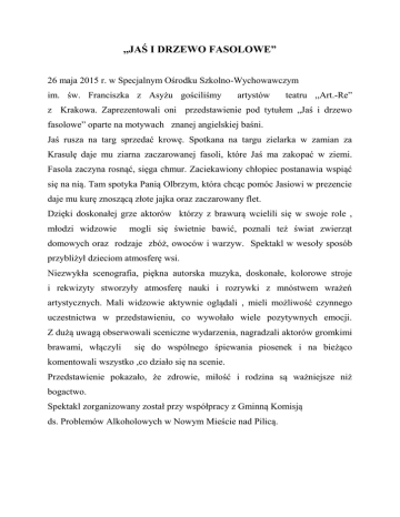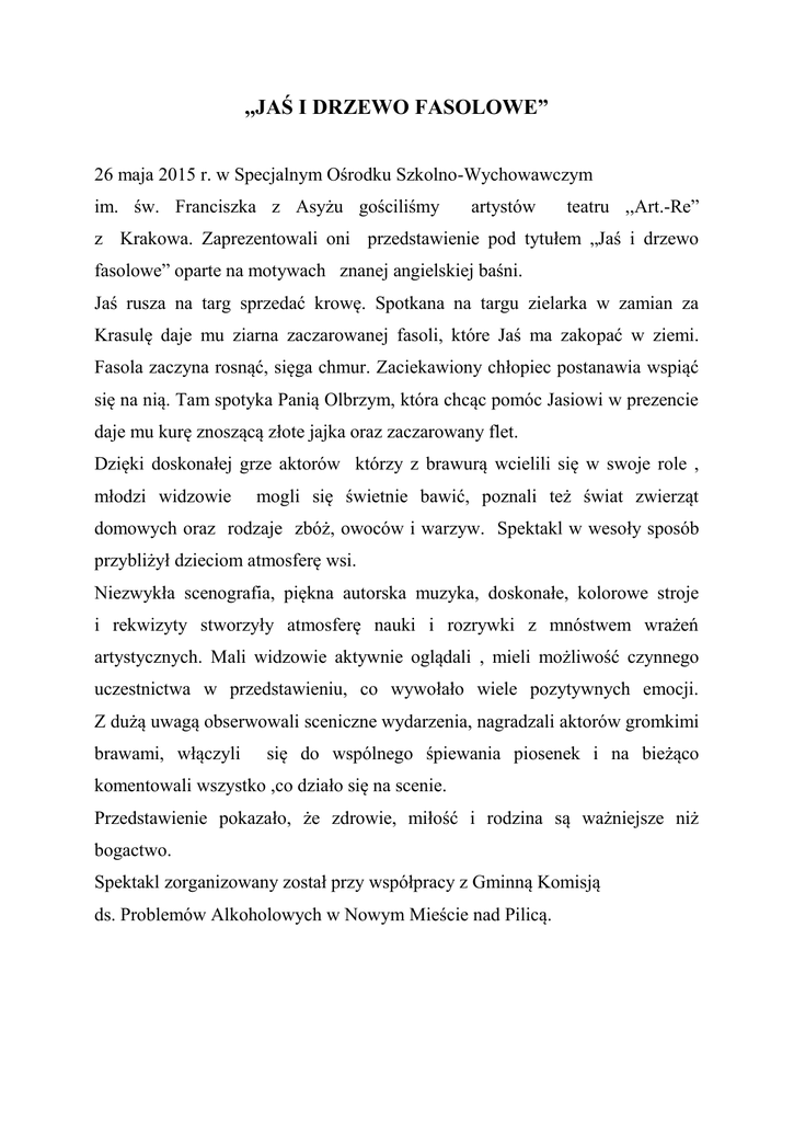 ,,JAŚ I DRZEWO FASOLOWE” 26 maja 2015 r. w Specjalnym Ośrodku Szkolno-Wychowawczym im. św. Franciszka z Asyżu gościliśmy artystów teatru ,,Art.-Re” z Krakowa. Zaprezentowali oni przedstawienie pod tytułem „Jaś i drzewo fasolowe” oparte na motywach znanej angielskiej baśni. Jaś rusza na targ sprzedać krowę. Spotkana na targu zielarka w zamian za Krasulę daje mu ziarna zaczarowanej fasoli, które Jaś ma zakopać w ziemi. Fasola zaczyna rosnąć, sięga chmur. Zaciekawiony chłopiec postanawia wspiąć się na nią. Tam spotyka Panią Olbrzym, która chcąc pomóc Jasiowi w prezencie daje mu kurę znoszącą złote jajka oraz zaczarowany flet. Dzięki doskonałej grze aktorów którzy z brawurą wcielili się w swoje role , młodzi widzowie mogli się świetnie bawić, poznali też świat zwierząt domowych oraz rodzaje zbóż, owoców i warzyw. Spektakl w wesoły sposób przybliżył dzieciom atmosferę wsi. Niezwykła scenografia, piękna autorska muzyka, doskonałe, kolorowe stroje i rekwizyty stworzyły atmosferę nauki i rozrywki z mnóstwem wrażeń artystycznych. Mali widzowie aktywnie oglądali , mieli możliwość czynnego uczestnictwa w przedstawieniu, co wywołało wiele pozytywnych emocji. Z dużą uwagą obserwowali sceniczne wydarzenia, nagradzali aktorów gromkimi brawami, włączyli się do wspólnego śpiewania piosenek i na bieżąco komentowali wszystko ,co działo się na scenie. Przedstawienie pokazało, że zdrowie, miłość i rodzina są ważniejsze niż bogactwo. Spektakl zorganizowany został przy współpracy z Gminną Komisją ds. Problemów Alkoholowych w Nowym Mieście nad Pilicą. Przygotowała : Agnieszka Milczarczyk