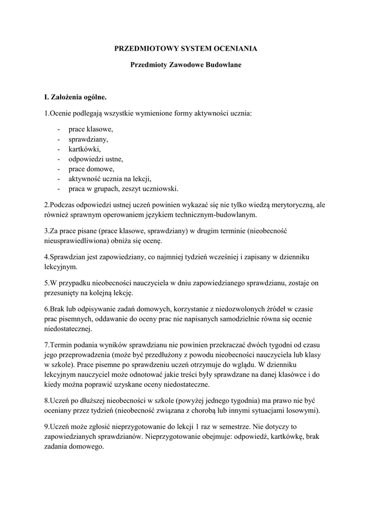 PRZEDMIOTOWY SYSTEM OCENIANIA Przedmioty Zawodowe Budowlane I. Założenia ogólne. 1.Ocenie podlegają wszystkie wymienione formy aktywności ucznia: prace klasowe, sprawdziany, kartkówki, odpowiedzi ustne, prace domowe, aktywność ucznia na lekcji, praca w grupach, zeszyt uczniowski. 2.Podczas odpowiedzi ustnej uczeń powinien wykazać się nie tylko wiedzą merytoryczną, ale również sprawnym operowaniem językiem technicznym-budowlanym. 3.Za prace pisane (prace klasowe, sprawdziany) w drugim terminie (nieobecność nieusprawiedliwiona) obniża się ocenę. 4.Sprawdzian jest zapowiedziany, co najmniej tydzień wcześniej i zapisany w dzienniku lekcyjnym. 5.W przypadku nieobecności nauczyciela w dniu zapowiedzianego sprawdzianu, zostaje on przesunięty na kolejną lekcję. 6.Brak lub odpisywanie zadań domowych, korzystanie z niedozwolonych źródeł w czasie prac pisemnych, oddawanie do oceny prac nie napisanych samodzielnie równa się ocenie niedostatecznej. 7.Termin podania wyników sprawdzianu nie powinien przekraczać dwóch tygodni od czasu jego przeprowadzenia (może być przedłużony z powodu nieobecności nauczyciela lub klasy w szkole). Prace pisemne po sprawdzeniu uczeń otrzymuje do wglądu. W dzienniku lekcyjnym nauczyciel może odnotować jakie treści były sprawdzane na danej klasówce i do kiedy można poprawić uzyskane oceny niedostateczne. 8.Uczeń po dłuższej nieobecności w szkole (powyżej jednego tygodnia) ma prawo nie być oceniany przez tydzień (nieobecność związana z chorobą lub innymi sytuacjami losowymi). 9.Uczeń może zgłosić nieprzygotowanie do lekcji 1 raz w semestrze. Nie dotyczy to zapowiedzianych sprawdzianów. Nieprzygotowanie obejmuje: odpowiedź, kartkówkę, brak zadania domowego. 10.Uczeń ma obowiązek prowadzenia zeszytu przedmiotowego. Zeszyt powinien być prowadzony systematycznie. Uczeń, w przypadku nieobecności w szkole powinien zeszyt uzupełnić. 11.W razie kłopotów z opanowaniem wiadomości i umiejętności uczeń może zwrócić się do nauczyciela. 12.Uczniowie za brak zadania domowego otrzymują ocenę niedostateczną. Zadania domowe są wykonane w dodatkowym do tego przeznaczonym zeszycie. 13. Oceny bieżące, semestralne i roczne wyrażane są w stopniach według skali: celujący (6, cel) bardzo dobry (5, bdb) dobry (4,db) dostateczny (3, dst) dopuszczający (2, dop) niedostateczny (1, ndst) Przy zapisie ocen cząstkowych dopuszcza się stosowanie znaków „+” i „-”. 14. W ocenianiu nauczyciel stosują zasady: częstotliwości i rytmiczności – uczeń oceniany jest na bieżąco i rytmicznie, jawności – uczeń zna kryteria oceniania, zakres materiału oraz formy pracy podlegające ocenie, różnicowania wymagań – zadania stawiane uczniom dają możliwość uzyskania wszystkich ocen. 15. Celem oceny ucznia jest: informowanie ucznia o poziomie osiągnięć edukacyjnych, udzielanie uczniowi pomocy w nauce poprzez przekazanie uczniowi informacji o tym, co zrobił dobrze i jak powinien się dalej uczyć, udzielenie wskazówek do samodzielnego planowania własnego rozwoju; motywowanie ucznia do dalszych postępów w nauce, dostarczenie rodzicom i nauczycielom informacji o postępach, trudnościach w nauce i szczególnych uzdolnieniach ucznia, umożliwienie nauczycielom doskonalenia organizacji i metod pracy dydaktyczno – wychowawczej, monitorowanie bieżącej pracy ucznia. 16.Oceny są jawne dla ucznia i jego rodziców. 17.Uzasadnianie oceny: Nauczyciel uzasadnia ocenę z odpowiedzi ustnej na zajęciach edukacyjnych. Nauczyciel uzasadnia ocenę z pracy pisemnej w zamieszczonym w tej pracy krótkim pisemnym komentarzu, uwzględniającym poziom opanowania przez uczniów wiadomości i umiejętności. Ocen z kartkówek nie uzasadnia się. II. Formy oceniania ucznia 1. Pomiar osiągnięć uczniów odbywa się za pomocą następujących narzędzi: a) Sprawdziany ,testy podsumowujące wiadomości z danego działu, czas trwania 1 godzina lekcyjna ; sprawdzian może mieć formę pisemną, ustną bądź praktyczną na komputerze. b) Kartkówki podsumowujące wiadomości z części działu (także z zadań domowych) w zależności od potrzeb (konieczność przypomnienia lub sprawdzenia wiedzy), czas trwania 5 – 20 min. c) odpowiedzi ustne - uczeń może być bez zapowiedzi wezwany do odpowiedzi obejmującej trzy ostatnie jednostki tematyczne; ocenie podlega znajomość treści z zakresu podstawy programowej, umiejętność wnioskowania, uogólniania, uzasadniania, analizowania tematu czy zadania, zawartość rzeczowa, formułowanie spostrzeżeń, wyrażania sądów, trafność doboru metod rozwiązania danego zagadnienia; d) zadania domowe w zależności od potrzeb (sprawdzane w formie kartkówki lub w trakcie sprawdzania zeszytu); zadania w postaci prezentacji multimedialnych; e) zadania wykonywane na lekcji ( zadania obliczeniowe, praca z tekstem źródłowym, wyszukiwanie informacji z różnych źródeł, praca w grupach, parach ) f) sposób prowadzenia zeszytu przedmiotowego; jego zupełność, przejrzystość, staranność wykonywania schematów, rysunków, itp; g) efekty pracy metodą projektów uczniowskich h) aktywność na lekcji. 2. Przyjmuje się następującą ilość ocen cząstkowych w semestrze (uzależnioną od ilości godzin lekcyjnych z danego przedmiotu w tygodniu): Jedna godz. tygodniowo – minimum 3 oceny, Dwie i trzy godz. tygodniowo – minimum 4 oceny, Cztery i więcej godz. tygodniowo – minimum 5 ocen. Prace pisemne 1. Zastosowanie procentowych progów ocen cząstkowych z prac pisemnych: TECHNIKUM ZSZ 0 – 35 %- ndst. 0 – 29 %- ndst. 36 - 50%- dop. 30 – 49 %- dop. 51 - 75%- dst. 50 – 70 %- dst. 76 - 85%- db. 71 – 85 %- db. 86 - 95%- bdb. 86 - 95%- bdb. 96 - 100%- cel. 96 - 100%- cel. 2. Sprawdziany są zapowiadane co najmniej tydzień wcześniej z podaniem obowiązującego zakresu materiału; termin pracy zapisywany jest w dzienniku lekcyjnym. Uzgodniony termin może zostać