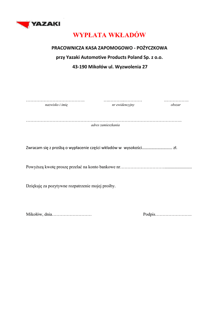 WYPŁATA WKŁADÓW PRACOWNICZA KASA ZAPOMOGOWO - POŻYCZKOWA przy Yazaki Automotive Products Poland Sp. z o.o. 43-190 Mikołów ul. Wyzwolenia 27 …………………………………. nazwisko i imię ….………..………… .……………. nr ewidencyjny obszar ……………………………………………………………………………………………. adres zamieszkania Zwracam się z prośbą o wypłacenie części wkładów w wysokości………………………… zł. Powyższą kwotę proszę przelać na konto bankowe nr…………………………......................... Dziękuję za pozytywne rozpatrzenie mojej prośby. Mikołów, dnia……………………… Podpis…………………….