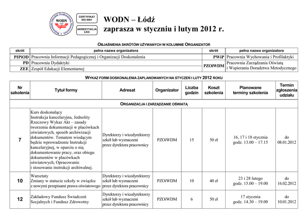 OFERTA WODN-Łódź na STYCZEŃ i LUTY 2012 r.
