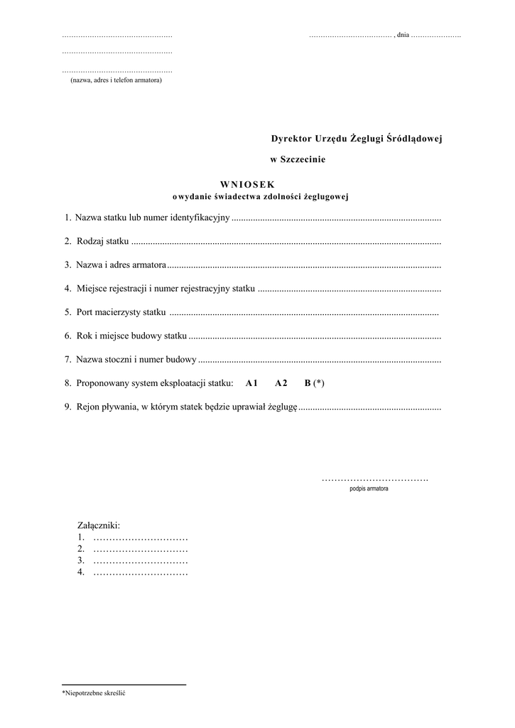 ………………………………………… ……………………………… , dnia …………………. ………………………………………… ………………………………………… (nazwa, adres i telefon armatora) Dyrektor Urzędu Żeglugi Śródlądowej w Szczecinie WNIOSEK o wydanie świadectwa zdolności żeglugowej 1. Nazwa statku lub numer identyfikacyjny ........................................................................................ 2. Rodzaj statku .................................................................................................................................. 3. Nazwa i adres armatora ................................................................................................................... 4. Miejsce rejestracji i numer rejestracyjny statku ............................................................................. 5. Port macierzysty statku ................................................................................................................. 6. Rok i miejsce budowy statku .......................................................................................................... 7. Nazwa stoczni i numer budowy ...................................................................................................... 8. Proponowany system eksploatacji statku: A1 A2 B (*) 9. Rejon pływania, w którym statek będzie uprawiał żeglugę ............................................................ ……………………………. podpis armatora Załączniki: 1. ………………………… 2. ………………………… 3. ………………………… 4. ………………………… *Niepotrzebne skreślić