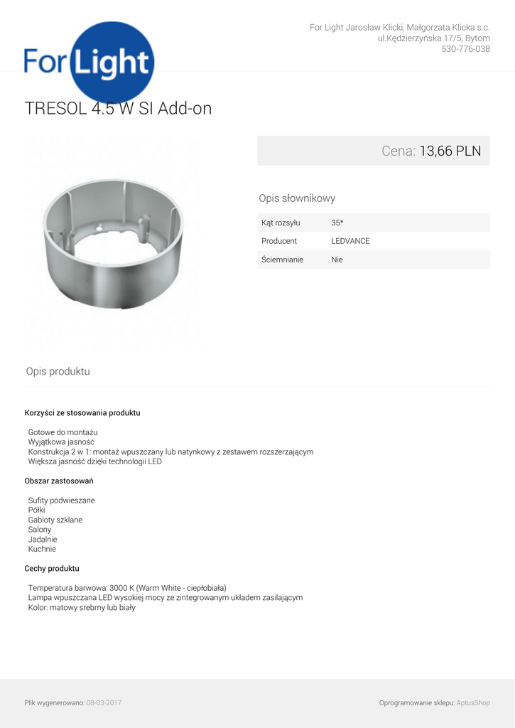 For Light Jarosław Klicki, Małgorzata Klicka s.c. ul.Kędzierzyńska 17/5, Bytom 530-776-038 TRESOL 4.5 W SI Add-on Cena: 13,66 PLN Opis słownikowy Kąt rozsyłu 35* Producent LEDVANCE Ściemnianie Nie Opis produktu Korzyści ze stosowania produktu Gotowe do montażu Wyjątkowa jasność Konstrukcja 2 w 1: montaż wpuszczany lub natynkowy z zestawem rozszerzającym Większa jasność dzięki technologii LED Obszar zastosowań Sufity podwieszane Półki Gabloty szklane Salony Jadalnie Kuchnie Cechy produktu Temperatura barwowa: 3000 K (Warm White - ciepłobiała) Lampa wpuszczana LED wysokiej mocy ze zintegrowanym układem zasilającym Kolor: matowy srebrny lub biały Plik wygenerowano: 08-03-2017 Powered by TCPDF (www.tcpdf.org) Oprogramowanie sklepu: AptusShop