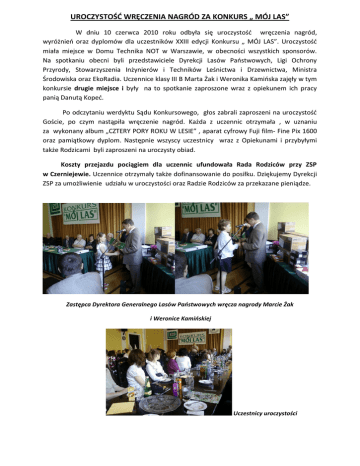 UROCZYSTOŚĆ WRĘCZENIA NAGRÓD ZA KONKURS „ MÓJ LAS” W dniu 10 czerwca 2010 roku odbyła się uroczystośd wręczenia nagród, wyróżnieo oraz dyplomów dla uczestników XXIII edycji Konkursu „ MÓJ LAS”. Uroczystośd miała miejsce w Domu Technika NOT w Warszawie, w obecności wszystkich sponsorów. Na spotkaniu obecni byli przedstawiciele Dyrekcji Lasów Paostwowych, Ligi Ochrony Przyrody, Stowarzyszenia Inżynierów i Techników Leśnictwa i Drzewnictwa, Ministra Środowiska oraz EkoRadia. Uczennice klasy III B Marta Żak i Weronika Kamioska zajęły w tym konkursie drugie miejsce i były na to spotkanie zaproszone wraz z opiekunem ich pracy panią Danutą Koped. Po odczytaniu werdyktu Sądu Konkursowego, głos zabrali zaproszeni na uroczystośd Goście, po czym nastąpiła wręczenie nagród. Każda z uczennic otrzymała , w uznaniu za wykonany album „CZTERY PORY ROKU W LESIE” , aparat cyfrowy Fuji film- Fine Pix 1600 oraz pamiątkowy dyplom. Następnie wszyscy uczestnicy wraz z Opiekunami i przybyłymi także Rodzicami byli zaproszeni na uroczysty obiad. Koszty przejazdu pociągiem dla uczennic ufundowała Rada Rodziców przy ZSP w Czerniejewie. Uczennice otrzymały także dofinansowanie do posiłku. Dziękujemy Dyrekcji ZSP za umożliwienie udziału w uroczystości oraz Radzie Rodziców za przekazane pieniądze. Zastępca Dyrektora Generalnego Lasów Paostwowych wręcza nagrody Marcie Żak i Weronice Kamioskiej Uczestnicy uroczystości