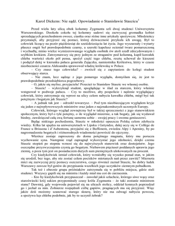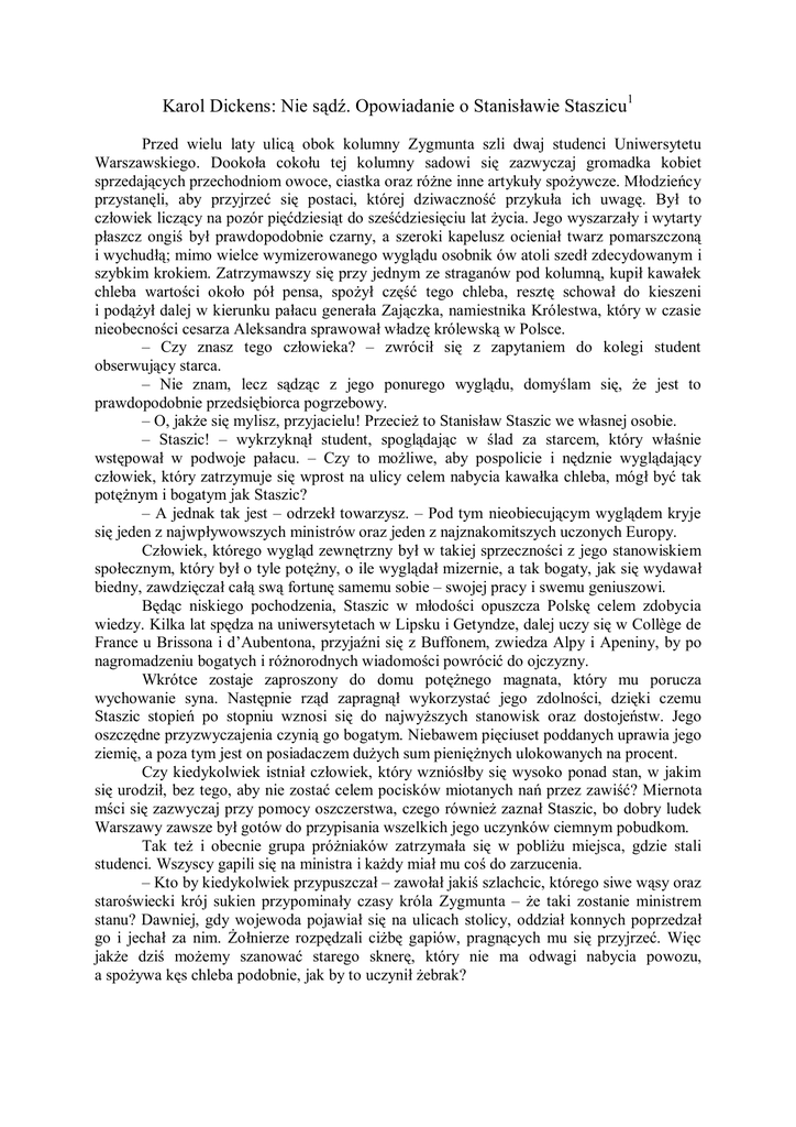 Karol Dickens: Nie sądź. Opowiadanie o Stanisławie Staszicu1 Przed wielu laty ulicą obok kolumny Zygmunta szli dwaj studenci Uniwersytetu Warszawskiego. Dookoła cokołu tej kolumny sadowi się zazwyczaj gromadka kobiet sprzedających przechodniom owoce, ciastka oraz różne inne artykuły spożywcze. Młodzieńcy przystanęli, aby przyjrzeć się postaci, której dziwaczność przykuła ich uwagę. Był to człowiek liczący na pozór pięćdziesiąt do sześćdziesięciu lat życia. Jego wyszarzały i wytarty płaszcz ongiś był prawdopodobnie czarny, a szeroki kapelusz ocieniał twarz pomarszczoną i wychudłą; mimo wielce wymizerowanego wyglądu osobnik ów atoli szedł zdecydowanym i szybkim krokiem. Zatrzymawszy się przy jednym ze straganów pod kolumną, kupił kawałek chleba wartości około pół pensa, spożył część tego chleba, resztę schował do kieszeni i podążył dalej w kierunku pałacu generała Zajączka, namiestnika Królestwa, który w czasie nieobecności cesarza Aleksandra sprawował władzę królewską w Polsce. – Czy znasz tego człowieka? – zwrócił się z zapytaniem do kolegi student obserwujący starca. – Nie znam, lecz sądząc z jego ponurego wyglądu, domyślam się, że jest to prawdopodobnie przedsiębiorca pogrzebowy. – O, jakże się mylisz, przyjacielu! Przecież to Stanisław Staszic we własnej osobie. – Staszic! – wykrzyknął student, spoglądając w ślad za starcem, który właśnie wstępował w podwoje pałacu. – Czy to możliwe, aby pospolicie i nędznie wyglądający człowiek, który zatrzymuje się wprost na ulicy celem nabycia kawałka chleba, mógł być tak potężnym i bogatym jak Staszic? – A jednak tak jest – odrzekł towarzysz. – Pod tym nieobiecującym wyglądem kryje się jeden z najwpływowszych ministrów oraz jeden z najznakomitszych uczonych Europy. Człowiek, którego wygląd zewnętrzny był w takiej sprzeczności z jego stanowiskiem społecznym, który był o tyle potężny, o ile wyglądał mizernie, a tak bogaty, jak się wydawał biedny, zawdzięczał całą swą fortunę samemu sobie – swojej pracy i swemu geniuszowi. Będąc niskiego pochodzenia, Staszic w młodości opuszcza Polskę celem zdobycia wiedzy. Kilka lat spędza na uniwersytetach w Lipsku i Getyndze, dalej uczy się w Collège de France u Brissona i d’Aubentona, przyjaźni się z Buffonem, zwiedza Alpy i Apeniny, by po nagromadzeniu bogatych i różnorodnych wiadomości powrócić do ojczyzny. Wkrótce zostaje zaproszony do domu potężnego magnata, który mu porucza wychowanie syna. Następnie rząd zapragnął wykorzystać jego zdolności, dzięki czemu Staszic stopień po stopniu wznosi się do najwyższych stanowisk oraz dostojeństw. Jego oszczędne przyzwyczajenia czynią go bogatym. Niebawem pięciuset poddanych uprawia jego ziemię, a poza tym jest on posiadaczem dużych sum pieniężnych ulokowanych na procent. Czy kiedykolwiek istniał człowiek, który wzniósłby się wysoko ponad stan, w jakim się urodził, bez tego, aby nie zostać celem pocisków miotanych nań przez zawiść? Miernota mści się zazwyczaj przy pomocy oszczerstwa, czego również zaznał Staszic, bo dobry ludek Warszawy zawsze był gotów do przypisania wszelkich jego uczynków ciemnym pobudkom. Tak też i obecnie grupa próżniaków zatrzymała się w pobliżu miejsca, gdzie stali studenci. Wszyscy gapili się na ministra i każdy miał mu coś do zarzucenia. – Kto by kiedykolwiek przypuszczał – zawołał jakiś szlachcic, którego siwe wąsy oraz staroświecki krój sukien przypominały czasy króla Zygmunta – że taki zostanie ministrem stanu? Dawniej, gdy wojewoda pojawiał się na ulicach stolicy, oddział konnych poprzedzał go i jechał za nim. Żołnierze rozpędzali ciżbę gapiów, pragnących mu się przyjrzeć. Więc jakże dziś możemy szanować starego sknerę, który nie ma odwagi nabycia powozu, a spożywa kęs chleba podobnie, jak by to uczynił żebrak? – A co sądzić o jego sercu – dorzucił ksiądz, występujący z grupki gapiów – które jest tak twarde jak skrzynia żelazna przechowująca jego złoto? Biedak mógłby skonać z głodu pod jego drzwiami, a nie doczekałby się jałmużny. – Zauważyliście, waćpanowie – wtrącił inny osobnik – że jego płaszcz tak wygląda jakby go nosił co najmniej od dziesięciu lat? – Czy wiecie, że ten sknera w obawie, aby nie zniszczyć swoich krzeseł, siada na ziemi? – dodał szyderską uwagę jakiś typ spod ciemnej gwiazdy, co wywołało huragan kpiącego śmiechu. Młody wychowanek jednej z publicznych uczelni przysłuchiwał się ze zgorszonym milczeniem tym uwagom, które raniły jego serce. Wreszcie, nie mogąc już nad sobą zapanować, zwrócił się do księdza i rzekł: – Człowiek, który odznacza się szczodrością, zasługuje na to, aby mówić o nim z większym szacunkiem. Cóż to nas może obchodzić, jak się ubiera lub co spożywa, jeżeli czyni szlachetny użytek ze swego majątku? – Szlachetny użytek? Nic mi o tym nie wiadomo. – A cóż to było z Akademią Nauk, która potrzebowała pomieszczenia na bibliotekę, a nie miała funduszów na wynajęcie takiego pomieszczenia? Któż obdarzył ją wspaniałym pałacem, jeśli nie Staszic? – To prawda, ale uczynił to dlatego, ponieważ jest równie żądny pochwał jak złota. – A czy to nie Polska czci jako swą największą chwałę pamięć męża, który odkrył prawa ruchu gwiazd? I kto był tym, który wzniósł mu pomnik godny jego sławy, wzywając dłuta Canovy2 celem uczczenia pamięci Kopernika? – Wiadomo, że to Staszic – odparł ksiądz. Toteż cała Europa czci za to hojnego senatora. Ale, młodzi przyjaciele, miłosierdzie chrześcijańskie nie powinno być oświetlane blaskiem południowego słońca. Jeśli istotnie pragniecie poznać człowieka, obserwujcie tok jego dnia w życiu prywatnym. Otóż w książkach, które ów biedak wydaje, napotkacie b