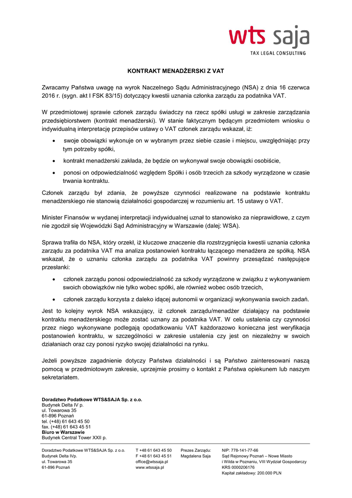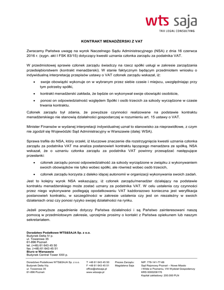 KONTRAKT MENADŻERSKI Z VAT Zwracamy Państwa uwagę na wyrok Naczelnego Sądu Administracyjnego (NSA) z dnia 16 czerwca 2016 r. (sygn. akt I FSK 83/15) dotyczący kwestii uznania członka zarządu za podatnika VAT. W przedmiotowej sprawie członek zarządu świadczy na rzecz spółki usługi w zakresie zarządzania przedsiębiorstwem (kontrakt menadżerski). W stanie faktycznym będącym przedmiotem wniosku o indywidualną interpretację przepisów ustawy o VAT członek zarządu wskazał, iż: swoje obowiązki wykonuje on w wybranym przez siebie czasie i miejscu, uwzględniając przy tym potrzeby spółki, kontrakt menadżerski zakłada, że będzie on wykonywał swoje obowiązki osobiście, ponosi on odpowiedzialność względem Spółki i osób trzecich za szkody wyrządzone w czasie trwania kontraktu. Członek zarządu był zdania, że powyższe czynności realizowane na podstawie kontraktu menadżerskiego nie stanowią działalności gospodarczej w rozumieniu art. 15 ustawy o VAT. Minister Finansów w wydanej interpretacji indywidualnej uznał to stanowisko za nieprawidłowe, z czym nie zgodził się Wojewódzki Sąd Administracyjny w Warszawie (dalej: WSA). Sprawa trafiła do NSA, który orzekł, iż kluczowe znaczenie dla rozstrzygnięcia kwestii uznania członka zarządu za podatnika VAT ma analiza postanowień kontraktu łączącego menadżera ze spółką. NSA wskazał, że o uznaniu członka zarządu za podatnika VAT powinny przesądzać następujące przesłanki: członek zarządu ponosi odpowiedzialność za szkody wyrządzone w związku z wykonywaniem swoich obowiązków nie tylko wobec spółki, ale również wobec osób trzecich, członek zarządu korzysta z daleko idącej autonomii w organizacji wykonywania swoich zadań. Jest to kolejny wyrok NSA wskazujący, iż członek zarządu/menadżer działający na podstawie kontraktu menadżerskiego może zostać uznany za podatnika VAT. W celu ustalenia czy czynności przez niego wykonywane podlegają opodatkowaniu VAT każdorazowo konieczna jest weryfikacja postanowień kontraktu, w szczególności w zakresie ustalenia czy jest on niezależny w swoich działaniach oraz czy ponosi ryzyko swojej działalności na rynku. Jeżeli powyższe zagadnienie dotyczy Państwa działalności i są Państwo zainteresowani naszą pomocą w przedmiotowym zakresie, uprzejmie prosimy o kontakt z Państwa opiekunem lub naszym sekretariatem. Doradztwo Podatkowe WTS&SAJA Sp. z o.o. Budynek Delta IV p. ul. Towarowa 35 61-896 Poznań tel. (+48) 61 643 45 50 fax. (+48) 61 643 45 51 Biuro w Warszawie Budynek Central Tower XXII p. Doradztwo Podatkowe WTS&SAJA Sp. z o.o. Budynek Delta IVp. ul. Towarowa 35 61-896 Poznań T +48 61 643 45 50 F +48 61 643 45 51 [email protected] www.wtssaja.pl Prezes Zarządu: Magdalena Saja NIP: 778-141-77-66 Sąd Rejonowy Poznań – Nowe Miasto i Wilda w Poznaniu, VIII Wydział Gospodarczy KRS 0000206176 Kapitał zakładowy: 200.000 PLN Al. Jerozolimskie 81 02-001 Warszawa Powyższy Newsletter stanowi informację o charakterze ogólnym, jego celem jest dostarczenie Państwu na bieżąco informacji o zmianach w prawie podatkowym, interpretacjach organów podatkowych, rozwoju linii orzeczniczej oraz ciekawych komentarzach. Doradztwo Podatkowe WTS&SAJA nie ponosi prawnej odpowiedzialności za żadne działania lub zaniechania podjęte w wyniku powyższych informacji. Doradztwo Podatkowe WTS&SAJA Sp. z o.o. Budynek Delta IVp. ul. Towarowa 35 61-896 Poznań T +48 61 643 45 50 F +48 61 643 45 51 [email protected] www.wtssaja.pl Prezes Zarządu: Magdalena Saja NIP: 778-141-77-66 Sąd Rejonowy Poznań – Nowe Miasto i Wilda w Poznaniu, VIII Wydział Gospodarczy KRS 0000206176 Kapitał zakładowy: 200.000 PLN