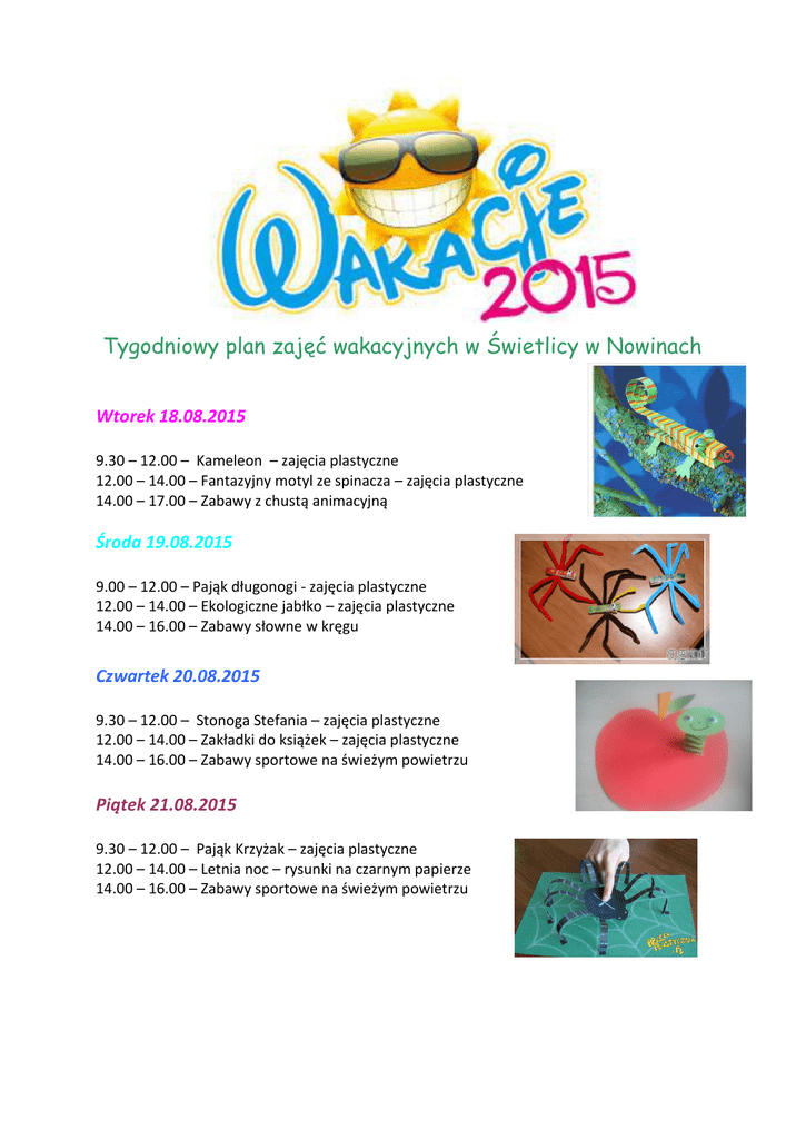 Tygodniowy plan zajęć wakacyjnych w Świetlicy w Nowinach Wtorek 18.08.2015 9.30 – 12.00 – Kameleon – zajęcia plastyczne 12.00 – 14.00 – Fantazyjny motyl ze spinacza – zajęcia plastyczne 14.00 – 17.00 – Zabawy z chustą animacyjną Środa 19.08.2015 9.00 – 12.00 – Pająk długonogi - zajęcia plastyczne 12.00 – 14.00 – Ekologiczne jabłko – zajęcia plastyczne 14.00 – 16.00 – Zabawy słowne w kręgu Czwartek 20.08.2015 9.30 – 12.00 – Stonoga Stefania – zajęcia plastyczne 12.00 – 14.00 – Zakładki do książek – zajęcia plastyczne 14.00 – 16.00 – Zabawy sportowe na świeżym powietrzu Piątek 21.08.2015 9.30 – 12.00 – Pająk Krzyżak – zajęcia plastyczne 12.00 – 14.00 – Letnia noc – rysunki na czarnym papierze 14.00 – 16.00 – Zabawy sportowe na świeżym powietrzu