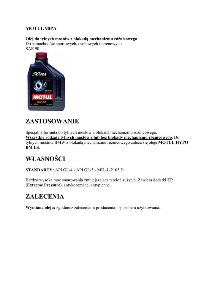 MOTUL 90PA Olej do tylnych mostów z blokadą mechanizmu różnicowego Do samochodów sportowych, osobowych i terenowych SAE 90 ZASTOSOWANIE Specjalna formuła do tylnych mostów z blokadą mechanizmu różnicowego. Wszystkie rodzaje tylnych mostów z lub bez blokady mechanizmu różnicowego. Do tylnych mostów BMW z blokadą mechanizmu różnicowego zaleca się oleje MOTUL HYPO BM LS. WŁASNOŚCI STANDARTY: API GL-4 - API GL-5 - MIL-L-2105 D Bardzo wysoka moc smarowania zmniejszająca tarcie i zużycie. Zawiera dodatki EP (Extreme Pressure), antykorozyjne, antypienne. ZALECENIA Wymiana oleju: zgodnie z zaleceniami producenta i sposobem użytkowania. MOTUL GEARBOX 80W-90 Olej do skrzyń biegów i tylnych mostów Wzmocniony dwusiarczkiem molibdenu SAE 80W-90 ZASTOSOWANIE Szczególnie polecany w "głośnych" skrzyniach biegów. Do wszystkich skrzyń biegów i hipoidalnych tylnych mostów bez blokady mechanizmu różnicowego. W skrzyniach biegów i tylnych mostach z blokadą mechanizmu różnicowego zaleca się stosowanie MOTUL 90 PA. W automatycznych skrzyniach biegów, zaleca się stosowanie MOTUL DEXRON III. Spełnia wymagania producentów SAE 80W do 90. WŁASNOŚCI STANDARTY: API GL-4 - API GL-5 - MIL-L-2105 D - ZF TE-ML 01/05/07/08 Bardzo wysoka moc smarowania zmniejszająca tarcie i zużycie. Dwusiarczek molibdenu zapewnia bardzo dużą odporność w trudnych warunkach użytkowania. Stabilność filmu w wysokich temperaturach. Zawiera dodatki EP (Extreme Pressure), antykorozyjne, antypienne. ZALECENIA Wymiana oleju: zgodnie z zaleceniami producenta i sposobem użytkowania. MOTUL HD 75W-80W, 80W-90, 85W-140 Olej do skrzyń biegów i tylnych mostów SAE 75W-80W, 80W-90, 85W-140 ZASTOSOWANIE Wszystkie skrzynie biegów, oraz przekładnie główne. Trzy rodzaje lepkości: SAE 75W-80W, 80W90, 85W140. MOTUL HD 75W80W jest odpowiedni do manualnych skrzyń biegów PEUGEOT/CITROEN. WŁASNOŚCI STANDARTY: API GL-4 - API GL-5 - MIL-L-2105 D Bardzo dobre smarowanie redukuje tarcie, a tym samym zużycie przekładni. Wytrzymuje ekstremalne warunki. Zawiera dodatki EP (Extreme Pressure), antykorozyjne, antypienne. ZALECENIA Wymiana oleju: zgodnie z zaleceniami producenta i sposobem użytkowania. MOTUL TRANS MB 85W-90 Olej do skrzyń biegów, mechanizmów różnicowych i skrzyń redukcyjnych SAE 85W-90 ZASTOSOWANIE Specjalnie zaprojektowany do osi samochodów ciężarowych: MERCEDES BENZ, MAN lub ZF (hypoidalne mechanizmy różnicowe, przekładnie walcowe lub skośne, reduktory, przekładnie planetarne, przekładnie z oddzielnym system hydrostatycznym). Do wszystkich przekładni mechanicznych, skrzyń biegów zsynchronizowanych lub nie, do skrzyń biegów/mechanizmów różnicowych, przekładni pośrednich, i hypoidalnych mechanizmów różnicowych bez blokady mechanizmu różnicowego, pracujących w ciężkich warunkach wstrząsów, pod ciężkimi ładunkami i przy niskich prędkościach obrotowych lub w pod średnim obciążeniem przy wysokich prędkościach obrotowych. WŁASNOŚCI STANDARTY: API GL-5 APROBATY: MERCEDES BENZ page 235.0, MAN 342N, ZF TE-ML 05A/07A/16C/17B Olej wytrzymujący wysokie ciśnienia, zapewniający skuteczną ochronę przeciw ścieraniu. Utrzymuje lepkość 90 po 20 godzinach testów na ścieranie czego wymaga standard SAE J 306, Lipiec 1998. Bardzo wysoka moc smarowania zmniejszająca tarcie i zużycie. Lepkość 90 w wysokich temperaturach zapewnia doskonałą odporność filmu olejowego i/lub ogranicza hałas z przekładni. Odpowiedni do wszelkiego rodzaju uszczelnień. Zawiera dodatki antykorozyjne i antypienne. ZALECENIA Wymiana oleju: zgodnie z zaleceniami producenta i sposobem użytkowania. MOTUL GEAR MB 80W Olej do skrzyń biegów EXTREME PRESSURE SAE 80W ZASTOSOWANIE Specjalnie zaprojektowany do skrzyń biegów samochodów ciężarowych i osobowych: Mercedes Benz, MAN lub ZF bez Intrader (Ecolite, Ecomid, Ecosplit, Astronic 1 & 2). Do wszystkich skrzyń biegów, skrzyń biegów/mechanizmów różnicowych i hipoidalnych mechanizmów różnicowych bez blokady, pracujących w średnich obciążeniach i prędkościach obrotowych, lub do mechanicznych transmisji bez przekładni hipoidalnych, skrzyń redukcyjnych działających w warunkach średnich do ciężkich obciążeń i prędkości obrotowych. WŁASNOŚCI STANDARTY: API GL-4 APROBATY: MERCEDES BENZ Page 235.1, MAN 341N, ZF TE-MIL 02A/17A Olej przekładniowy z dodatkami EXTREME PRESSURE, które skutecznie chronią przed ścieraniem. Bardzo duża moc smarowania. Doskonale nadaje się do każdego typu uszczelnień. Dodatki antykorozyjne, antypienne. ZALECENIA Wymiana oleju: zgodnie z zaleceniami producenta i sposobem użytkowania.