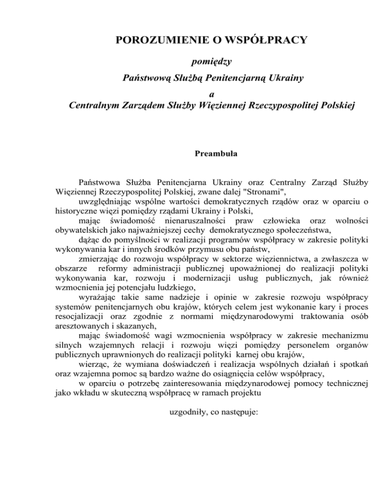 POROZUMIENIE O WSPÓŁPRACY pomiędzy Państwową Służbą Penitencjarną Ukrainy a Centralnym Zarządem Służby Więziennej Rzeczypospolitej Polskiej Preambuła Państwowa Służba Penitencjarna Ukrainy oraz Centralny Zarząd Służby Więziennej Rzeczypospolitej Polskiej, zwane dalej "Stronami", uwzględniając wspólne wartości demokratycznych rządów oraz w oparciu o historyczne więzi pomiędzy rządami Ukrainy i Polski, mając świadomość nienaruszalności praw człowieka oraz wolności obywatelskich jako najważniejszej cechy demokratycznego społeczeństwa, dążąc do pomyślności w realizacji programów współpracy w zakresie polityki wykonywania kar i innych środków przymusu obu państw, zmierzając do rozwoju współpracy w sektorze więziennictwa, a zwłaszcza w obszarze reformy administracji publicznej upoważnionej do realizacji polityki wykonywania kar, rozwoju i modernizacji usług publicznych, jak również wzmocnienia jej potencjału ludzkiego, wyrażając takie same nadzieje i opinie w zakresie rozwoju współpracy systemów penitencjarnych obu krajów, których celem jest wykonanie kary i proces resocjalizacji oraz zgodnie z normami międzynarodowymi traktowania osób aresztowanych i skazanych, mając świadomość wagi wzmocnienia współpracy w zakresie mechanizmu silnych wzajemnych relacji i rozwoju więzi pomiędzy personelem organów publicznych uprawnionych do realizacji polityki karnej obu krajów, wierząc, że wymiana doświadczeń i realizacja wspólnych działań i spotkań oraz wzajemna pomoc są bardzo ważne do osiągnięcia celów współpracy, w oparciu o potrzebę zainteresowania międzynarodowej pomocy technicznej jako wkładu w skuteczną współpracę w ramach projektu uzgodniły, co następuje: 2 Artykuł 1. Zasady współpracy Niniejsze Porozumienie określa obszary współpracy Stron i ma na celu wspieranie, rozszerzanie i pogłębianie dynamicznych relacji zawodowych stworzonych już pomiędzy Stronami, jak również rozwój wymiany doświadczeń pomiędzy funkcjonariuszami krajów Stron. Współpraca w ramach niniejszego Porozumienia odbywać się będzie zgodnie z prawodawstwem obu państw, prawem międzynarodowym, a także bez uszczerbku dla wykonania zobowiązań wynikających z innych porozumień, uczestnikami których są obie strony porozumienia. Współpraca jest realizowana na szczeblu centralnych i regionalnych organów kierowania służbami więziennymi obu krajów, jak również bezpośrednio na poziomie podstawowych instytucji i jednostek penitencjarnych. Strony mogą zawierać inne umowy i porozumienia, niezbędne dla realizacji poszczególnych rodzajów działalności związanej z wypełnianiem postanowień niniejszego Porozumienia o współpracy. Artykuł 2. Obszary współpracy Współpraca w ramach niniejszego Рorozumienia dotyczyć będzie: 1) wymiany doświadczeń pomiędzy stronami w następujących obszarach: - promowanie mechanizmów dotyczących realizacji polityki państwowej w sferze wykonywania kar pozbawienia wolności i wykonywania tymczasowego aresztowania; - poprawa funkcjonowania instytucji penitencjarnych; - poprawa w zakresie prawa i porządku, systemów ochrony i zabezpieczenia jednostek penitencjarnych, w tym wyposażania ich w nowoczesne urządzenia elektroniczne; - zagwarantowanie porządku i właściwych warunków przetrzymywania osadzonych w jednostkach penitencjarnych, przestrzegania standardów europejskich w tym zakresie; - wprowadzenie nowych form społecznego, edukacyjnego i psychologicznego wpływu na osadzonych; - rozwój systemu edukacji osadzonych; - organizacji opieki medycznej dla osób aresztowanych i skazanych, poprawy zdrowia psychicznego osadzonych oraz pracy z osobami uzależnionymi od narkotyków i alkoholu; - organizacji działań ekonomicznych jednostek penitencjarnych; - rozwój dobrych relacji pomiędzy jednostkami penitencjarnymi a instytucjami zewnętrznymi oraz wzmocnienie kontaktów ze środkami masowego przekazu poprzez przekazywanie dokładnych i szczegółowych informacji na temat działalności Stron w celu stworzenia obiektywnej opinii publicznej dotyczącej wykonywania kar pozbawienia wolności; 2) wymiana informacji naukowych i technicznych; 3 3) prowadzenie wspólnych badań związanych z problemami jednostek penitencjarnych Ukrainy i Polski; 4) opracowanie i wspólne uczestniczenie w programach finansowanych przez Unię Europejską; 5) ulepszenie systemu szkolenia oraz podniesienie kwalifikacji kadry w zakresie wykonywania kar pozbawienia wolności i tymczasowego aresztowania zgodnie z normami prawa międzynarodowego, co związane jest z kwestiami traktowania osób skazanych; 6) inne obszary współpracy określone przez Strony porozumienia w formie pisemnej. Artykuł 3. Formy współpracy Współpraca realizowana będzie poprzez: - organizowanie i prowadzenie seminariów oraz spotkań roboczych, których celem jest prezentacja i wymiana doświadczeń pomiędzy Stronami, - wizyty studyjne, które umożliwiają Stronom rozwiązanie praktycznych problemów i rozstrzygnięcie kwestii związanych z ich działaniami oraz praktyczne zapoznanie ze zdobytym doświadczeniem, organizowanie staży; - prowadzenie wspólnych badań w zakresie polityki państwowej związanej z wykonywaniem kary pozbawienia wolności i tymczasowego aresztowania; - zapewnienie ekspertów w roli doradców w celu stworzenia projektów aktów ustawodawczych oraz praktycznej prezentacji zdobytego doświadczenia; wymiana informacji, dokumentów i odpowiednich materiałów związanych z ustawodawstwem Stron oraz przygotowanie publikacji zgodnie z obszarami współpracy określonymi w niniejszym Porozumieniu; inne formy współpracy określone przez Strony w formie pisemnej. Artykuł 4. Współpraca w zakresie organizacji Mistrzostw Europy w Piłce Nożnej EURO 2012 W związku z organizacją Mistrzostw Europy w Piłce Nożnej EURO 2012 zostaje stworzona wspólna polsko-ukraińska grupa robocza (zwan