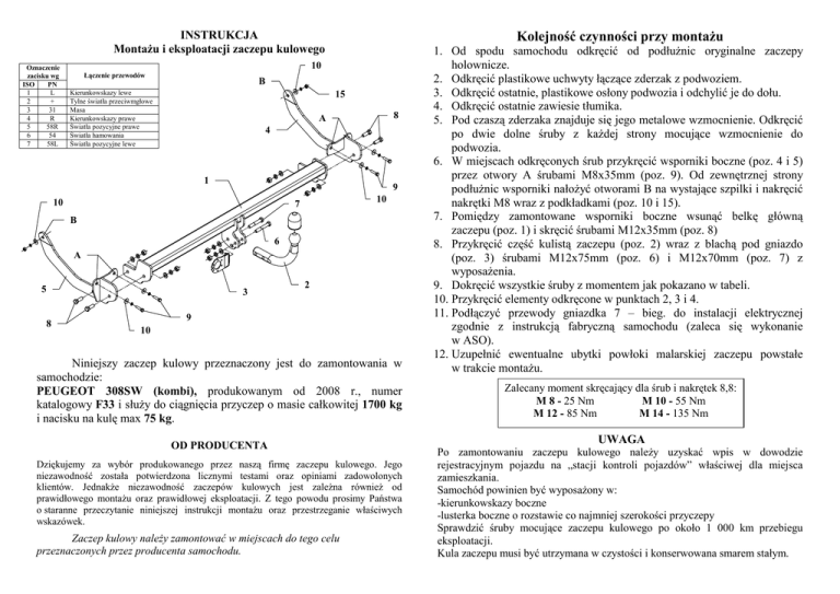 INSTRUKCJA MontaŜu i eksploatacji zaczepu kulowego Oznaczenie zacisku wg ISO PN 1 L 2 + 3 31 4 R 5 58R 6 54 7 58L Kolejność czynności przy montaŜu 10 Łączenie przewodów B Kierunkowskazy lewe Tylne światła przeciwmgłowe Masa Kierunkowskazy prawe Światła pozycyjne prawe Światła hamowania Światła pozycyjne lewe 15 8 A 4 1 9 10 10 7 B 6 A 5 8 3 2 9 10 Niniejszy zaczep kulowy przeznaczony jest do zamontowania w samochodzie: PEUGEOT 308SW (kombi), produkowanym od 2008 r., numer katalogowy F33 i słuŜy do ciągnięcia przyczep o masie całkowitej 1700 kg i nacisku na kulę max 75 kg. OD PRODUCENTA Dziękujemy za wybór produkowanego przez naszą firmę zaczepu kulowego. Jego niezawodność została potwierdzona licznymi testami oraz opiniami zadowolonych klientów. JednakŜe niezawodność zaczepów kulowych jest zaleŜna równieŜ od prawidłowego montaŜu oraz prawidłowej eksploatacji. Z tego powodu prosimy Państwa o staranne przeczytanie niniejszej instrukcji montaŜu oraz przestrzeganie właściwych wskazówek. Zaczep kulowy naleŜy zamontować w miejscach do tego celu przeznaczonych przez producenta samochodu. 1. Od spodu samochodu odkręcić od podłuŜnic oryginalne zaczepy holownicze. 2. Odkręcić plastikowe uchwyty łączące zderzak z podwoziem. 3. Odkręcić ostatnie, plastikowe osłony podwozia i odchylić je do dołu. 4. Odkręcić ostatnie zawiesie tłumika. 5. Pod czaszą zderzaka znajduje się jego metalowe wzmocnienie. Odkręcić po dwie dolne śruby z kaŜdej strony mocujące wzmocnienie do podwozia. 6. W miejscach odkręconych śrub przykręcić wsporniki boczne (poz. 4 i 5) przez otwory A śrubami M8x35mm (poz. 9). Od zewnętrznej strony podłuŜnic wsporniki nałoŜyć otworami B na wystające szpilki i nakręcić nakrętki M8 wraz z podkładkami (poz. 10 i 15). 7. Pomiędzy zamontowane wsporniki boczne wsunąć belkę główną zaczepu (poz. 1) i skręcić śrubami M12x35mm (poz. 8) 8. Przykręcić część kulistą zaczepu (poz. 2) wraz z blachą pod gniazdo (poz. 3) śrubami M12x75mm (poz. 6) i M12x70mm (poz. 7) z wyposaŜenia. 9. Dokręcić wszystkie śruby z momentem jak pokazano w tabeli. 10. Przykręcić elementy odkręcone w punktach 2, 3 i 4. 11. Podłączyć przewody gniazdka 7 – bieg. do instalacji elektrycznej zgodnie z instrukcją fabryczną samochodu (zaleca się wykonanie w ASO). 12. Uzupełnić ewentualne ubytki powłoki malarskiej zaczepu powstałe w trakcie montaŜu. Zalecany moment skręcający dla śrub i nakrętek 8,8: M 8 - 25 Nm M 10 - 55 Nm M 12 - 85 Nm M 14 - 135 Nm UWAGA Po zamontowaniu zaczepu kulowego naleŜy uzyskać wpis w dowodzie rejestracyjnym pojazdu na „stacji kontroli pojazdów” właściwej dla miejsca zamieszkania. Samochód powinien być wyposaŜony w: -kierunkowskazy boczne -lusterka boczne o rozstawie co najmniej szerokości przyczepy Sprawdzić śruby mocujące zaczepu kulowego po około 1 000 km przebiegu eksploatacji. Kula zaczepu musi być utrzymana w czystości i konserwowana smarem stałym. PPUH AUTO-HAK S.J. WyposaŜenie zaczepu kulowego: Produkcja Zaczepów Kulowych Henryk & Zbigniew Nejman 76-200 SŁUPSK ul. Słoneczna 16K tel./fax. (059) 8-414-414; 8-414-413 E-mail: [email protected] www. autohak.com.pl Zaczep kulowy bez wyposaŜenia elektrycznego F33 Klasa: A50-X Nr kat. Przeznaczony do zamontowania w samochodzie: Producent: PEUGEOT Model: 308 Typ: SW (kombi) produkowanym od 2008 r. Dane techniczne: wartość siły D: 9,6 kN maksymalna masa przyczepy: 1700 kg maksymalny nacisk na kulę: 75 kg Numer homologacji zgodnie z Dyrektywą 94/20/WE: e20*94/20*0536*00 KARTA GWARANCYJNA Producent udziela gwarancji niniejszą kartą gwarancyjną na okres 24 miesięcy licząc od dnia zakupu zaczepu kulowego do samochodu: PEUGEOT 308SW (kombi) produkowanego od 2008 r. Data produkcji .............................. Data zakupu............................................. Zakres gwarancji obejmuje wyłącznie wady jakościowe wynikające z winy producenta. Gwarancja nie obejmuje natomiast uszkodzeń zawinionych przez nabywcę, wynikających z niewłaściwego montaŜu, uŜytkowania lub konserwacji, uszkodzeń mechanicznych, normalnego zuŜycia podczas eksploatacji itp. Gwarancja udzielona na zakupiony towar nie wyłącza, nie ogranicza ani nie zawiesza uprawnień kupującego wynikających z niezgodności towaru z umową. Reklamacje naleŜy zgłaszać w punkcie sprzedaŜy, składając jednocześnie kartę gwarancyjną. Usunięcie "wady" następuje po stwierdzeniu przez punkt sprzedaŜy wspólnie z producentem słuszności złoŜonej reklamacji. Reklamacja powinna być załatwiona w ciągu 14 dni od dnia uznania reklamacji. Karta gwarancyjna jest niewaŜna, jeŜeli nie jest wypełniona i podpisana. Data zgłoszenia reklamacji: ................................................................... INFORMACJA WSTĘPNA Niniejszy zaczep kulowy jest skonstruowany zgodnie z zasadami bezpieczeństwa ruchu drogowego. Zaczep kulowy jest elementem wpływającym na bezpieczeństwo jazdy i moŜe zostać zainstalowany wyłącznie przez personel wyspecjalizowany. Niedopuszczalne jest dokonywanie jakichkolwiek zmian w konstrukcji zaczepu. Powoduje to wygaśniecie dopuszczenia do stosowania. W przypadku obecności masy izolacyjnej lub osłony podwozia w miejscu przylegania zaczepu, naleŜy ją usunąć. Nieosłonięte miejsca karoserii oraz wywiercone otwory naleŜy pomalować farbą antykorozyjną. Informacjami wiąŜącymi odnośnie wartości obciąŜeń są dane podawane przez producenta samochodu, względnie wartości maksymalnej masy przyczepy oraz maksymalnego nacisku na kulę, przy czym wartości parametrów zaczepu kulowego nie mogą być przekroczone. Wzór do obliczania wartości siły D: Maks. masa przyczepy [kg] x Maks. masa samochodu [kg] Maks. masa przyczepy [kg] + Maks. masa samochodu [kg] X 9,81 = 1000 D [kN]