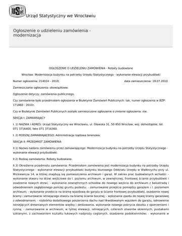 Urząd Statystyczny we Wrocławiu Ogłoszenie o udzieleniu zamówienia modernizacja OGŁOSZENIE O UDZIELENIU ZAMÓWIENIA - Roboty budowlane Wrocław: Modernizacja budynku na potrzeby Urzędu Statystycznego - wykonanie elewacji przybudówki Numer ogłoszenia: 214024 - 2010; data zamieszczenia: 19.07.2010 Zamieszczanie ogłoszenia: obowiązkowe. Ogłoszenie dotyczy: zamówienia publicznego. Czy zamówienie było przedmiotem ogłoszenia w Biuletynie Zamówień Publicznych: tak, numer ogłoszenia w BZP: 171860 - 2010r. Czy w Biuletynie Zamówień Publicznych zostało zamieszczone ogłoszenie o zmianie ogłoszenia: nie. SEKCJA I: ZAMAWIAJĄCY I. 1) NAZWA I ADRES: Urząd Statystyczny we Wrocławiu, ul. Oławska 31, 50-950 Wrocław, woj. dolnośląskie, tel. 071 3716400, faks 071 3716360. I. 2) RODZAJ ZAMAWIAJĄCEGO: Administracja rządowa terenowa. SEKCJA II: PRZEDMIOT ZAMÓWIENIA II.1) Nazwa nadana zamówieniu przez zamawiającego: Modernizacja budynku na potrzeby Urzędu Statystycznego wykonanie elewacji przybudówki. II.2) Rodzaj zamówienia: Roboty budowlane. II.3) Określenie przedmiotu zamówienia: Przedmiotem zamówienia jest modernizacja budynku na potrzeby Urzędu Statystycznego - wykonanie elewacji przybudówki budynku biurowego Oddziału Urzędu w Wałbrzychu przy ul. Mickiewicza 14, w której znajdują się pomieszczenia archiwum i garaż. W zakres prac budowlanych wchodzi: wykonanie otworu na drzwi wejściowe do I. poziomu archiwum, w zewnętrznej, frontowej ścianie przybudówki i osadzenie nowych drzwi; - wykonanie zewnętrznych schodów do nowego wejścia do archiwum z balustradą i odwodnieniem zagłębionego poniżej gruntu podestu; - zamurowanie przejścia pomiędzy garażem i I. poziomem archiwum; - wykonanie przebicia na bramę wjazdową do garażu w ścianie frontowej przybudówki, osadzenie nowej bramy i zamurowanie istniejącego otworu na bramę ścianie bocznej; - wykonanie zjazdu do nowej bramy garażowej z odwodnieniem; - rozbiórka dodatkowego poszerzenia dachu nad likwidowanym wjazdem do garażu, odnowienie istniejących drewnianych elementów więźby i deskowania, wykonanie nowego pokrycia daszku z opierzeniami i rynną; - zamurowanie w archiwum, w tylnej elewacji, istniejących, czterech otworów okiennych, pustakami szklanymi, z zachowaniem kształtu łukowych nadproży ceglanych, osadzenie podokienników; - wykonanie w elewacji frontowej II. poziomu archiwum dwóch otworów okiennych w miejscu jednego większego; - ocieplenie ścian zewnętrznych przybudówki styropianem gr. 10 cm., osadzenie listew ozdobnych i wykonanie tynku pomalowanego zgodnie z kolorystyką; - naprawa pokrycia dachu nad pomieszczeniami archiwum i wykonanie obróbek blacharskich na poszerzonych ścianach; - wykonanie opaski odwadniającej wokół budynku przybudówki; wymiana złączy naprężających instalacji odgromowych na dachu; - wymiana przewodów instalacji uziemiającej i odgromowej; - wymiana rynien dachowych; - wymiana rur spustowych.. II.4) Wspólny Słownik Zamówień (CPV): 45.00.00.00-7, 45.40.00.00-1, 45.45.30.00-7, 45.26.21.00-2, 45.44.30.00-4, 45.42.10.00-4, 45.26.19.10-6, 45.26.25.21-9, 45.26.13.20-3, 45.44.21.10-1, 45.11.12.20-6, 45.26.21.10-5. SEKCJA III: PROCEDURA III.1) TRYB UDZIELENIA ZAMÓWIENIA: Przetarg nieograniczony III.2) INFORMACJE ADMINISTRACYJNE Zamówienie dotyczy projektu/programu finansowanego ze środków Unii Europejskiej: nie SEKCJA IV: UDZIELENIE ZAMÓWIENIA IV.1) DATA UDZIELENIA ZAMÓWIENIA: 19.07.2010. IV.2) LICZBA OTRZYMANYCH OFERT: 2. IV.3) LICZBA ODRZUCONYCH OFERT: 0. IV.4) NAZWA I ADRES WYKONAWCY, KTÓREMU UDZIELONO ZAMÓWIENIA: Przedsiębiorstwo Wielobranżowe IRKBUD, Ireneusz Bagdziński, ul. Górna 21/1, 58-310 Szczawno Zdrój, kraj/woj. dolnośląskie. IV.5) Szacunkowa wartość zamówienia (bez VAT): 79953,14 PLN. IV.6) INFORMACJA O CENIE WYBRANEJ OFERTY ORAZ O OFERTACH Z NAJNIŻSZĄ I NAJWYŻSZĄ CENĄ Cena wybranej oferty: 91753,16 Oferta z najniższą ceną: 91753,16 / Oferta z najwyższą ceną: 119993,10 Waluta: PLN. DYREKTOR URZĘDU STATYSTYCZNEGO we Wrocławiu /-/ dr Małgorzata Wojtkowiak-Jakacka
