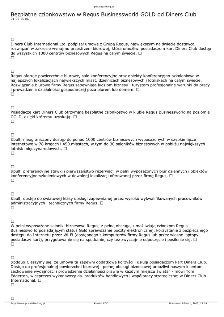 privatebanking.pl Bezpłatne członkowstwo w Regus Businessworld GOLD od Diners Club 01.02.2010. Diners Club International Ltd. podpisał umowę z Grupą Regus, największym na świecie dostawcą rozwiązań w zakresie wynajmu przestrzeni biurowej, która umożliwi posiadaczom kart Diners Club dostęp do wszystkich 1000 centrów biznesowych Regus na całym świecie. Regus oferuje powierzchnie biurowe, sale konferencyjne oraz obiekty konferencyjno-szkoleniowe w najlepszych lokalizacjach największych miast, dzielnicach biznesowych i lotniskach na całym świecie. Rozwiązania biurowe firmy Regus zapewniają ludziom biznesu i turystom profesjonalne warunki do pracy i prowadzenia działalności gospodarczej poza biurem lub domem. Posiadacze kart Diners Club otrzymają bezpłatne członkostwo w klubie Regus Businessworld na poziomie GOLD, dzięki któremu uzyskają: • nieograniczony dostęp do ponad 1000 centrów biznesowych wyposażonych w szybkie łącze internetowe w 78 krajach i 450 miastach, w tym do 30 saloników biznesowych w pobliżu największych lotnisk międzynarodowych, • preferencyjne stawki i pierwszeństwo rezerwacji w pełni wyposażonych biur dziennych i obiektów konferencyjno-szkoleniowych w dowolnej lokalizacji oferowanej przez firmę Regus, • dostęp do światowej klasy obsługi zapewnianej przez wysoko wykwalifikowanych pracowników administracyjnych i technicznych firmy Regus. W pełni wyposażone saloniki biznesowe Regus, z pełną obsługą, umożliwiają członkom Regus Businessworld posiadającym status Gold sprawdzanie poczty elektronicznej, korzystanie z bezpiecznego dostępu do Internetu przez Wi-Fi (dostępnego z komputerów firmy Regus lub przez własne laptopy posiadaczy kart), przygotowanie się na spotkanie, czy też zwyczajnie odpoczęcie i posilenie się. „Cieszymy się, że umowa ta zapewni dodatkowe korzyści i usługi posiadaczom kart Diners Club. Dostęp do profesjonalnej powierzchni biurowej i pełnej obsługi biznesowej umożliwi naszym klientom zachowanie wydajności i prowadzenie działalności prawie w każdym miejscu świata" - mówi Tom Edgerton, wiceprezes wykonawczy ds. produktów handlowych i współpracy strategicznej w Diners Club International. http://www.privatebanking.pl Kreator PDF Utworzono 8 March, 2017, 13:19 privatebanking.pl „Cieszymy się, że będziemy wspólnie z Diners Club International realizować ten wspaniały projekt, dzięki któremu firma Regus będzie mogła zapewnić posiadaczom kart możliwość efektywnej pracy w dowolnym miejscu i czasie oraz w dowolny sposób podczas podróży po całym świecie” – mówi Paulo Dias, Dyrektor Generalny firmy Regus na region EMEA. źródło: Diners Club http://www.privatebanking.pl Kreator PDF Utworzono 8 March, 2017, 13:19