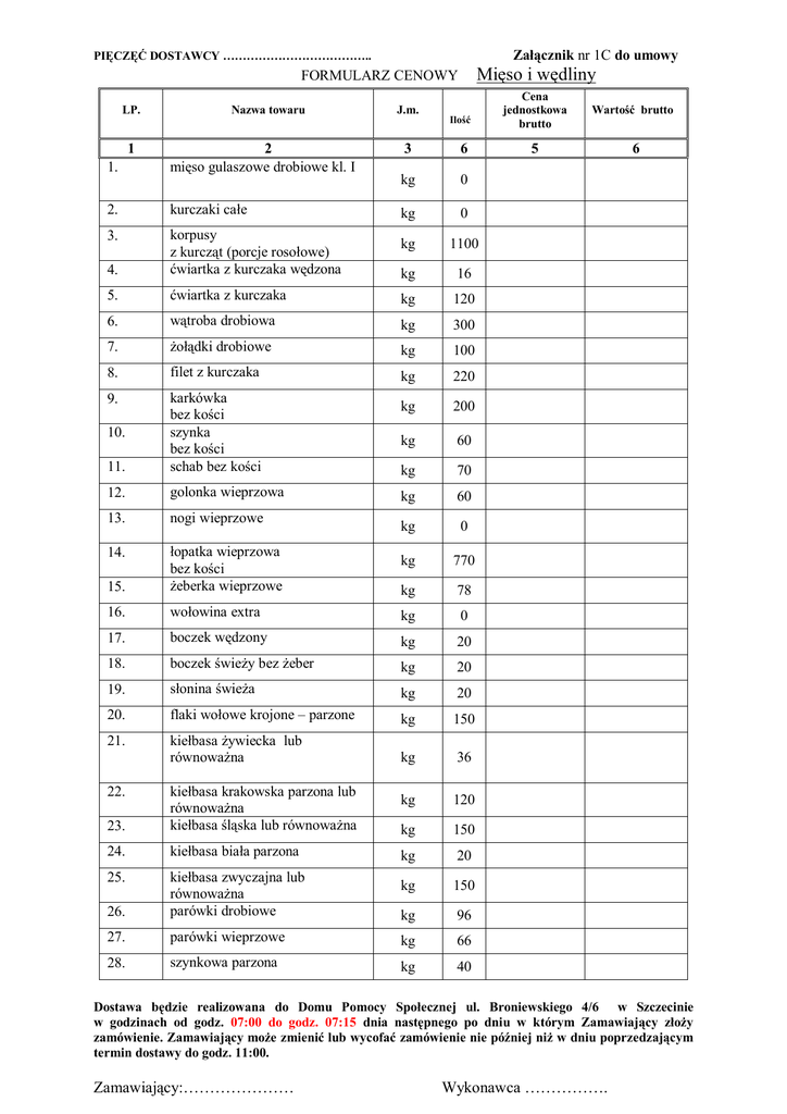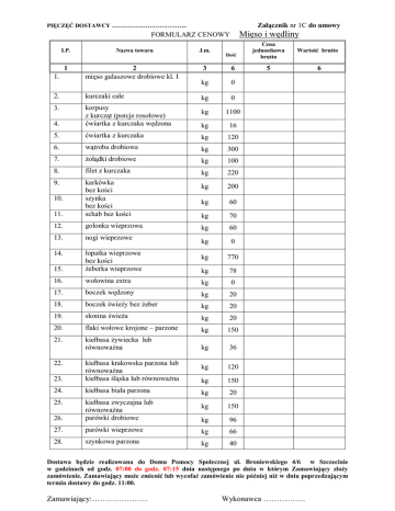 Załącznik nr 1C do umowy PIĘCZĘĆ DOSTAWCY ……………………………….. Mięso i wędliny FORMULARZ CENOWY LP. 1 Nazwa towaru J.m. Ilość 1. 2 mięso gulaszowe drobiowe kl. I 2. kurczaki całe 3. 4. korpusy z kurcząt (porcje rosołowe) ćwiartka z kurczaka wędzona 5. ćwiartka z kurczaka kg 120 6. wątroba drobiowa kg 300 7. żołądki drobiowe kg 100 8. filet z kurczaka kg 220 9. kg 200 kg 60 11. karkówka bez kości szynka bez kości schab bez kości kg 70 12. golonka wieprzowa kg 60 13. nogi wieprzowe kg 0 14. kg 770 15. łopatka wieprzowa bez kości żeberka wieprzowe kg 78 16. wołowina extra kg 0 17. boczek wędzony kg 20 18. boczek świeży bez żeber kg 20 19. słonina świeża kg 20 20. flaki wołowe krojone – parzone kg 150 21. kiełbasa żywiecka lub równoważna kg 36 kg 120 kg 150 kg 20 kg 150 kg 96 10. 3 6 kg 0 kg 0 kg 1100 kg 16 23. kiełbasa krakowska parzona lub równoważna kiełbasa śląska lub równoważna 24. kiełbasa biała parzona 25. 26. kiełbasa zwyczajna lub równoważna parówki drobiowe 27. parówki wieprzowe kg 66 28. szynkowa parzona kg 40 22. Cena jednostkowa brutto Wartość brutto 5 6 Dostawa będzie realizowana do Domu Pomocy Społecznej ul. Broniewskiego 4/6 w Szczecinie w godzinach od godz. 07:00 do godz. 07:15 dnia następnego po dniu w którym Zamawiający złoży zamówienie. Zamawiający może zmienić lub wycofać zamówienie nie później niż w dniu poprzedzającym termin dostawy do godz. 11:00. Zamawiający:………………… Wykonawca ……………. Załącznik nr 1C do umowy PIĘCZĘĆ DOSTAWCY ……………………………….. Mięso i wędliny FORMULARZ CENOWY 30. baleron drobiowy z indyka salceson czosnkowy 31. kaszanka luksusowa kg 32 32. pasztetowa luksusowa kg 14 33. mielonka wieprzowa kg 21 34. szynka złota kg 100 35. polędwica drobiowa kg 40 36. pasztet mięsny kg 27 37. szynka tostowa kg 21 38. szynka gotowana kg 80 39. szynkówka wieprzowa kg 15 40. baleron wieprzowy gotowany kg 15 41. ogonówka parzona kg 72 42. kg 15 43. polędwica sopocka lub równoważna metka cebulowa kg 9 44. metka łososiowa kg 9 45. szynka konserwowa kg 80 46. kg 10 47. kiełbasa tatrzańska lub równoważna salami wieprzowe kg 6 48. kiełbasa jałowcowa kg 5 49. szynka drobiowa kg 72 50. kiełbasa podwawelska kg 20 51. kiełbasa piwna kg 40 52. mortadela kg 62 53. salceson podrobowy kg 6 54. szynka biała z kurczaka przysmak domowy (w galarecie) serca z kurczaka kg 42 kg 72 kg kg 20 kg 25 29. 55. 56. kg 36 kg 15 58. pieczeń rzymska lub równoważna kiełbasa biała surowa 59. kiełbasa biała parzona drobiowa kg 0 60. kiełbasa śląska drobiowa kg 0 61. filet z indyka kg 0 57. 68 Dostawa będzie realizowana do Domu Pomocy Społecznej ul. Broniewskiego 4/6 w Szczecinie w godzinach od godz. 07:00 do godz. 07:15 dnia następnego po dniu w którym Zamawiający złoży zamówienie. Zamawiający może zmienić lub wycofać zamówienie nie później niż w dniu poprzedzającym termin dostawy do godz. 11:00. Zamawiający:………………… Wykonawca ……………. Załącznik nr 1C do umowy PIĘCZĘĆ DOSTAWCY ……………………………….. FORMULARZ CENOWY 62. szynka dębowa wieprzowa kg Mięso i wędliny 60 Razem wartość brutto: ..............................., dn. ............................... ..................................................................... (podpis(y) osób uprawnionych do reprezentacji wykonawcy, w przypadku oferty wspólnej- podpis pełnomocnika wykonawców) Dostawa będzie realizowana do Domu Pomocy Społecznej ul. Broniewskiego 4/6 w Szczecinie w godzinach od godz. 07:00 do godz. 07:15 dnia następnego po dniu w którym Zamawiający złoży zamówienie. Zamawiający może zmienić lub wycofać zamówienie nie później niż w dniu poprzedzającym termin dostawy do godz. 11:00. Zamawiający:………………… Wykonawca …………….