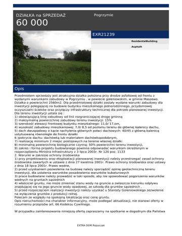 DZIAŁKA na SPRZEDAŻ Pogrzymie 60 000 EXR21239 ResidentalBuilding Asphalt Opis Przedmiotem sprzedaży jest atrakcyjna działka położona przy drodze asfaltowej od frontu z wydanymi warunkami zabudowy w Pogrzymiu , w powiecie goleniowskim, w gminie Maszewo. Działka o powierzchni 2560m2. Dla przedmiotowej działki zostały wydane warunki zabudowy dla inwestycji polegającej na budowie budynku mieszkalnego jednorodzinnego, przydomowej oczyszczalni ścieków oraz przyłączy infrastruktury technicznej dla potrzeb planowanej inwestycji. Dla terenu inwestycji ustala się : 1) obowiązującą linię zabudowy od linii rozgraniczającej drogę gminną 2) maksymalną powierzchnię zabudowy terenu inwestycji: 15% 3) szerokość elewacji frontowej budynku mieszkalnego: 11,0/ 17,om, 4) wysokość zabudowy mieszkaniowej: 7,0/ 8,5 od poziomu terenu do głównej kalenicy dachu, 5) dach dwuspadowy o kącie nachylenia głównych połaci dachowych: 40/45 z główną kalenicą ustytuowaną równolegle do frontu działki 6 )pokrycie dachu: dachówką lub materiałem dachówkopodobnym, 7) realizację minimum 2 miejsc postojowych na terenie własnej działki 8) minimalną powierzchnię biologicznie czynną: 50% powierzchni terenu inwestycji, 9) zakres i forma projektu budowlanego powinna odpowiadać warunkom określonym w rozporządzeniu Ministra Infrastruktury z 3 lipca 2003r. Nr 120 poz. 1133 2. Warunki w zakresie ochrony środowiska 1) przy projektowaniu oraz eksploatacji planowanej inwestycji należy przestrzegać zasad ochrony środowiska zawartych w ustawie z dnia 27 kwietnia 2001r. Prawo ochrony środowiska oraz ustawy z dnia 18 lipca 2001r. Prawo wodne, 2) przed uzyskaniem pozwolenia na budowę należy sporządzić opinię geotechniczną terenu inwestycji, dla ustalenia warunków posadowienia warunków kubaturowych 3) prace budowlane należy prowadzić w taki sposób, aby nie spowodować pogorszenia warunków wodnych na gruntach sąsiednich 4) właściciel gruntu, nie może zmieniać stanu wody na gruncie a zwłaszcza kierunku odpływu znajdującej się na jego gruncie wody opadowej, ze szkodą dla gruntów sąsiednich , 5) przed rozpoczęciem realizacji inwestycji należy uzyskać u Starosty Goleniowskiego zezwolenie na wyłączenia gruntów z produkcji rolnej. Polecam ze względu na spokojną lokalizację oraz cenę gruntu. Opis nieruchomości ma charakter informacyjny, może podlegać aktualizacji, nie stanowi oferty w rozumieniu przepisów art. 66 Kodeksu Cywilnego. W przypadku zainteresowania niniejszą ofertą zapraszamy na spotkanie w dogodnym dla Państwa EXTRA DOM Rojszczak terminie Prezentujemy nieruchomość wyłącznie osobie, która jest zainteresowana zakupem nieruchomości. Klient otrzymujący adres nieruchomości nie może go przekazywać osobą postronnym. Zgodnie z art. 49 ustawy o ochronie danych osobowych. Współpracę z naszymi Klientami prowadzimy na podstawie umowy pośrednictwa, która wymaga formy pisemnej pod rygorem nieważności, zgodnie z art. 180, pkt 3 Ustawy o gospodarce nieruchomościami. Nasze transakcje objęte są ubezpieczeniem od odpowiedzialności cywilnej na kwotę 200 000,00 EURO. BIURO NIERUCHOMOŚCI EXTRA DOM ROJSZCZAK 72-200 Nowogard ul. Boh. Warszawy 1 (przy placówce Alior Banku) www.extradom.net.pl tel./fax 91 392 22 33 Co robimy dla klienta zainteresowanego zakupem: * Sprawdzamy zdolność kredytową * Wyszukujemy odpowiednią nieruchomość, * Pomagamy w prowadzeniu negocjacji, * Pomagamy w uzyskaniu potrzebnych dokumentów * Pomagamy w uzyskaniu kredytu hipotecznego * Współpracujemy z kancelariami notarialnymi, geodetami Korzystając z naszych usług oszczędzasz swój czas, a także zyskujesz pewność, że Twoja transakcja zostanie przeprowadzona z należytą starannością, w sposób profesjonalny i co najważniejsze - BEZPIECZNY. Nr licencji pośredników: 21317, 21318 Dorota Więzowska tel. 517 770 353 tel. (91) 392 22 33 email: [email protected] EXTRA DOM Rojszczak Powered by TCPDF (www.tcpdf.org)
