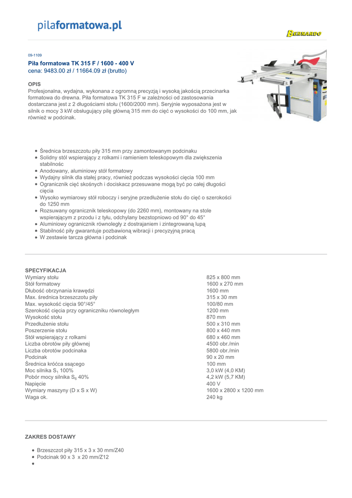 09-1109 Piła formatowa TK 315 F / 1600 - 400 V cena: 9483.00 zł / 11664.09 zł (brutto) OPIS Profesjonalna, wydajna, wykonana z ogromną precyzją i wysoką jakością przecinarka formatowa do drewna. Piła formatowa TK 315 F w zależności od zastosowania dostarczana jest z 2 długościami stołu (1600/2000 mm). Seryjnie wyposażona jest w silnik o mocy 3 kW obsługujący pilę główną 315 mm do cięć o wysokości do 100 mm, jak również w podcinak. Średnica brzeszczotu piły 315 mm przy zamontowanym podcinaku Solidny stól wspierający z rolkami i ramieniem teleskopowym dla zwiększenia stabilnośc Anodowany, aluminiowy stół formatowy Wydajny silnik dla stałej pracy, również podczas wysokości cięcia 100 mm Ogranicznik cięć skośnych i dociskacz przesuwane mogą być po całej długości cięcia Wysoko wymiarowy stół roboczy i seryjne przedłużenie stołu do cięć o szerokości do 1250 mm Rozsuwany ogranicznik teleskopowy (do 2260 mm), montowany na stole wspierającym z przodu i z tyłu, odchylany bezstopniowo od 90° do 45° Aluminiowy ogranicznik równoległy z dostrajaniem i zintegrowaną lupą Stabilność piły gwarantuje pozbawioną wibracji i precyzyjną pracą W zestawie tarcza główna i podcinak SPECYFIKACJA Wymiary stołu Stół formatowy Dłubość obrzynania krawędzi Max. średnica brzeszczotu piły Max. wysokość cięcia 90°/45° Szerokość cięcia przy ograniczniku równoległym Wysokość stołu Przedłużenie stołu Poszerzenie stołu Stół wspierający z rolkami Liczba obrotów piły głównej Liczba obrotów podcinaka Podcinak Średnica króćca ssącego Moc silnika S1 100% Pobór mocy silnika S6 40% Napięcie Wymiary maszyny (D x S x W) Waga ok. ZAKRES DOSTAWY Brzeszczot piły 315 x 3 x 30 mm/Z40 Podcinak 90 x 3 x 20 mm/Z12 825 x 800 mm 1600 x 270 mm 1600 mm 315 x 30 mm 100/80 mm 1200 mm 870 mm 500 x 310 mm 800 x 440 mm 680 x 460 mm 4500 obr./min 5800 obr./min 90 x 20 mm 100 mm 3,0 kW (4,0 KM) 4,2 kW (5,7 KM) 400 V 1600 x 2800 x 1200 mm 240 kg Kaptur ochronny piły z przyłączem odciągu Wąż łączący z kształtką widełkową Ogranicznik cięć skośnych z naprężaczem mimośrodowym Ogranicznik cięć skośnych Przedłużenie stołu Poszerzenie stołu Rozsuwany ogranicnzik teleskopowy Stół wspierający z rolkami Kijek do dosuwania Narzędzia do obsługi Powyższy cennik ma charakter informacyjny i nie stanowi oferty handlowej w rozumieniu art.66 paragraf 1 Kodeksu Cywilnego. HAFEN, ul. Artyleryjska 11, 08-110 Siedlce, tel/fax: 25 6440822, kom: 605 607 530, e-mail: [email protected]