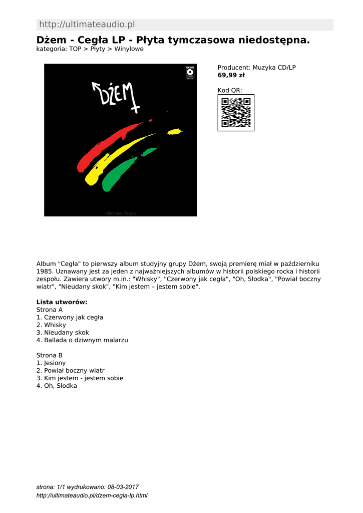 http://ultimateaudio.pl Dżem - Cegła LP - Płyta tymczasowa niedostępna. kategoria: TOP > Płyty > Winylowe Producent: Muzyka CD/LP 69,99 zł Kod QR: Album "Cegła" to pierwszy album studyjny grupy Dżem, swoją premierę miał w październiku 1985. Uznawany jest za jeden z najważniejszych albumów w historii polskiego rocka i historii zespołu. Zawiera utwory m.in.: "Whisky", "Czerwony jak cegła", "Oh, Słodka", "Powiał boczny wiatr", "Nieudany skok", "Kim jestem – jestem sobie". Lista utworów: Strona A 1. Czerwony jak cegła 2. Whisky 3. Nieudany skok 4. Ballada o dziwnym malarzu Strona B 1. Jesiony 2. Powiał boczny wiatr 3. Kim jestem - jestem sobie 4. Oh, Słodka strona: 1/1 wydrukowano: 08-03-2017 http://ultimateaudio.pl/dzem-cegla-lp.html