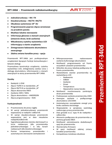 Jednokierunkowy – RX i TX Dwukierunkowy – RX/TX i RX/TX Obudowa systemowa 19” 3U Programowanie poprzez złącza serwisowe na przednim panelu Możliwe lokalne sterowanie Informacja głosowa o stanach awaryjnych (otwarcie drzwi, brak zasilania) Wbudowany czytelny wyświetlacz LCD informujący o stanie urządzenia Zintegrowane ładowanie akumulatora awaryjnego Zdalna zmiana kanałów pracy - opcja Przemiennik RPT-340d jest profesjonalnym urządzeniem łączącym funkcje komunikacyjne i łatwośd obsługi. Przemysłowa konstrukcja urządzenia, czytelny wyświetlacz LCD, zintegrowany zasilacz wraz z obsługą akumulatora, informowanie o stanach awaryjnych to atuty przemiennika RPT-340d. Zasoby Nadajnik 1-25W Złącze TX/RX A w standardzie „N” Złącze RX/TX B w standardzie „N” Złącze akcesoriów DB25 Zasilanie 230V / 50Hz Złącze akumulatora – ANDERSON Złącza programowania – RJ45 Funkcjonalnośd Przystosowany do pracy ciągłej W wersji jednokierunkowej przemiennik wyposażony w nadajnik i odbiornik W wersji dwukierunkowej przemiennik wyposażony jest w dwa niezależne nadajniki/odbiorniki Sygnalizacja głosowa stanów alarmowych w torze nadawczym (dla przemiennika jednokierunkowego) i w obu torach nadawczych (dla dwukierunkowego) Pomiar temperatury przemiennika i automatyczne sterowanie wentylatorem Mikroprocesorowe nadzorowanie zasilania buforowego (akumulator) Możliwośd programowania od frontu wszystkich ustawieo przemiennika Mikrofon do pracy lokalnej podłączany do frontu przemiennika Wyświetlanie stanów przemiennika na wyświetlaczu LCD Nadawanie Odbiór Zasilanie Drzwi Temperatura Opcjonalnie nazwa kanału Możliwośd monitorowania zamknięcia drzwi przemiennika Podstawowe zasilanie przemiennika 230V Awaryjne zasilanie z podłączonego akumulatora 12V/24Ah Automatyczne oszczędzanie energii przy braku zasilania sieciowego Wyposażenie w sprzętowy watchdog nadzorujący pracę przemiennika Dwa gniazda w.cz. typu N do nadajnika i odbiornika Akcesoria podłączane do przemiennika za pomocą gniazda DB25 Możliwośd zainstalowania dodatkowych opcji do przemiennika Wymienialny firmware W opcji możliwośd zdalnej zmiany kanałów przemiennika Kompaktowa metalowa obudowa Przemiennik RPT-340d RPT-340d - Przemiennik radiokomunikacyjny Dane Techniczne Ogólne Przemiennik RPT-340d Wymiary (dł. x szer. x wys.) Waga Sposób mocowania Temperatura pracy Klasa ochrony Napięcie zasilania /podstawowe/ Napięcie zasilania /awaryjne/ Moc pobierana Prąd przy zasilaniu awaryjnym 320 x 484 x 133 10 kg max 19” 3U -30 … +60°C IP22 230V AC / 50Hz 12-15V DC 100W 8A max Wersje VHF UHF LB MB Cross Band Wyświetlacz Rysunki i wymiary RPT-340d/VHF RPT-340d/UHF RPT-340d/LB RPT-340d/MB RPT-340d/Cx Nadajnik Moc nadajnika Maksymalna dewiacja Przydźwięki i szumy Promieniowanie niepożądane Tłumienie kanału sąsiedniego Pasmo akustyczne 300-3000 Hz Zniekształcenia 1 kHz i 60% dewiacji 1-25W ±2,5 kHz przy 12.5 kHz -40 dB przy 12,5 kHz -36 dBm < 1 GHz -30 dBm > 1 GHz -60 dB przy 12,5 kHz + 1 do -3 dB 3% typowe Odbiornik Czułośd 12 dB SINAD ETS Intermodulacja ETS Selektywnośd Tłumienie sygnałów pasożytniczych Zniekształcenia akustyczne Przydźwięki i szumy Pasmo akustyczne 300-3000 Hz Promieniowanie pasożytnicze 0,22 μV typowe > 70 dB 65 dB przy 12,5 kHz 70 dB przy 12,5 kHz 3% typowe -40 dB przy 12,5 kHz +1 do -3 dB -57 dBm < 1 GHz -47 dBm > 1 GHz ul. Wałbrzyska 21, 52-314 Wrocław tel. +48 71 363 42 00 fax +48 71 361 23 12 [email protected]