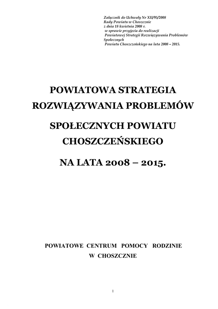 Załącznik do Uchwały Nr XII/95/2008 Rady Powiatu w Choszcznie z dnia 18 kwietnia 2008 r. w sprawie przyjęcia do realizacji Powiatowej Strategii Rozwiązywania Problemów Społecznych Powiatu Choszczeńskiego na lata 2008 – 2015. POWIATOWA STRATEGIA ROZWIĄZYWANIA PROBLEMÓW SPOŁECZNYCH POWIATU CHOSZCZEŃSKIEGO NA LATA 2008 – 2015. POWIATOWE CENTRUM POMOCY RODZINIE W CHOSZCZNIE 1 POWIATOWA STRATEGIA ROZWIĄZYWANIA PROBLEMÓW SPOŁECZNYCH POWIATU CHOSZCZEŃSKIEG NA LATA 2008 – 2015. WSTĘP Rozdział I Charakterystyka Powiatu Choszczeńskiego Rozdział II Pomoc społeczna na terenie powiatu 2.1. Podmioty realizujące zadania 2.2. Diagnoza problemów społecznych w powiecie i zasoby w ich rozwiązywaniu. Bezrobocie. Niepełnosprawność. Alkoholizm, narkomania i inne uzależnienia. Przemoc. Rodziny zastępcze. Rozdział III Opracowanie strategii dla powiatu. 3.1. Analiza SWOT 3.2. Cele strategiczne i operacyjne. ZAKOŃCZENIE 2 Wstęp Celem strategii jest rozwiązywanie ważnych problemów społecznych w naszym powiecie oraz planowanie i realizacja wyznaczonych zadań w zakresie polityki społecznej1. Realizacja zadań postawionych przed pomocą społeczną na poziomie społeczności lokalnej, jak i na poziomie rodziny i jednostki oraz konieczność wypracowania ustawowych i niekonwencjonalnych form pomocy, wymaga systemowe go i profesjonalnego diagnozowania problemów społecznych w skali powiatu. Diagnoza problemów społecznych występujących na terenie powiatu sporządzona została na podstawie danych będących w dyspozycji Powiatowego Centrum Pomocy Rodzinie, Ośrodków Pomocy Społecznej, Komendy Powiatowej Policji, Powiatowego Urzędu Pracy, i innych działających na naszym terenie. Strategia Rozwiązywania Problemów Społecznych jest wyrazem zintegrowanego planowania społecznego. Cele integracji powinny być wyrazem dążeń i aspiracji społeczności lokalnej zmierzających do rozwiązywania zidentyfikowanych problemów, likwidacji barier i zagrożeń oraz do wykorzystania wszelkich szans tkwiących w potencjale ludzkim i materialnym dla przyszłej integracji. Do podstawowych zadań przy tworzeniu strategii należy zaliczyć diagnozę problemów społecznych, wskazanie głównych kierunków działań (ustalenie priorytetowego hasła polityki społecznej), a dla obszarów problemowych – priorytetów oraz działań niezbędnych do ich realizacji. Stosowanie zapisów strategii umożliwi zaplanowanie rozwoju wybranych obszarów polityki społecznej oraz podejmowanie innych działań na rzecz podnoszenia jakości życia mieszkańców powiatu. Strategia wskazuje główne kierunki działań dla podmiotów funkcjonujących w obszarze polityki społecznej, czyli organów administracji rządowej i samorządowej. Rozwój powiatu musi być ściśle powiązany z polepszeniem jakości życia mieszkańców. Przyjazne warunki życia oznaczają dobry dostęp do: opieki zdrowotnej, pomocy społecznej, mieszkań, instytucji kultury, sportu i rekreacji oraz zapewnienie bezpieczeństwa zarówno socjalnego jak i publicznego. 3 ROZDZIAŁ I CHARAKTERYSTYKA POWIATU CHOSZCZEŃSKIEGO Powiat Choszczeński położony jest w południowej części województwa zachodniopomorskiego2. Leży na Pojezierzu Myśliborskim nad rzeką Stobnicą i jeziorem Klukom. W jego skład wchodzi sześć gmin: Bierzwnik, Choszczno, Drawno, Krzęcin, Pełczyce i Recz. Powierzchnia powiatu – 132.752 ha, ludność – około 51.320. Jest to rejon gdzie funkcjonowały byłe PGR-y. Region ma charakter rolniczy, ponad połowa jego mieszkańców zamieszkuje wsie. Dużą część powierzchni powiatu (39,1%) stanowią użytki leśne (w znacznym stopniu objęte ochroną przyrody) i wody (2,7%) co sprawia, że teren powiatu charakteryzuje się sprzyjającymi warunkami turystycznymi. Na tę atrakcyjność wpływa bogate zróżnicowanie krajobrazu, na którego piękno wielki wpływ ma ponad 100 jezior. W powiecie działają małe i średnie przedsiębiorstwa, brak jest dużej strategicznej firmy. Dlatego też zjawisko bezrobocia na terenie naszego powiatu utrzymuje si ę na bardzo wysokim poziomie. Stopa bezrobocia kształtuje się w granicach 29,9 % (stan na 31.12.2006r.). Obserwuje się tendencje spadkową. Choszczno jako stolica powiatu jest ośrodkiem skupiającym wszystkie powiatowe instytucje rządowe, samorządowe i inne ważne instytucje dla życia lokalnej społeczności. Tutaj zlokalizowane są szkoły średnie i filie uczelni wyższych. Funkcjonuje szpital powiatowy oraz publiczne i prywatne przychodnie lekarskie, w tym specjalistyczne. 1 2 Ustawa z dnia 12 marca 2004r. o pomocy społecznej: art. 19 pkt 1. Żródło: Starostwo Powiatowe, Wydz. Nieruchomości ,Geodezji, Kartografii i Katastru, z dnia 17.05.2006r. 4 5 Ludność w Powiecie Choszczeńskim z wyszczególnieniem poszczególnych gmin na dzień 31.12.2006r3. Miasto i Gmina Choszczno 22 623 Gmina Bierzwnik 4 981 Miasto i Gmina Drawno 5 502 Gmina Krzęcin 3 980 Miasto i Gmina Pełczyce 8 305 Miasto i Gmina Recz 5 930 Ogółem: 51 321 Mimo nieznacznemu przyrostowi, populacja maleje. Duży odsetek wyjeżdża za granice kraju w celach zarobkowych. Krzęcin 3 Bierzwnik Źródło: Starostwo Powiatowe: Strategia Rozwoju Powiatu Choszczeńskiego na lata 2007- 2015. 6 Recz Pełczyce Drawno Każda jednostka dysponuje własnymi zasobami instytucjonalnymi i pozainstytucjonalnymi. Infrastrukturę w powiecie w zakresie pomocy dziecku i rodzinie głównie tworzą: ośrodki pomocy społecznej, placówki opiekuńczowychowawcze wsparcia dziennego – świetlice- instytucje poradnictwa rodzinnego, powiatowe centrum pomocy rodzinie i rodzinna opieka zast ępcza oraz placówki oświatowe. 7 ROZDZIAŁ II POMOC SPOŁECZNA NA TERENIE POWIATU Pomoc społeczna to spójny system, oparty między innymi na budowaniu podstaw systemu samopomocowego, wspieraniu i tworzeniu lokalnego systemu organizacji społecznych, a także na pracy na zasadach partnerstwa, pomocniczo ści i efektywności.
