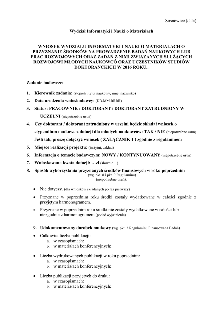 Sosnowiec (data) Wydział Informatyki i Nauki o Materiałach WNIOSEK WYDZIAŁU INFORMATYKI I NAUKI O MATERIAŁACH O PRZYZNANIE ŚRODKÓW NA PROWADZENIE BADAŃ NAUKOWYCH LUB PRAC ROZWOJOWYCH ORAZ ZADAŃ Z NIMI ZWIĄZANYCH SŁUŻĄCYCH ROZWOJOWI MŁODYCH NAUKOWCÓ ORAZ UCZESTNIKÓW STUDIÓW DOKTORANCKICH W 2016 ROKU.. Zadanie badawcze: 1. Kierownik zadania: (stopień i tytuł naukowy, imię, nazwisko) 2. Data urodzenia wnioskodawcy: (DD.MM.RRRR) 3. Status: PRACOWNIK / DOKTORANT / DOKTORANT ZATRUDNIONY W UCZELNI (niepotrzebne usuń) 4. Czy doktorant / doktorant zatrudniony w uczelni będzie składał wniosek o stypendium naukowe z dotacji dla młodych naukowców: TAK / NIE (niepotrzebne usuń) Jeśli tak, proszę dołączyć wniosek ( ZAŁĄCZNIK 1 ) zgodnie z regulaminem 5. Miejsce realizacji projektu: (instytut, zakład) 6. Informacja o temacie badawczym: NOWY / KONTYNUOWANY (niepotrzebne usuń) 7. Wnioskowana kwota dotacji: …zł (słownie…) 8. Sposób wykorzystania przyznanych środków finansowych w roku poprzednim (wg. pkt. 8 i pkt. 9 Regulaminu) (niepotrzebne usuń): Nie dotyczy. (dla wniosków składanych po raz pierwszy) Przyznane w poprzednim roku środki zostały wydatkowane w całości zgodnie z przyjętym harmonogramem. Przyznane w poprzednim roku środki nie zostały wydatkowane w całości lub niezgodnie z harmonogramem (podać wyjaśnienie) 9. Udokumentowany dorobek naukowy (wg. pkt. 3 Regulaminu Finansowana Badań) Całkowita liczba publikacji: a. w czasopismach: b. w materiałach konferencyjnych: Liczba wydrukowanych publikacji w roku poprzednim: a. w czasopismach: b. w materiałach konferencyjnych: Liczba publikacji przyjętych do druku: a. w czasopismach: b. w materiałach konferencyjnych: Liczba prac zgłoszonych: a. w czasopismach: b. w materiałach konferencyjnych: Indeks h kierownika projektu wg: a. Scopus b. Web of Knowledge c. Google Scholar 10. Referaty/plakaty (wg. pkt. 4 Regulaminu) Całkowita liczba: a. pełnych wystąpień: b. wystąpień plakatowych: W roku poprzednim: a. pełnych wystąpień: b. wystąpień plakatowych: 11. Liczba patentów/wdrożeń z potwierdzeniem ich uzyskania oraz liczba zgłoszeń patentowych (wg pkt. 6 Regulaminu) a. patenty: b. wdrożenia: c. zgłoszenia patentowe: 12. Stopień zaawansowania pracy doktorskiej lub habilitacyjnej (%) 13. Opis projektu wraz uzasadnieniem prac (np. planowany doktorat, habilitacja, publikacja, wdrożenie, itp.) kosztorys oraz zasadność wydatkowania kwot (wg pkt. 7 Regulaminu) ( ZAŁĄCZNIK 2) ………………………….. Podpis wnioskodawcy 14. Decyzja Komisji Konkursowej Przyznano kwotę w wysokości:………………………….. Podpisano za Komisję Konkursową………………………. Nie przyznano środków Podpisano za Komisję Konkursową……………………….