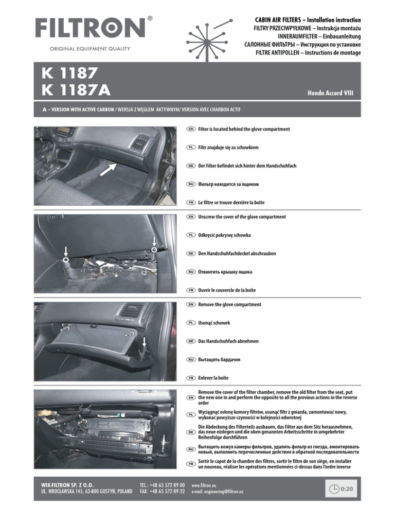CABIN AIR FILTERS – Installation instruction FILTRY PRZECIWPYŁKOWE – Instrukcja montażu INNERAUMFILTER – Einbauanleitung САЛОННЫЕ ФИЛЬТРЫ – Инструкция по установке FILTRE ANTIPOLLEN – Instructions de montage K 1187 K 1187A Honda Accord VIII A – VERSION WITH ACTIVE CARBON / WERSJA Z WĘGLEM AKTYWNYM/ VERSION AVEC CHARBON ACTIF Filter is located behind the glove compartment Filtr znajduje się za schowkiem Der Filter befindet sich hinter dem Handschuhfach Фильтр находится за ящиком Le filtre se trouve derrière la boîte Unscrew the cover of the glove compartment Odkręcić pokrywę schowka Den Handschuhfachdeckel abschrauben Отвинтить крышку ящика Ouvrir le couvercle de la boîte Remove the glove compartment Usunąć schowek Das Handschuhfach abnehmen Вытащить бардачок Enlever la boîte Remove the cover of the filter chamber, remove the old filter from the seat, put the new one in and perform the opposite to all the previous actions in the reverse order Wyciągnąć osłonę komory filtrów, usunąć filtr z gniazda, zamontować nowy, wykonać powyższe czynności w kolejności odwrotnej Die Abdeckung des Filterteils ausbauen, das Filter aus dem Sitz herausnehmen, das neue einlegen und die oben genannten Arbeitsschritte in umgekehrter Reihenfolge durchführen Вытащить кожух камеры фильтров, удалить фильтр из гнезда, вмонтировать новый, выполнить перечисленные действия в обратной последовательности Sortir le capot de la chambre des filtres, sortir le filtre de son siège, en installer un nouveau, réaliser les opérations mentionnées ci-dessus dans l’ordre inverse WIX-FILTRON SP. Z O.O. TEL.:+48 65 572 89 00 www.filtron.eu UL. WROCŁAWSKA 145, 63-800 GOSTYŃ, POLAND FAX: +48 65 572 89 22 e-mail: [email protected] 0:20