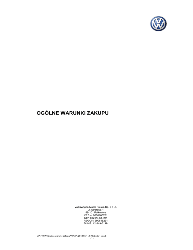 OGÓLNE WARUNKI ZAKUPU Volkswagen Motor Polska Sp. z o .o. ul. Strefowa 1 59-101 Polkowice KRS nr 0000100781 NIP: 692-20-88-897 REGON: 390618261 DUNS: 42-249-5119 MP-F/R.W./Ogólne warunki zakupu VWMP /2012.05.11/F.15/Seite 1 von 6 -1- OGÓLNE WARUNKI ZAKUPU 1. Zamówienie i ceny (1) Przy naszych zamówieniach obowiązują niniejsze warunki zakupu. Warunki sprzedaŜy i dostaw ustalone przez naszych dostawców nie są dla nas wiąŜące nawet wtedy, jeŜeli wyraźnie nie zaoponujemy tym warunkom. (2) Nasze zamówienia są wiąŜące dla obu stron, jeŜeli są zamieszczone na naszym formularzu zamówienia i zostały niezwłocznie potwierdzone przez dostawcę na naszym formularzu w pozycji "potwierdzenie zamówienia". JeŜeli akceptacja zamówienia nie zostanie nam odesłana w ciągu 10 dni od dnia otrzymania naszego zamówienia, zastrzegamy sobie prawo wycofania zamówienia. 2. Dostawa-odbiór (1) Dostawa musi być zgodna z zamówieniem pod względem wykonania, zakresu i podziału oraz musi nastąpić w ustalonym terminie. W przypadku ilości, wymiarów i wag miarą są wartości otrzymane w wyniku kontroli otrzymanego towaru. Nie jesteśmy zobowiązani do odbioru nie uzgodnionych dostaw częściowych bądź wielokrotnych. (2) W przypadku niedotrzymania ustalonych terminów, dostawca jest zobowiązany w ramach przepisów ustawowych do wyrównania szkód powstałych na skutek opóźnienia. W przypadku powtórnego przekroczenia terminu mamy prawo odstąpić od umowy. (3) Sytuacje takie jak: klęski Ŝywiołowe, zamieszki, działania urzędowe, zakłócenia w transporcie, strajki, lokauty i inne zakłócenia w utrzymaniu ruchu w naszym zakładzie lub zakładach poddostawczych, które prowadzą do wstrzymania lub ograniczenia produkcji, bądź teŜ utrudniają nam odtransportowanie zamówionego towaru, zwalniają nas na czas ich trwania z obowiązku odbioru, o ile nie jesteśmy w stanie zlikwidować tych zakłóceń lub ich likwidacja nie jest moŜliwa za pomocą dostępnych środków. W takich wypadkach wykluczone jest prawo dostawcy do rekompensaty, jak równieŜ do wyrównania strat. W przypadku utrudnień związanych z odtransportowaniem dostawca ma obowiązek przechowania towaru na własny koszt i ryzyko do momentu przejęcia go przez nas lub dla nas przez osoby trzecie. 3. Wadliwe dostawy – Gwarancja (1) W przypadku wnoszenia reklamacji nie jesteśmy związani dotrzymaniem terminu ani w przypadku usterek jawnych ani usterek ukrytych. Wykrycie błędów ukrytych uprawnia nas do wnoszenia roszczeń o rekompensatę za niepotrzebnie zuŜyty materiał i poniesione koszty wynagrodzeń. MP-F/R.W./Ogólne warunki zakupu VWMP /2012.05.11/F.15/Seite 2 von 6 -2- (2) W naglących wypadkach mamy prawo usunąć usterki lub jeŜeli nie jest to moŜliwe, to moŜemy pobrać towar i u innego poddostawcy na koszt dostawcy. (3) JeŜeli nie zostały poczynione inne ustalenia odnośnie gwarancji, to dostawca udziela gwarancji na swoje dostawy zgodnie z obowiązującymi przepisami ustaw. (4) Towar dostarczony niezgodnie z warunkami umowy będzie odesłany na koszt dostawcy. JeŜeli dostawy powtórnie nie będą zrealizowane zgodnie z umową to wówczas mamy prawo odstąpić od umowy. 4. Ochrona praw osób trzecich Dostawca gwarantuje, Ŝe na skutek jego dostaw i ich wykorzystywania nie zostaną naruszone prawa patentowe i inne prawa autorskie osób trzecich w kraju i za granica. 5. Wysyłka – Koszty – Przejście ryzyka Zastrzegamy sobie prawo do określenia drogi wysyłki i rodzaju wysyłki jak równieŜ środka transportu i rodzaju opakowania. O ile nie zostaną poczynione inne ustalenia, to dostawy powinny być realizowane franco samochód dostawczy W stosunku do wszystkich klauzul handlowych obowiązują INCOTERMS w wersji obowiązującej w danym momencie. Dostawca z krajów trzecich (spoza UE) zobowiązany jest przy wysyłkach zagranicznych zgłosić się do VWMP – Dział Finansowy – Handel Zagraniczny, Zakupy w celu uzyskania informacji odnośnie miejsca odprawy celnej. 6. Dokumenty wysyłkowe Przy obrocie towarów z: a) dostawcą z Unii europejskiej, naleŜy dostarczyć: dokument wysyłkowy (Lieferschein) świadectwo dostawy faktura list przewozowy (CMR, CIM) b) dostawcą z krajów trzecich jw. dodatkowo dokumenty niezbędne do dokonania odprawy celnej dokument poświadczający preferencje celne MP-F/R.W./Ogólne warunki zakupu VWMP /2012.05.11/F.15/Seite 3 von 6 -3- 7. Rachunek i zapłata Rachunek wystawiany jest przez dostawcę na podstawie uzgodnień zawartych w zamówieniu tj. cena, odpowiedni termin płatności, warunki dostawy, nr zamówienia. W przypadku braku w/w danych płatności będą wstrzymane aŜ do chwili wyjaśnienia. 8. Środki produkcyjne 1) Środki produkcyjne takie jak modele, narzędzia, wzorce, rysunki i temu podobne, które dostawca otrzymuje od nas lub produkuje je wg naszych wytycznych nie mogą być sprzedawane, zastawiane bądź przekazywane osobom trzecim, jak równieŜ nie mogą być wykorzystywane przez osoby trzecie. To samo dotyczy przedmiotów wyprodukowanych za pomocą tych środków produkcyjnych; mogą być one dostarczane tylko do nas o ile nie zostały poczynione inne pisemne ustalenia dotyczące innego wykorzystania. Po zrealizowaniu naszych zamówień środki produkcyjne, które były przez nas udostępniane lub wyprodukowane na nasz rachunek, musza być nam zwrócone bez specjalnego Ŝądania. Przedmioty, które zostały wytworzone lub rozwinięte we współpracy z dostawcą mogą być dostarczone tylko do nas. 2) 3) 9. Znaki firmowe i towarowe. Nasze znaki firmowe i towarowe jak równieŜ numery części naleŜy umieścić na towarze, który został przez nas zamówiony, jeŜeli tego wymaga nasz rysunek lub jeŜeli wydane zostało takie polecenie. Tak oznakowane przedmioty mogą być dostarczane tylko dla nas. Towary zwrócone zareklamowane z naszym znakiem firmowym lub towarowym podlegają zniszczeniu. 10. Tajemnica słuŜbowa- reklama 1. 2. Dostawca 