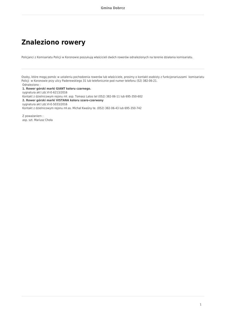 Gmina Dobrcz Znaleziono rowery Policjanci z Komisariatu Policji w Koronowie poszukują właścicieli dwóch rowerów odnalezionych na terenie działania komisariatu. Osoby, które mogą pomóc w ustaleniu pochodzenia rowerów lub właściciele, prosimy o kontakt osobisty z funkcjonariuszami komisariatu Policji w Koronowie przy ulicy Paderewskiego 31 lub telefonicznie pod numer telefonu (52) 382-06-21. Odnaleziono : 1. Rower górski marki GIANT koloru czarnego. sygnatura akt Ldz.VI-E-6213/2016 Kontakt z dzielnicowym rejonu mł. asp. Tomasz Latos tel (052) 382-06-11 lub 695-350-602 2. Rower górski marki VISTANA koloru szaro-czerwony sygnatura akt Ldz.VI-E-5033/2016 Kontakt z dzielnicowym rejonu mł.as. Michał Kwaśny te. (052) 382-06-43 lub 695-350-742 Z poważaniem : asp. szt. Mariusz Choła 1