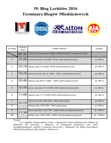 39. Bieg Lechitów 2016 Terminarz Biegów Młodzieżowych Nr biegu Godzina startu Grupa wiekowa Dystans 09:30 Uroczyste rozpoczęcie biegów młodzieżowych, wymarsz na trasę 1 10:00 dziewczęta klas I-II (2008- 2010) szkół podstawowych ok. 400 m 2 10:10 chłopcy klas I-II (2008- 2010) szkół podstawowych ok. 400 m 3 10:20 dziewczęta klas III-IV (2006 – 2007) szkół podstawowych ok. 400 m 4 10:40 chłopcy klas III-IV (2006 – 2007) szkół podstawowych ok. 400 m 5 10:50 dziewczęta klas V-VI (2004-2005) szkół podstawowych ok. 800 m 6 11:00 chłopcy klas V-VI (2004-2005) szkół podstawowych ok. 800 m dziewczęta klas I-III (2001 -2003) gimnazjum ok. 800 m 8 chłopcy klas I-III (2001 -2003) gimnazjum ok. 800 m 9 dziewczęta klas I-III (1997 -2000) szkół ponadgimnazjalnych ok. 1000 m chłopcy klas I-III (19987 -2000) szkół ponadgimnazjalnych ok. 1 000 m 7 10 11:15 11:30 Uwaga! Ze względów bezpieczeństwa starty w kategoriach szkół podstawowych odbędą się oddzielnie dla dziewcząt i chłopców. W kategoriach gimnazjów oraz szkół ponadgimnazjalnych wspólnie wystartują dziewczęta z chłopcami, ale będzie prowadzona oddzielna klasyfikacja indywidualna i drużynowa.