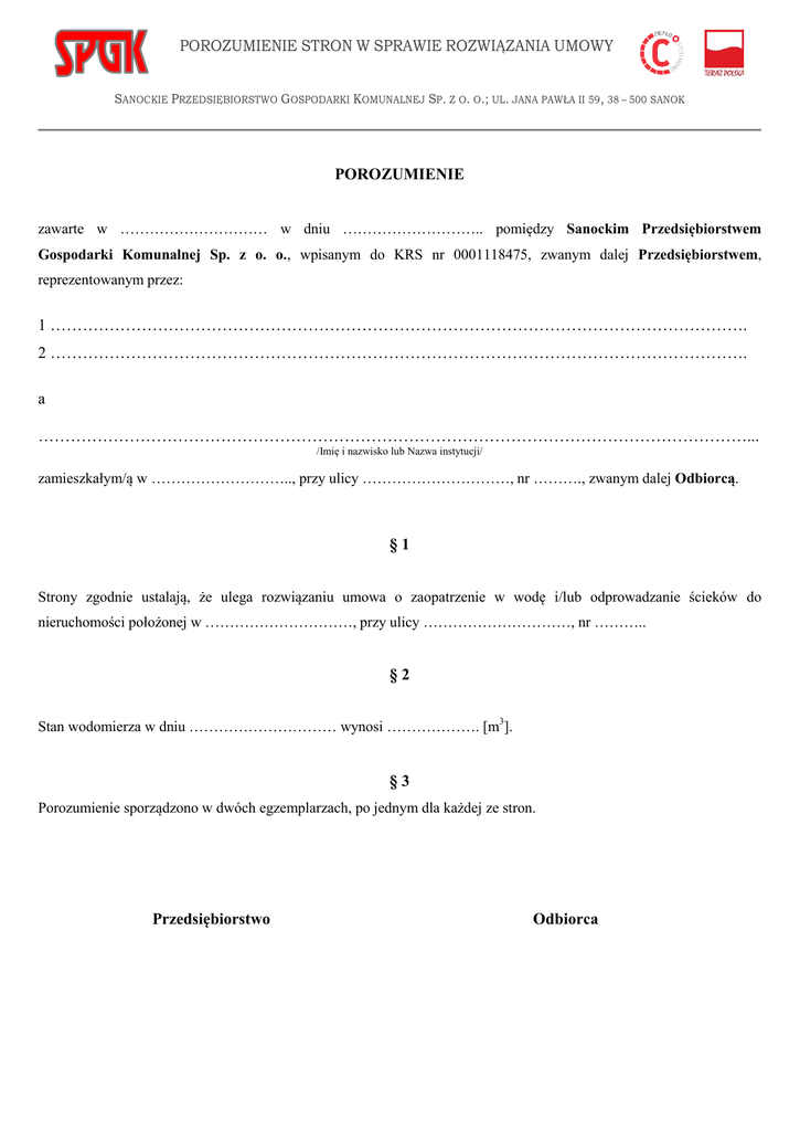 POROZUMIENIE STRON W SPRAWIE ROZWIĄZANIA UMOWY SANOCKIE PRZEDSIĘBIORSTWO GOSPODARKI KOMUNALNEJ SP. Z O. O.; UL. JANA PAWŁA II 59, 38 – 500 SANOK POROZUMIENIE zawarte w ………………………… w dniu ……………………….. pomiędzy Sanockim Przedsiębiorstwem Gospodarki Komunalnej Sp. z o. o., wpisanym do KRS nr 0001118475, zwanym dalej Przedsiębiorstwem, reprezentowanym przez: 1 …………………………………………………………………………………………………………………. 2 …………………………………………………………………………………………………………………. a ……………………………………………………………………………………………………………………... /Imię i nazwisko lub Nazwa instytucji/ zamieszkałym/ą w ……………………….., przy ulicy …………………………, nr ………., zwanym dalej Odbiorcą. §1 Strony zgodnie ustalają, że ulega rozwiązaniu umowa o zaopatrzenie w wodę i/lub odprowadzanie ścieków do nieruchomości położonej w …………………………, przy ulicy …………………………, nr ……….. §2 Stan wodomierza w dniu ………………………… wynosi ………………. [m3]. §3 Porozumienie sporządzono w dwóch egzemplarzach, po jednym dla każdej ze stron. Przedsiębiorstwo Odbiorca