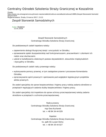 Centralny Ośrodek Szkolenia Straży Granicznej w Koszalinie Źródło: http://www.cos.strazgraniczna.pl/cos/o-nas/osrodek/struktura-osrodka/struktura/13895,Zespol-Stanowisk-Samodzi elnych.html Wygenerowano: Środa, 8 marca 2017, 15:21 Zespół Stanowisk Samodzielnych Autor: Redaktor 12.01.2016 Zespół Stanowisk Samodzielnych Centralnego Ośrodka Szkolenia Straży Granicznej Do podstawowych zadań kapelana należy: ● zapewnienie obsługi liturgicznej świąt i uroczystości w Ośrodku; ● sprawowanie opieki duszpasterskiej nad funkcjonariuszami, pracownikami i członkami ich rodzin oraz słuchaczami; ● udział w kształtowaniu właściwych postaw obywatelskich, stosunków międzyludzkich i dyscypliny w Ośrodku. Do podstawowych zadań radcy prawnego należy: ● wykonywanie pomocy prawnej, w tym zastępstwo prawne i procesowe Komendanta Ośrodka; ● opracowywanie opinii prawnych i opiniowanie pod względem legislacyjnym projektów aktów prawnych. Do zadań specjalisty do spraw bezpieczeństwa i higieny pracy należą zadania określone w przepisach regulujących zadania służby bezpieczeństwa i higieny pracy. Do zadań specjalisty lub inspektora do spraw ochrony przeciwpożarowej należą zadania określone w przepisach o ochronie przeciwpożarowej. Radca prawny Centralnego Ośrodka Szkolenia Straży Granicznej mgr Ewa Kucharek tel. + 48 94 34 44 029 Kapelan Centralnego Ośrodka Szkolenia Straży Granicznej ks. ppłk SG Lucjan Dolny tel. + 48 94 34 44 027 Inspektor ds. ochrony przeciwpożarowej Centralnego Ośrodka Szkolenia Straży Granicznej Mariusz Skrzyński tel. + 48 94 34 44 052 Specjalista ds. bezpieczeństwa i higieny pracy Centralnego Ośrodka Szkolenia Straży Granicznej Agnieszka Martynus – Sklenarska tel. + 48 94 34 44 261