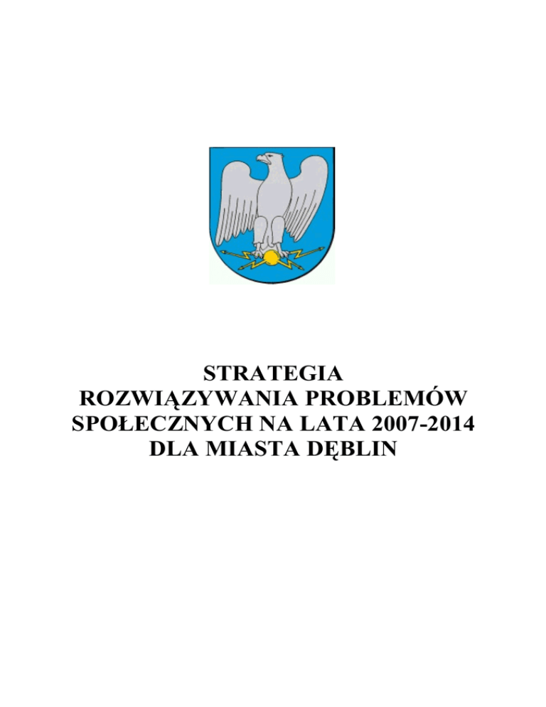 STRATEGIA ROZWIĄZYWANIA PROBLEMÓW SPOŁECZNYCH NA LATA 2007-2014 DLA MIASTA DĘBLIN DĘBLIN 2007 Spis treści WSTĘP Rozdział I DIAGNOZA W ZAKRESIE PROBLEMÓW SPOŁECZNYCH GMINY 1.1. Charakterystyka gminy………………………………………………….. 7 1.2. Przesłanki demograficzne ………………………………………………. 9 1.3. Bezrobocie i rynek pracy ……………………………………………….. 10 1.4. Oświata i wychowanie ………………………………………………….. 16 1.5 Kultura ………………………………………………………………….. 19 1.6 Ochrona zdrowia ………………………………………………………... 21 1.7 Bezpieczeństwo publiczne ……………………………………………… 27 1.8. Pomoc społeczna w gminie Dęblin …………………………………….. 29 1.9. Główne problemy społeczne występujące w gminie …………………… 42 1.9.1. Wykluczenie społeczne ………………………………………….. 43 1.9.2. UzaleŜnienia ……………………………………………………... 44 1.9.3. Niepełnosprawność ……………………………………………… 47 Rozdział II METODOLOGICZNE ZAGADNIENIA DOTYCZĄCE PROBLEMÓW SPOŁECZNYCH 2.1. ZałoŜenia polityki społecznej w gminie Dęblin ………………………... 48 2.2. Cele strategiczne i programowe………………………………………… 48 2.3. Uwarunkowania prawne ………………………………………………... 49 Rozdział III ZAŁOśENIA STRATEGICZNE ROZWIĄZYWANIA PROBLEMÓW SPOŁECZNYCH 3.1. Misja Gminnej Strategii Rozwiązywania Problemów Społecznych …… 50 3.2. Cel strategiczny………………………………………………………… 50 3.3. Obszary problemowe strategii ………………………………………….. 51 2 3.3.1. Ubóstwo i jego skutki …………………………………………… 51 3.3.2. Bezrobocie ………………………………………………………. 51 3.3.3. Wykluczenie społeczne, uzaleŜnienia i patologie ………………. 51 3.3.4. System wsparcia socjalnego dziecka i rodziny, eliminowanie dysfunkcyjności wychowawczej, świadczenia, partnerstwo w rozwiązywaniu problemów……………………………………………… 54 3.3.5. System wsparcia dla osób niepełnosprawnych i starszych ………. 55 3.3.6. Analiza SWOT zdiagnozowanej sytuacji społecznej gminy Dęblin …………………………………………………………………... 57 Rozdział IV PROGRAMY DZIAŁAŃ 4.1. Gminny Program Pomocy Osobom Niepełnosprawnym lata 2003-2012 59 4.2. Gminny Program Pomocy Rodzinie lata 2003-2012 …………………… 59 4.3. Roczny program współpracy Miasta Dęblin z organizacjami pozarządowymi na rok 2006 …………………………………………… 4.4. Program Profilaktyki i Rozwiązywania Problemów Alkoholowych dla Miasta Dęblin na rok 2006……………………………………………… 4.5. 61 62 Program gospodarowania mieszkaniowym zasobem Miasta Dęblin na lata 2002-2007…………………………………………………………... 64 4.6. Miejski Program Promocji i Profilaktyki Zdrowia na lata 2006-2010…. 64 4.7. Program Walki z Bezrobociem na Terenie Miasta Dęblin ……………... 66 Rozdział V ŹRÓDŁA FINANSOWANIA 5.1. Środki unijne ……………………………………………………………. 67 5.2. Środki krajowe …………………………………………………………. 68 MONITORING STRATEGII BIBLIOGRAFIA STRATEGII SPIS WYKRESÓW I TABEL 3 WSTĘP Przemiany społeczno-gospodarcze zachodzące w Polsce doprowadziły do gwałtownych zmian na rynku pracy, wzrostu bezrobocia, wraz ze wszystkimi jego negatywnymi skutkami. Wpłynęły na pogłębienie zjawiska zuboŜenia społeczeństwa, pogorszenie standardu Ŝycia. Zaburzyły poczucie bezpieczeństwa, co zrodziło apatię, samotność i rozgoryczenie. Negatywne skutki społeczno- gospodarcze transformacji systemowej stały się powodem wzrostu zapotrzebowania gminy na konstruktywne programy osłonowe łagodzące problemy społeczne występujące w społeczności lokalnej. Mieszkańcy Dęblina doświadczyli znacznego bezrobocia, nadal odczuwane są jego skutki. W efekcie pogłębiająca się bieda i ubóstwo znacznie nasiliły dysfunkcyjność niektórych środowisk. Zwiększył się wachlarz róŜnego rodzaju patologii, m.in. uzaleŜnień, przemocy, bezradności w sprawach opiekuńczo – wychowawczych, oraz niezaradności Ŝyciowej. Wraz ze zmianą ustrojową pojawił się nowy rodzaj klientów pomocy społecznej. Do osób starszych, niepełnosprawnych, samotnych dołączyli świadczeniobiorcy w wieku aktywności zawodowej, pozbawieni pracy. Bezrobocie i towarzysząca mu bieda, przy jednoczesnej apatii wielu dotkniętych nią rodzin, narastające patologie Ŝycia rodzinnego, osamotnienie ludzi starszych, brak właściwej opieki nad dziećmi, przerzucanie wielu problemów, które mogłyby być rozwiązane w ramach pomocy rodzinnej, czy sąsiedzkiej do sfery pomocy instytucjonalnej, oraz narastająca fala uzaleŜnień wśród młodzieŜy szkolnej, alkoholizm, przestępczość, przemoc i agresja są obecnie głównymi problemami w zakresie polityki społecznej, z którymi boryka się gmina. Narasta znaczenie polityki społecznej wobec osób starszych. Wynika to ze zmian demograficznych, jakie występują w ostatnim okresie w większości krajów europejskich. Proces starzenia się społeczeństw jest tematem wielu analiz i prognoz. Jego istota polega na systematycznym wzroście ilości ludzi starszych w całej populacji. Wzrost ten jest wynikiem dwóch procesów: z jednej strony – doŜywania wieku późnego przez 4 coraz większą zakresowo populację, a z drugiej – spadkiem urodzeń, prowadzącym do systematycznego zmniejszania się zakresu najmłodszej popul