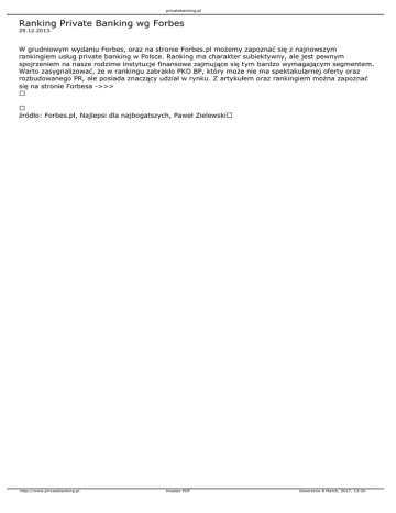 privatebanking.pl Ranking Private Banking wg Forbes 29.12.2013. W grudniowym wydaniu Forbes, oraz na stronie Forbes.pl możemy zapoznać się z najnowszym rankingiem usług private banking w Polsce. Ranking ma charakter subiektywny, ale jest pewnym spojrzeniem na nasze rodzime instytucje finansowe zajmujące się tym bardzo wymagającym segmentem. Warto zasygnalizować, że w rankingu zabrakło PKO BP, który może nie ma spektakularnej oferty oraz rozbudowanego PR, ale posiada znaczący udział w rynku. Z artykułem oraz rankingiem można zapoznać się na stronie Forbesa ->>> źródło: Forbes.pl, Najlepsi dla najbogatszych, Paweł Zielewski http://www.privatebanking.pl Kreator PDF Utworzono 8 March, 2017, 13:20
