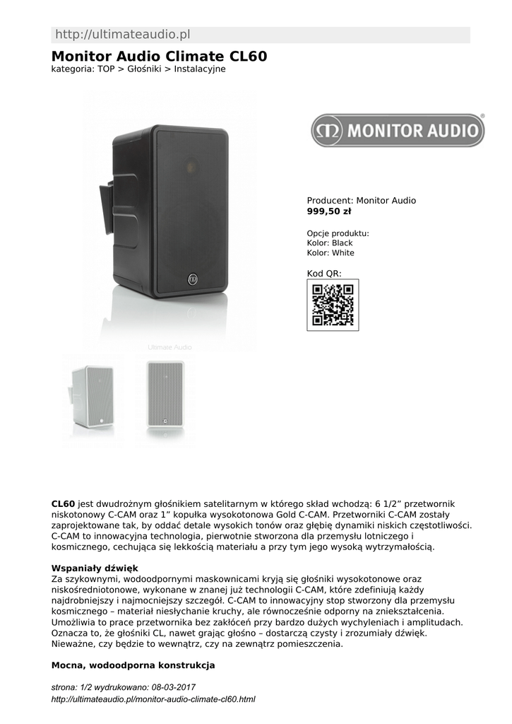 http://ultimateaudio.pl Monitor Audio Climate CL60 kategoria: TOP > Głośniki > Instalacyjne Producent: Monitor Audio 999,50 zł Opcje produktu: Kolor: Black Kolor: White Kod QR: CL60 jest dwudrożnym głośnikiem satelitarnym w którego skład wchodzą: 6 1/2” przetwornik niskotonowy C-CAM oraz 1” kopułka wysokotonowa Gold C-CAM. Przetworniki C-CAM zostały zaprojektowane tak, by oddać detale wysokich tonów oraz głębię dynamiki niskich częstotliwości. C-CAM to innowacyjna technologia, pierwotnie stworzona dla przemysłu lotniczego i kosmicznego, cechująca się lekkością materiału a przy tym jego wysoką wytrzymałością. Wspaniały dźwięk Za szykownymi, wodoodpornymi maskownicami kryją się głośniki wysokotonowe oraz niskośredniotonowe, wykonane w znanej już technologii C-CAM, które zdefiniują każdy najdrobniejszy i najmocniejszy szczegół. C-CAM to innowacyjny stop stworzony dla przemysłu kosmicznego – materiał niesłychanie kruchy, ale równocześnie odporny na zniekształcenia. Umożliwia to prace przetwornika bez zakłóceń przy bardzo dużych wychyleniach i amplitudach. Oznacza to, że głośniki CL, nawet grając głośno – dostarczą czysty i zrozumiały dźwięk. Nieważne, czy będzie to wewnątrz, czy na zewnątrz pomieszczenia. Mocna, wodoodporna konstrukcja strona: 1/2 wydrukowano: 08-03-2017 http://ultimateaudio.pl/monitor-audio-climate-cl60.html Można polegać na obudowie głośników, która chroni je przed czynnikami atmosferycznymi na zewnątrz. Szczelnie zamknięta i solidna obudowa o wysokiej wytrzymałości wykonana jest z polipropylenu i przetestowana na działanie zwiększonej wilgotności oraz długotrwałego działania promieni UV. Aluminiowe grille oraz uchwyty chronią przed niepożądanym kurzem. Wspaniały styl Niewielkie głośniki serii CL są dostępne w kolorach czarnym i białym. Dodatkowy atut to możliwość pomalowania ich na kolor, dostosowując je do reszty wystroju. Wszechstronność w instalacji Kluczową zaletą głośników CL jest ich wszechstronność i łatwość zainstalowania. Każdy uchwyt do mocowania głośników umożliwia jego pionowy i poziomy (175 stopni) przechył. Magnetyczne zaślepki chronią chronią zaczepy uchwytu na górze i dole głośnika i są łatwo ściągalne dla ponownego ich ustawienia. Znakomity bas Jakość dźwięku na zewnątrz pomieszczenia jest optymalizowana przez membranę niskotonową ABR, która dostarcza jeszcze głębszego basu i chroni również wnętrze przed czynnikami atmosferycznymi. Technologia: Szybka, łatwa instalacja Wysokiej klasy przetwornik wysokotonowy C-CAM, oraz przetwornik niskotonowy Solidna obudowa z propylenu o dużej gęstości, zapewniająca ochronę przed czynnikami atmosferycznymi i promieniowaniem słonecznym UV Pełna elastyczność montażu: uchwyt obracający się o 175º (dzięki dodatkowym otworom oraz odpowiedniemu wyprofilowaniu umożliwiają one także mocowanie w rogach pomieszczenia) Dodatkowy element ścięty pod kątem 15º daje dodatkowe możliwości przy montażu uchwytów Hak dla łańcuszka zabezpieczającego Membrana bierna ABR (Auxiliary Bass Radiator) zapewnia niskie zejście basu Aluminiowe maskownice nigdy nie zardzewieją Białe lub czarne wykończenie, możliwość pomalowania na inny kolor Znaczek z logo Monitor Audio można obrócić w zależności od ustawienia, pionowego lub poziomego, głośnika. Pasmo przenoszenia: Czułość (1W@1m): Nominalna impedancja: Maksymalne S.P.L: Moc (RMS): Rekomendowana moc wzmacniacza (RMS): Przetworniki: Wymiary: (H x W x D) Wymiary: (H x W x D) Całkowita Głębokość (wraz uchwytem ściennym) mm (inches): Dostępne wykończenia: Waga: kg (lbs) strona: 2/2 wydrukowano: 08-03-2017 http://ultimateaudio.pl/monitor-audio-climate-cl60.html 63Hz - 30KHz 88 dB 8 ohms 108.8 100W 15 - 100W 1 x 165mm (6 1/2”) C-CAM® średnio-niskotono 1 x 25mm (1”) pozłacany C-CAM® wysokotono 325 x 185 x 178.5 mm 12 13/16 x 7 5/16 x 7 in 235 (9 1/4) White/Black 4.62 (10.16)