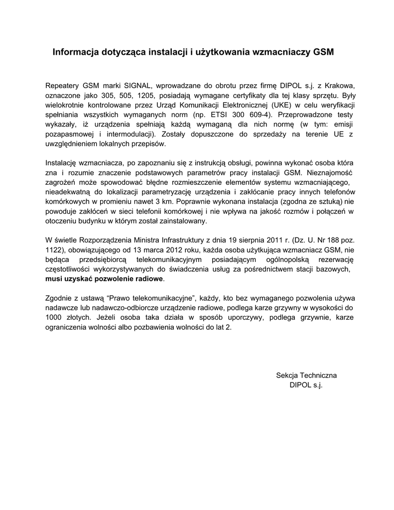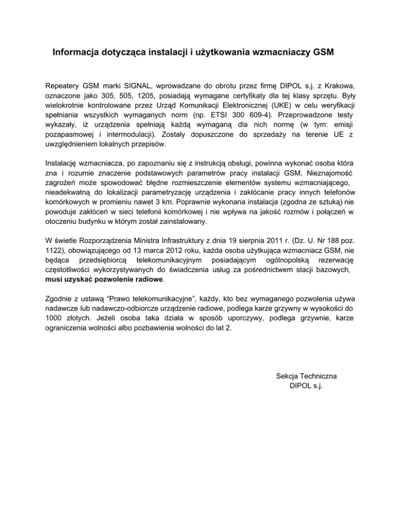 Informacja dotycząca instalacji i użytkowania wzmacniaczy GSM Repeatery GSM marki SIGNAL, wprowadzane do obrotu przez firmę DIPOL s.j. z Krakowa, oznaczone jako 305, 505, 1205, posiadają wymagane certyfikaty dla tej klasy sprzętu. Były wielokrotnie kontrolowane przez Urząd Komunikacji Elektronicznej (UKE) w celu weryfikacji spełniania wszystkich wymaganych norm (np. ETSI 300 6094). Przeprowadzone testy wykazały, iż urządzenia spełniają każdą wymaganą dla nich normę (w tym: emisji pozapasmowej i intermodulacji). Zostały dopuszczone do sprzedaży na terenie UE z uwzględnieniem lokalnych przepisów. Instalację wzmacniacza, po zapoznaniu się z instrukcją obsługi, powinna wykonać osoba która zna i rozumie znaczenie podstawowych parametrów pracy instalacji GSM. Nieznajomość zagrożeń może spowodować błędne rozmieszczenie elementów systemu wzmacniającego, nieadekwatną do lokalizacji parametryzację urządzenia i zakłócanie pracy innych telefonów komórkowych w promieniu nawet 3 km. Poprawnie wykonana instalacja (zgodna ze sztuką) nie powoduje zakłóceń w sieci telefonii komórkowej i nie wpływa na jakość rozmów i połączeń w otoczeniu budynku w którym został zainstalowany. W świetle Rozporządzenia Ministra Infrastruktury z dnia 19 sierpnia 2011 r. (Dz. U. Nr 188 poz. 1122), obowiązującego od 13 marca 2012 roku, każda osoba użytkująca wzmacniacz GSM, nie będąca przedsiębiorcą telekomunikacyjnym posiadającym ogólnopolską rezerwację częstotliwości wykorzystywanych do świadczenia usług za pośrednictwem stacji bazowych, musi uzyskać pozwolenie radiowe. Zgodnie z ustawą “Prawo telekomunikacyjne”, każdy, kto bez wymaganego pozwolenia używa nadawcze lub nadawczoodbiorcze urządzenie radiowe, podlega karze grzywny w wysokości do 1000 złotych. Jeżeli osoba taka działa w sposób uporczywy, podlega grzywnie, karze ograniczenia wolności albo pozbawienia wolności do lat 2. Sekcja Techniczna DIPOL s.j.
