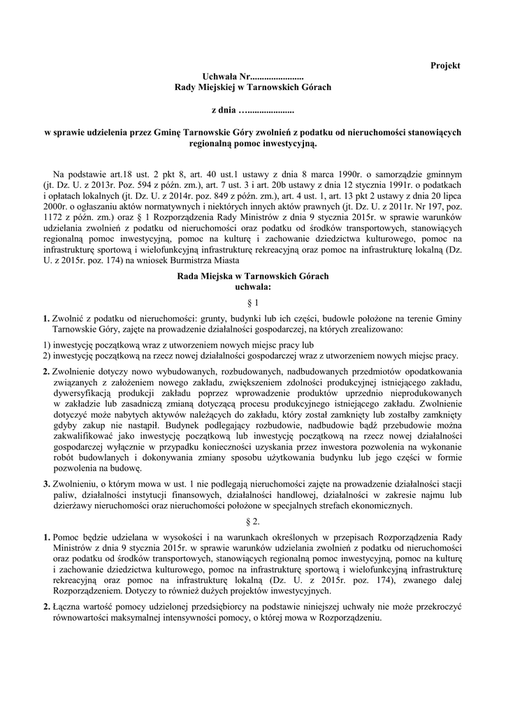 Projekt Uchwała Nr....................... Rady Miejskiej w Tarnowskich Górach z dnia ….................... w sprawie udzielenia przez Gminę Tarnowskie Góry zwolnień z podatku od nieruchomości stanowiących regionalną pomoc inwestycyjną. Na podstawie art.18 ust. 2 pkt 8, art. 40 ust.1 ustawy z dnia 8 marca 1990r. o samorządzie gminnym (jt. Dz. U. z 2013r. Poz. 594 z późn. zm.), art. 7 ust. 3 i art. 20b ustawy z dnia 12 stycznia 1991r. o podatkach i opłatach lokalnych (jt. Dz. U. z 2014r. poz. 849 z późn. zm.), art. 4 ust. 1, art. 13 pkt 2 ustawy z dnia 20 lipca 2000r. o ogłaszaniu aktów normatywnych i niektórych innych aktów prawnych (jt. Dz. U. z 2011r. Nr 197, poz. 1172 z późn. zm.) oraz § 1 Rozporządzenia Rady Ministrów z dnia 9 stycznia 2015r. w sprawie warunków udzielania zwolnień z podatku od nieruchomości oraz podatku od środków transportowych, stanowiących regionalną pomoc inwestycyjną, pomoc na kulturę i zachowanie dziedzictwa kulturowego, pomoc na infrastrukturę sportową i wielofunkcyjną infrastrukturę rekreacyjną oraz pomoc na infrastrukturę lokalną (Dz. U. z 2015r. poz. 174) na wniosek Burmistrza Miasta Rada Miejska w Tarnowskich Górach uchwala: §1 1. Zwolnić z podatku od nieruchomości: grunty, budynki lub ich części, budowle położone na terenie Gminy Tarnowskie Góry, zajęte na prowadzenie działalności gospodarczej, na których zrealizowano: 1) inwestycję początkową wraz z utworzeniem nowych miejsc pracy lub 2) inwestycję początkową na rzecz nowej działalności gospodarczej wraz z utworzeniem nowych miejsc pracy. 2. Zwolnienie dotyczy nowo wybudowanych, rozbudowanych, nadbudowanych przedmiotów opodatkowania związanych z założeniem nowego zakładu, zwiększeniem zdolności produkcyjnej istniejącego zakładu, dywersyfikacją produkcji zakładu poprzez wprowadzenie produktów uprzednio nieprodukowanych w zakładzie lub zasadniczą zmianą dotyczącą procesu produkcyjnego istniejącego zakładu. Zwolnienie dotyczyć może nabytych aktywów należących do zakładu, który został zamknięty lub zostałby zamknięty gdyby zakup nie nastąpił. Budynek podlegający rozbudowie, nadbudowie bądź przebudowie można zakwalifikować jako inwestycję początkową lub inwestycję początkową na rzecz nowej działalności gospodarczej wyłącznie w przypadku konieczności uzyskania przez inwestora pozwolenia na wykonanie robót budowlanych i dokonywania zmiany sposobu użytkowania budynku lub jego części w formie pozwolenia na budowę. 3. Zwolnieniu, o którym mowa w ust. 1 nie podlegają nieruchomości zajęte na prowadzenie działalności stacji paliw, działalności instytucji finansowych, działalności handlowej, działalności w zakresie najmu lub dzierżawy nieruchomości oraz nieruchomości położone w specjalnych strefach ekonomicznych. § 2. 1. Pomoc będzie udzielana w wysokości i na warunkach określonych w przepisach Rozporządzenia Rady Ministrów z dnia 9 stycznia 2015r. w sprawie warunków udzielania zwolnień z podatku od nieruchomości oraz podatku od środków transportowych, stanowiących regionalną pomoc inwestycyjną, pomoc na kulturę i zachowanie dziedzictwa kulturowego, pomoc na infrastrukturę sportową i wielofunkcyjną infrastrukturę rekreacyjną oraz pomoc na infrastrukturę lokalną (Dz. U. z 2015r. poz. 174), zwanego dalej Rozporządzeniem. Dotyczy to również dużych projektów inwestycyjnych. 2. Łączna wartość pomocy udzielonej przedsiębiorcy na podstawie niniejszej uchwały nie może przekroczyć równowartości maksymalnej intensywności pomocy, o której mowa w Rozporządzeniu. § 3. Udzielana pomoc może być obliczana w odniesieniu do: 1) kosztów inwestycji w rzeczowe aktywa trwałe lub wartości niematerialne i prawne, które są związane z realizacją inwestycji początkowej lub inwestycji początkowej na rzecz nowej działalności gospodarczej , lub 2) szacunkowych kosztów płacy wynikających z utworzenia miejsc pracy w następstwie inwestycji początkowej lub inwestycji początkowej na rzecz nowej działalności gospodarczej, obliczonych za okres dwóch lat, przy czym koszt przypadający na jedno miejsce pracy nie może być wyższy niż 10 000 zł. § 4. 1. Podmiot zamierzający ubiegać się o zwolnienie z podatku od nieruchomości, o którym mowa w § 1, zobowiązany jest dokonać zgłoszenia zamiaru korzystania z regionalnej pomocy inwestycyjnej na formularzu, którego wzór stanowi Załącznik nr 1 do niniejszej uchwały, wraz z wymaganymi załącznikami, przed rozpoczęciem prac związanych z realizacją inwestycji początkowej lub inwestycji początkowej na rzecz nowej działalności gospodarczej, najpóźniej do dnia 31 grudnia 2017r. 2. Za datę dokonania zgłoszenia uważa się datę wpływu formularza – o którym mowa w ust. 1, do Urzędu Miejskiego w Tarnowskich Górach. § 5. 1. Zwolnienie z podatku od nieruchomości, o którym mowa w § 1, przysługuje : 1) przy spełnieniu łącznie następujących warunków: a) nieposiadania zaległości z tytułu podatków i opłat lokalnych w dniu dokonania zgłoszenia oraz dodatkowo w ostatnim dniu miesiąca poprzedzającego miesiąc, od którego zacznie obowiązywać zwolnienie, b) rozpoczęcia prac związanych z realizacją inwestycji początkowej lub inwestycji początkowej na rzecz nowej działalności gospodarczej w terminie do dwunastu miesięcy, liczonego od dnia dokonania zgłoszenia, c) zakończenia inwestycji początkowej lub inwestycji początkowej na rzecz nowej działalności gospodarczej w okresie nieprzekraczającym 3 lat, liczonym od dnia rozpoczęcia prac związanych z realizacją inwestycji początkowej lub inwestycji początkowej na rzecz nowej działalności gospodarczej, d) utworzenia nowych miejsc pracy w następstwie prac związanych z realizacją inwestycji początkowej lub inwestycji początkowej na rzecz nowej działalności gospodarczej w okresie 2 lat od zakończenia inwestycji. 2) od 