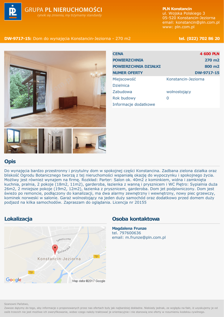 PLN Konstancin ul. Wojska Polskiego 3 05-520 Konstancin-Jeziorna email: [email protected] www: pln.com.pl DW-9717-15: Dom do wynajęcia Konstancin-Jeziorna - 270 m2 tel. (022) 702 86 20 CENA 4 600 PLN POWIERZCHNIA 270 m2 POWIERZCHNIA DZIAŁKI 800 m2 NUMER OFERTY Miejscowość DW-9717-15 Konstancin-Jeziorna Dzielnica Zabudowa wolnostojący Rok budowy 0 Informacje dodatkowe Opis Do wynajęcia bardzo przestronny i przytulny dom w spokojnej części Konstancina. Zadbana zielona działka oraz bliskość Ogrodu Botanicznego tworzą z tej nieruchomości wspaniałą okazję do wypoczynku i spokojnego życia. Możliwy jest również wynajem na firmę. Rozkład: Parter: Salon ok. 40m2 z kominkiem, widna i zamknięta kuchnia, pralnia, 2 pokoje (18m2, 11m2), garderoba, łazienka z wanną i prysznicem i WC Piętro: Sypialnia duża 26m2, 2 mniejsze pokoje (19m2, 12m2), łazienka z prysznicem, garderoba. Dom jet podpiwniczony. Dom jest świeżo po remoncie, podłączony do kanalizacji, ma dwa alarmy zewnętrzny i wewnętrzny, nowy piec grzewczy, kominek norweski w salonie. Garaż wolnostojący na jeden duży samochód oraz dodatkowo przed domem duży podjazd na kilka samochodów. Zapraszam do oglądania. Licencja nr 20155 Lokalizacja Osoba kontaktowa Magdalena Frunze tel. 797600636 email: [email protected] Szanowni Państwo, Zawsze dążymy do tego, aby informacje o proponowanych przez nas ofertach były jak najbardziej dokładne. Niekiedy jednak, ze względu na fakt, iż uzyskujemy je od osób trzecich nie jest możliwe ich zweryfikowanie, wobec czego należy traktować je orientacyjnie i nie stanowią one oferty w rozumieniu kodeksu cywilnego.