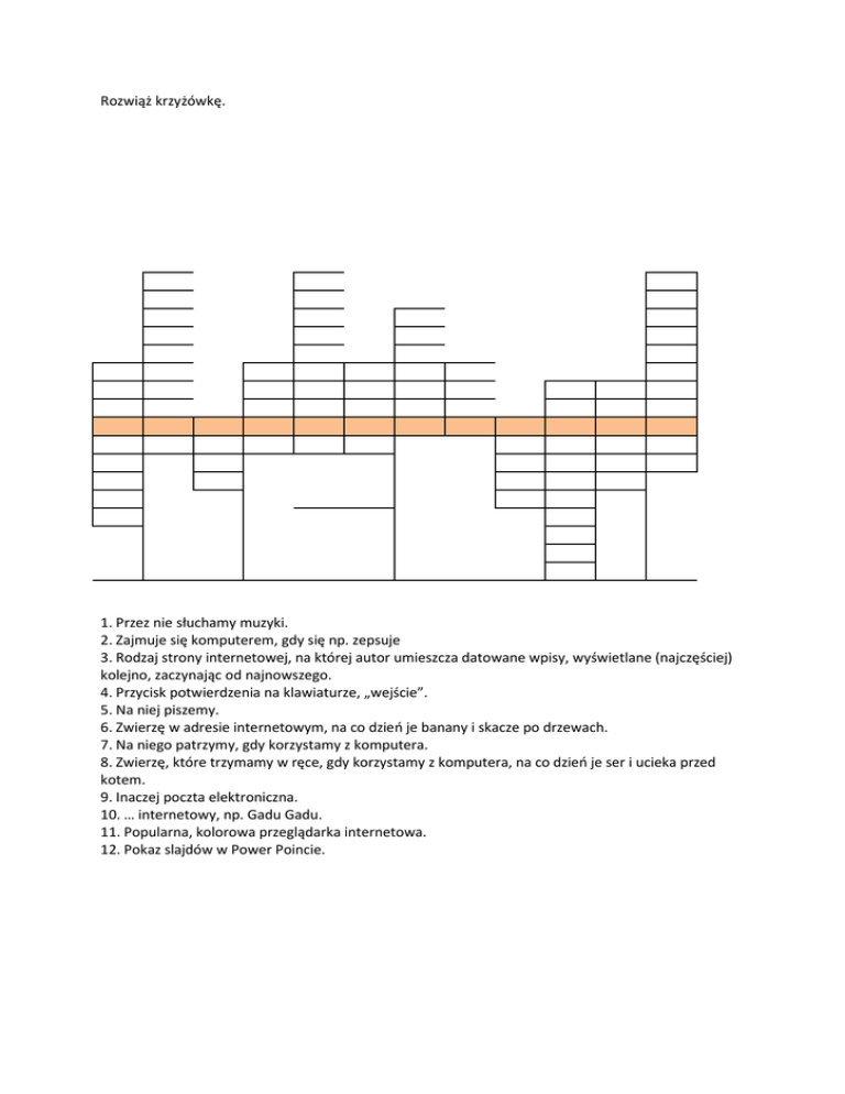 Rozwiąż krzyżówkę. 1. Przez nie słuchamy muzyki. 2. Zajmuje się komputerem, gdy się np. zepsuje 3. Rodzaj strony internetowej, na której autor umieszcza datowane wpisy, wyświetlane (najczęściej) kolejno, zaczynając od najnowszego. 4. Przycisk potwierdzenia na klawiaturze, „wejście”. 5. Na niej piszemy. 6. Zwierzę w adresie internetowym, na co dzień je banany i skacze po drzewach. 7. Na niego patrzymy, gdy korzystamy z komputera. 8. Zwierzę, które trzymamy w ręce, gdy korzystamy z komputera, na co dzień je ser i ucieka przed kotem. 9. Inaczej poczta elektroniczna. 10. … internetowy, np. Gadu Gadu. 11. Popularna, kolorowa przeglądarka internetowa. 12. Pokaz slajdów w Power Poincie. S Ł U C H A W K I I N F O R M A T Y K B L O G E N T E R K L A W I A T U R A M A Ł P A M O N I T O R M Y S Z E M A I L K O M U N I K A T O R G O O G L E P R E Z E N T A C J A