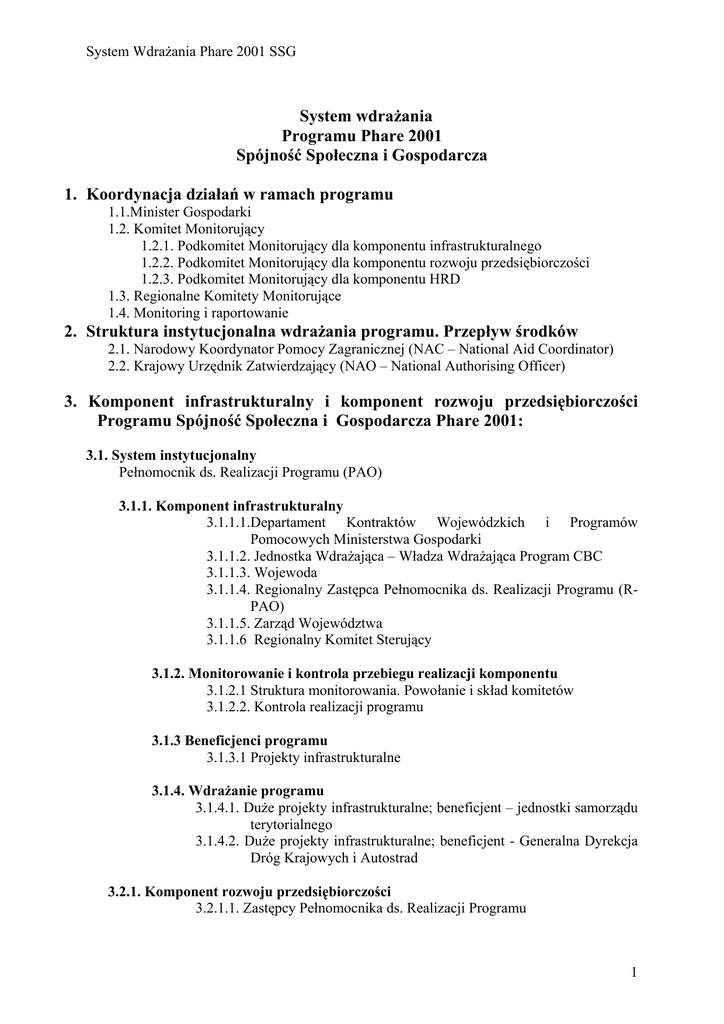 System Wdrażania Phare 2001 SSG System wdrażania Programu Phare 2001 Spójność Społeczna i Gospodarcza 1. Koordynacja działań w ramach programu 1.1.Minister Gospodarki 1.2. Komitet Monitorujący 1.2.1. Podkomitet Monitorujący dla komponentu infrastrukturalnego 1.2.2. Podkomitet Monitorujący dla komponentu rozwoju przedsiębiorczości 1.2.3. Podkomitet Monitorujący dla komponentu HRD 1.3. Regionalne Komitety Monitorujące 1.4. Monitoring i raportowanie 2. Struktura instytucjonalna wdrażania programu. Przepływ środków 2.1. Narodowy Koordynator Pomocy Zagranicznej (NAC – National Aid Coordinator) 2.2. Krajowy Urzędnik Zatwierdzający (NAO – National Authorising Officer) 3. Komponent infrastrukturalny i komponent rozwoju przedsiębiorczości Programu Spójność Społeczna i Gospodarcza Phare 2001: 3.1. System instytucjonalny Pełnomocnik ds. Realizacji Programu (PAO) 3.1.1. Komponent infrastrukturalny 3.1.1.1.Departament Kontraktów Wojewódzkich i Programów Pomocowych Ministerstwa Gospodarki 3.1.1.2. Jednostka Wdrażająca – Władza Wdrażająca Program CBC 3.1.1.3. Wojewoda 3.1.1.4. Regionalny Zastępca Pełnomocnika ds. Realizacji Programu (RPAO) 3.1.1.5. Zarząd Województwa 3.1.1.6 Regionalny Komitet Sterujący 3.1.2. Monitorowanie i kontrola przebiegu realizacji komponentu 3.1.2.1 Struktura monitorowania. Powołanie i skład komitetów 3.1.2.2. Kontrola realizacji programu 3.1.3 Beneficjenci programu 3.1.3.1 Projekty infrastrukturalne 3.1.4. Wdrażanie programu 3.1.4.1. Duże projekty infrastrukturalne; beneficjent – jednostki samorządu terytorialnego 3.1.4.2. Duże projekty infrastrukturalne; beneficjent - Generalna Dyrekcja Dróg Krajowych i Autostrad 3.2.1. Komponent rozwoju przedsiębiorczości 3.2.1.1. Zastępcy Pełnomocnika ds. Realizacji Programu 1 System Wdrażania Phare 2001 SSG 3.2.1.2. Departament Rzemiosła, Małych i Średnich Przedsiębiorstw Ministerstwa Gospodarki 3.2.1.3. Jednostka Wdrażająca – Polska Agencja Rozwoju Przedsiębiorczości (PARP) 3.2.1.4. Regionalne Instytucje Finansujące 3.2.1.5. Wojewoda 3.2.2 Monitorowanie i kontrola przebiegu realizacji komponentu 3.2.2.1 Struktura monitorowania. Powołanie i skład komitetów. Podkomitet Monitorujący 3.2.2.2. Kontrola realizacji programu 3.2.3. Beneficjenci programu 3.2.4. Wdrażanie programu 4 Komponent rozwoju zasobów ludzkich Programu Spójność Społeczno – Gospodarcza Phare 2001 4.1. System instytucjonalny 4.1.1. Pełnomocnik ds. Realizacji Programu – komponent rozwoju zasobów ludzkich (PAO-HRD) 4.1.2. Zastępcy PAO-HRD 4.1.3. Departament Programów Przedakcesyjnych i Strukturalnych Ministerstwa Pracy i Polityki Społecznej 4.1.4. Jednostka Wdrażająca – Polska Agencja Rozwoju Przedsiębiorczości (PARP) 4.1.5. Wojewoda 4.1.6. Zarząd Województwa; WUP 4.2. Monitorowanie i kontrola przebiegu realizacji komponentu 4.2.1 Monitoring 4.2.2. Kontrola 4.3. Beneficjenci programu 4.3.1. Projekty w zakresie rozwoju zasobów ludzkich 4.4. Wdrażanie programu 4.4.1. Wsparcie rozwoju zasobów ludzkich 2 System Wdrażania Phare 2001 SSG 1 Koordynacja działań w ramach programu Całość działań związanych z wdrażaniem programów współfinansowanych ze środków Unii Europejskiej nadzoruje Wspólny Komitet Monitorujący –Joint Monitoring Committee (JMC). 1.1. Minister Gospodarki Ministrem właściwym ds. rozwoju regionalnego (ds. realizacji Programu Spójność Społeczno – Gospodarcza Phare 2001) jest Minister Gospodarki Minister Gospodarki koordynuje na bieżąco wszystkie działania związane bezpośrednio z realizacją polityki regionalnej państwa, w tym kolejne edycje programów rozwoju regionalnego realizowanych w ramach Phare. Opracowuje projekty narodowej strategii rozwoju regionalnego państwa oraz projekty programów rozwoju regionalnego państwa i czuwa w imieniu Rządu RP nad przebiegiem negocjacji w sprawie zapisów wojewódzkich programów operacyjnych przedkładanych przez zarządy województw, a następnie odpowiada za monitorowanie i nadzór przebiegu realizacji programów rozwoju regionalnego. W celu sprawnej realizacji powyższych zadań Minister Gospodarki przedstawia Narodowemu Koordynatorowi Pomocy (NAC1) kandydata na Pełnomocnika ds. realizacji programu dla komponentów infrastrukturalnego i MŚP (PAO2). W przypadku komponentu rozwoju zasobów ludzkich (HRD) kandydata na Pełnomocnika ds realizacji programu (PAO – HRD) desygnuje Minister Pracy i Polityki Społecznej. 1. 2 Komitet Monitorujący Monitoring Programu na szczeblu krajowym sprawuje Komitet Monitorujący powołany na mocy aktu wykonawczego3 do Ustawy o zasadach wspierania rozwoju regionalnego. Jest to komitet monitorujący Kontrakty Wojewódzkie, których elementem jest program Phare 2001 SSG. W posiedzeniach Komitetu uczestniczy, jako obserwator, delegowany przedstawiciel Komisji Europejskiej oraz przedstawiciele Jednostek Wdrażających. W posiedzeniach Komitetu mogą również uczestniczyć w charakterze obserwatorów przedstawiciele innych urzędów centralnych i instytucji, których działalność może mieć istotne znaczenie dla postępów w realizacji programu, ale które nie są bezpośrednio odpowiedzialne za wdrażanie jego komponentów. Za przygotowanie dokumentacji związanej z monitorowaniem programu, przygotowanie raportów i sprawozdań z obrad Komitetu Monitorującego odpowiada Sekretariat Komitetu Monitorującego, który jest obsługiwany przez Departament Kontraktów Wojewódzkich i Programów Pomocowych Ministerstwa Gospodarki.. Komitet Monitorujący będzie informował Komitet Integracji Europejskiej oraz Wspólny Komitet Monitorujący (JMC) o stanie realizacji programu. 1 NAC – skrót od angielskiej nazwy National Aid Co-ordinator PAO - skrót od angielskiej nazwy Programme Authorising Officer 3 Rozporządzenie Rady Ministrów w sprawie przyjęcia Programu wsparcia na lata 2001 i 2002, Dz.U. Nr 122, poz 1326 z 2000 r. i Dz.U. Nr 39, poz. 459 z 2001 r. 2 3 System 