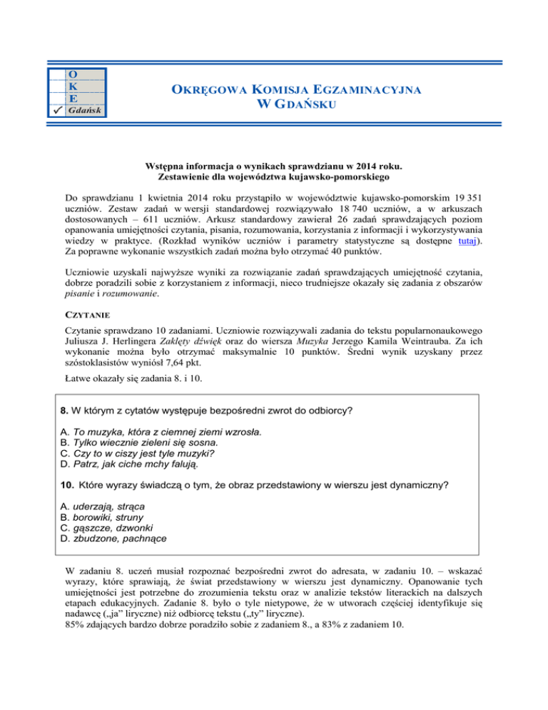 O K E OKRĘGOWA KOMISJA EGZAMINACYJNA W G DAŃSKU Gdańsk Wstępna informacja o wynikach sprawdzianu w 2014 roku. Zestawienie dla województwa kujawsko-pomorskiego Do sprawdzianu 1 kwietnia 2014 roku przystąpiło w województwie kujawsko-pomorskim 19 351 uczniów. Zestaw zadań w wersji standardowej rozwiązywało 18 740 uczniów, a w arkuszach dostosowanych – 611 uczniów. Arkusz standardowy zawierał 26 zadań sprawdzających poziom opanowania umiejętności czytania, pisania, rozumowania, korzystania z informacji i wykorzystywania wiedzy w praktyce. (Rozkład wyników uczniów i parametry statystyczne są dostępne tutaj). Za poprawne wykonanie wszystkich zadań można było otrzymać 40 punktów. Uczniowie uzyskali najwyższe wyniki za rozwiązanie zadań sprawdzających umiejętność czytania, dobrze poradzili sobie z korzystaniem z informacji, nieco trudniejsze okazały się zadania z obszarów pisanie i rozumowanie. CZYTANIE Czytanie sprawdzano 10 zadaniami. Uczniowie rozwiązywali zadania do tekstu popularnonaukowego Juliusza J. Herlingera Zaklęty dźwięk oraz do wiersza Muzyka Jerzego Kamila Weintrauba. Za ich wykonanie można było otrzymać maksymalnie 10 punktów. Średni wynik uzyskany przez szóstoklasistów wyniósł 7,64 pkt. Łatwe okazały się zadania 8. i 10. 8. W którym z cytatów występuje bezpośredni zwrot do odbiorcy? A. To muzyka, która z ciemnej ziemi wzrosła. B. Tylko wiecznie zieleni się sosna. C. Czy to w ciszy jest tyle muzyki? D. Patrz, jak ciche mchy falują. 10. Które wyrazy świadczą o tym, że obraz przedstawiony w wierszu jest dynamiczny? A. uderzają, strąca B. borowiki, struny C. gąszcze, dzwonki D. zbudzone, pachnące W zadaniu 8. uczeń musiał rozpoznać bezpośredni zwrot do adresata, w zadaniu 10. – wskazać wyrazy, które sprawiają, że świat przedstawiony w wierszu jest dynamiczny. Opanowanie tych umiejętności jest potrzebne do zrozumienia tekstu oraz w analizie tekstów literackich na dalszych etapach edukacyjnych. Zadanie 8. było o tyle nietypowe, że w utworach częściej identyfikuje się nadawcę („ja” liryczne) niż odbiorcę tekstu („ty” liryczne). 85% zdających bardzo dobrze poradziło sobie z zadaniem 8., a 83% z zadaniem 10. Umiarkowanie trudne w obszarze czytania okazało się zadanie 4. 4. Pierwsze próby uruchomienia urządzenia były nieudane, ponieważ Bell A. nie miał odpowiednich narzędzi. B. użył niewłaściwego materiału. C. za mało wiedział o elektryczności. D. nie znał szczegółów budowy ucha. Uczeń miał wskazać poprawną odpowiedź na podstawie informacji zawartych w tekście „Zaklęty dźwięk”. Aby rozwiązać to zadanie, zdający powinien najpierw wyszukać odpowiedni akapit, ustalić przyczyny niepowodzeń pierwszych prób uruchomienia urządzenia Bella, a następnie na podstawie uzyskanych informacji wskazać sformułowany wniosek. 63% zdających poradziło sobie z tym zadaniem. PISANIE Pisanie sprawdzano dwoma zadaniami, z których jedno polegało na zredagowaniu ogłoszenia o zbiórce książek i zabawek przeznaczonych na loterię, a drugie – na napisaniu opowiadania. Za ich wykonanie uczeń mógł otrzymać maksymalnie 10 punktów. Średni wynik, jaki uczniowie uzyskali za tę umiejętność, wyniósł 5,57 pkt. 25. Samorząd szkolny organizuje zbiórkę książek i zabawek przeznaczonych na loterię. Napisz ogłoszenie o tej zbiórce. Zadanie 25. sprawdzało umiejętność redagowania krótkiej formy użytkowej – ogłoszenia i poprawność ortograficzną wypowiedzi. Okazało się ono umiarkowanie trudne – uczniowie uzyskali średnio 60% punktów możliwych do zdobycia. Najczęściej pomijane wyznaczniki ogłoszenia to informacje o terminie i miejscu zbiórki przedmiotów przeznaczonych na loterię (np. brak wskazania osoby, do której można przynosić przedmioty lub określenia sposobu przekazywania tych przedmiotów przedstawicielom samorządu). 26. Co dwie głowy, to nie jedna. Napisz opowiadanie, którego bohaterowie wspólnie znajdują rozwiązanie jakiegoś problemu. Zadaniem 26. sprawdzano umiejętności: • pisania opowiadania na zadany temat, • dostosowywania stylu do treści i formy opowiadania, • przestrzegania norm gramatycznych, ortograficznych i interpunkcyjnych. Zadanie okazało się umiarkowanie trudne – uczniowie uzyskali średnio 55% punktów możliwych do zdobycia. Najwyższe wyniki uzyskali za treść i formę swoich opowiadań – 66% punktów, najniższe za interpunkcję – 49% punktów. Szóstoklasiści musieli napisać opowiadanie, w którym wykażą się zrozumieniem przysłowia „Co dwie głowy, to nie jedna”. Na ogół uczniowie poprawnie interpretowali powiedzenie i często traktowali je jako puentę swoich opowiadań. Styl opowiadań był zróżnicowany. Obok wypowiedzi odznaczających się stylem żywym, z wyraźną dbałością o dobór środków językowych służących urozmaiceniu narracji czy budowaniu nastroju, wiele było prac, których styl – choć poprawny – świadczył o ubóstwie słownictwa (liczne powtórzenia, monotonia składniowa). ROZUMOWANIE Rozumowanie sprawdzano czterema zadaniami. Uczeń mógł uzyskać za ich rozwiązanie maksymalnie 8 punktów. Średni wynik w tym obszarze wyniósł 4,35 pkt. Najłatwiejsze w obszarze rozumowania okazało się zadanie 24. 24. Wiola i Jola poszły na spacer z przystani do latarni morskiej. W ciągu każdych 5 minut pokonywały 300 metrów. Spacer trwał pół godziny. Ile metrów przeszły dziewczynki z przystani do latarni morskiej? Sprawdzano, czy szóstoklasiści potrafią rozpoznać charakterystyczne cechy i własności liczb. Uczniowie powinni wykazać się umiejętnością analizy tekstu i myśleniem przyczynowo-skutkowym. Aby udzielić poprawnej odpowiedzi, należało zauważyć, jeżeli przez każde 5 minut dziewczęta pokonywały 300 metrów, to przez pół godziny – odległość sześć razy większą, czyli 1800 m. Za rozwiązanie zadania uczniow