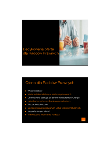 Dedykowana oferta dla Radców Prawnych Oferta dla Radców Prawnych Wysokie rabaty Multimedialne telefony w atrakcyjnych cenach Dedykowana obsługa po stronie konsultantów Orange Unikalna forma komunikacja w ramach oferty Wsparcie techniczne Dostęp do zaawansowanych usług teleinformatycznych Nagrody niespodzianki Indywidualna infolinia dla Radców Wysokie rabaty rabat cena abonamentu po rabacie plany taryfowe cena abonamentu Optymalny 100 30,00 zł 24,00 zł Optymalny 250 60,00 zł 48,00 zł 79,20 zł Optymalny 450 99,00 zł Optymalny 450 z internetem* 114,00 zł Optymalny 900 180,00 zł Optymalny 900 z internetem* 195,00 zł 156,00 zł Optymalny 1800 324,00 zł 259,20 zł 20% 91,20 zł 144,00 zł Optymalny 1800 z 339,00 zł 271,20 zł internetem* * W abonamentach z internetem zawarte są usługi: Orange Hotspot oraz usługa Business Everywhere Mini 2GB Multimedialne telefony Iphone tańszy dla radców nawet 200,00 PLN netto w wybranych planach taryfowych. Nokia N8 tańsza dla radców nawet 300,00 PLN netto w wybranych planach taryfowych. Oraz wiele innych aparatów w specjalnych cenach. Cechy charakterystyczne oferty ■ Nieograniczone Rozmowy dla Radców – możliwość wykonywania bezpłatnych połączeń pomiędzy numerami w ramach otoczenia grupy Krajowej Rady Radców Prawnych. ■ Dedykowana Infolinia dostępna tylko dla Radców 501 020 440 lub e-mail: [email protected] ■ Indywidualne dopasowanie oferty ■ Bardzo atrakcyjne nagrody niespodzianki Dodatki VIP-owska oferta na Tablety: Apple Ipad, Huawei S7, Samsung Tab VIP-owska oferta na Netbooki z wbudowanym modemem Pakiety e-maili w telefonie Wirtualne Centrale telefoniczne zintegrowane z siecią Orange. VIP Ipad 16 GB + modem 3G Tablet Ipad w cenie 1,00 PLN netto Umowa na 36 miesięcy 35GB danych transmisji miesięcznie Abonament przez 8 miesięcy 1,00 PLN netto (Taniej o 198,00 miesięcznie) Kolejne 28 miesięcy 120,00 PLN netto (Taniej o 77,00 netto miesięcznie) Dodatkowo pakiet 120 minut do Orange na konto Dodatkowo Orange HOTSPOT – bezpłatnie Aktywacja 50,00 PLN netto przyszłość jest jasna, przyszłość to Orange