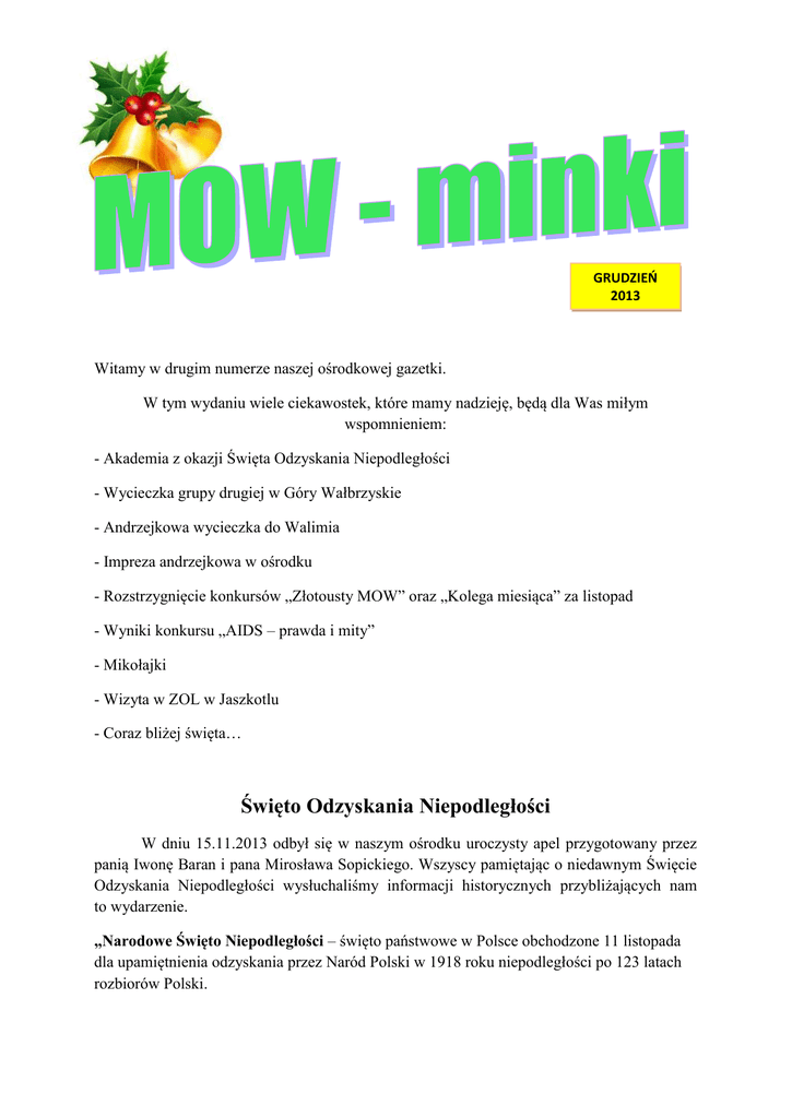 GRUDZIEŃ 2013 NR 2 Witamy w drugim numerze naszej ośrodkowej gazetki. W tym wydaniu wiele ciekawostek, które mamy nadzieję, będą dla Was miłym wspomnieniem: - Akademia z okazji Święta Odzyskania Niepodległości - Wycieczka grupy drugiej w Góry Wałbrzyskie - Andrzejkowa wycieczka do Walimia - Impreza andrzejkowa w ośrodku - Rozstrzygnięcie konkursów „Złotousty MOW” oraz „Kolega miesiąca” za listopad - Wyniki konkursu „AIDS – prawda i mity” - Mikołajki - Wizyta w ZOL w Jaszkotlu - Coraz bliżej święta… Święto Odzyskania Niepodległości W dniu 15.11.2013 odbył się w naszym ośrodku uroczysty apel przygotowany przez panią Iwonę Baran i pana Mirosława Sopickiego. Wszyscy pamiętając o niedawnym Święcie Odzyskania Niepodległości wysłuchaliśmy informacji historycznych przybliżających nam to wydarzenie. „Narodowe Święto Niepodległości – święto państwowe w Polsce obchodzone 11 listopada dla upamiętnienia odzyskania przez Naród Polski w 1918 roku niepodległości po 123 latach rozbiorów Polski. Odzyskiwanie przez Polskę niepodległości było procesem stopniowym. Wybór 11 listopada uzasadnić można zbiegiem wydarzeń w Polsce z zakończeniem I wojny światowej dzięki zawarciu rozejmu w Compiègne 11 listopada 1918, pieczętującego ostateczną klęskę Niemiec. Dzień wcześniej przybył do Warszawy Józef Piłsudski. W tych dwóch dniach, 10 i 11 listopada 1918, naród polski uświadomił sobie w pełni odzyskanie niepodległości, a nastrój głębokiego wzruszenia i entuzjazmu ogarnął kraj.”1 Uroczyście odśpiewany przez nas Hymn Polski wprowadził nas w poniosły nastrój, a zaopatrzeni w śpiewniki z dumą i radością śpiewaliśmy pieśni patriotyczne. Uroczysta chwila powagi, zadumy… 1 Źródło „Wikipedia” „…chłopcy malowani…” Wycieczka grupy drugiej w Góry Wałbrzyskie W dniach 16 – 17 listopad pan Mirosłwa Sopicki wraz z panem Andrzejem Stefański zorganizowali wycieczkę w Góry Suche, Krucze, Czarne i Wałbrzyskie. W pierwszy dzień wszyscy uczestnicy korzystając dobrej pogody wędrowali po malowniczych terenach naszego regionu. Po dotarciu do schroniska w Sokołowsku, zjedzeniu posiłku wszyscy udali się na zasłużony odpoczynek. Drugiego dnia nasi turyści wyruszyli w rejon najwyższych szczytów Gór Suchych -Suchawy, Kostrzyny i Waligóry. Cała wycieczka przebiegła bardzo pomyślnie, a wszyscy uczestnicy mieli możliwość podziwiania piękna natury, a także poznać ciekawe okolice. Jak w bajce, uroczo, pięknie, malowniczo… Szef kuchni poleca… Pod górkę i z górki, zdrowa ścieżka zdrowia. Andrzejkowa wycieczka do Walimia 23 listopada pod opieką pań Katarzyny Pawlikowskiej oraz Kingi Olejniczak odbyła się andrzejkowa wycieczka do Walimia. W czasie wycieczki zwiedziliśmy również Podziemny Kompleks Rzeczka. Mogliśmy niejako dotknąć części historii z czasów II wojny światowej, kiedy to w północno - zachodniej części Gór Sowich oraz w okolicach zamku Książ w Górach Wałbrzyskich, rozpoczęto prace górnicze i budowlane kompleksów "Rzeczka", "Jugowice Górne - Jawornik", "Włodarz", "Osówka", "Soboń", "Sokolec Gontowa" i "Książ". Podziemna trasa turystyczna w kompleksie "Rzeczka" jest pozostałością po jednym z najbardziej tajemniczych przedsięwzięć górniczych i budowlanych, prowadzonych w czasie II wojny światowej przez III Rzeszę w Górach Sowich. Kompleks ten położony jest na wschodnim zboczu góry Ostrej (653,3 m) między Walimiem a Rzeczką. Wewnątrz panuje stała temperatura w ciągu roku 5 - 7 °C. Całkowita długość wyrobisk podziemnych wynosi ok. 500 m, powierzchnia 2500 m2, a objętość 14 000 m3.2 Prawie jak czołgiści Po zwiedzaniu zjedliśmy obiad w Zespole Placówek Resocjalizacyjnych w Walimiu, gdzie odbyły się później wróżby andrzejkowe i dyskoteka. 2 Źródło www.sztolnie.pl Impreza andrzejkowa w ośrodku 30 listopada również u nas w placówce wróżbom i zabawie nie było końca. Panie Dorota Pawelec, Małgorzata Czech przygotowały wieczór pełen tajemnic i niespodzianek. W godzinach wieczornych, tuż po kolacji wychowankowie, wraz z pełniącymi w tym dniu dyżury wychowawcami, p. T. Janczak, p. K. Osiewałą oraz p. D. Pawelec, zgromadzili się na stołówce. Wstępem do wieczornej zabawy była prezentacja multimedialna, przedstawiająca historię wieczoru andrzejkowego oraz podająca przykłady wróżb. Po wyświetleniu prezentacji nadszedł czas na zabawę. Wychowankowie mogli sprawdzić imię swojej przyszłej żony, jak również otrzymać kilka wróżb dotyczących przyszłości każdego z nich. Wszyscy bardzo dobrze się bawili. Po wróżbach nadszedł czas na zabawę dyskotekową, w którą zaangażowali się prawie wszyscy, tylko nieliczni nie mieli ochoty na zabawę. Wieczór upłynął w spokojnej i radosnej atmosferze, a sami wychowankowie przyznali, że świetnie się bawili. W przygotowania do tego wieczorku zaangażowało się kilku wychowanków, m.in. Marcin Długosz (gr.II), Michał Łojkuc (gr. I), Sebastian Gwiszcz (gr. III), którzy bardzo dobrze wywiązali się z powierzonych zadań. Wyniki konkursu „Złotousty MOW” w miesiącu listopad Grupa I – Oskar Budziński Grupa II – Mateusz Kogut Grupa III – Krystian Miśkowiec Wyniki konkursu „Kolega miesiąca” w miesiącu listopad Grupa I – Michał Łojkuc Grupa II – Krzysztof Antończak Grupa III – Grzegorz Wrona ZWYCIĘZCOM GRATULUJEMY, WSZYSTKIM KIBICUJEMY!!! Wyniki konkursu „AIDS – prawda i mity” W związku z obchodzonym 1 grudnia Światowym Dniem Walki z AIDS odbył się we wszystkich grupach wychowawczych zorganizowany przez panią Kingę Olejniczak i Małgorzatę Czech konkurs wiedzy nt HIV/AIDS. W sumie test wypełniło szesnastu wychowanków. Większość mogła pochwalić się swoją bogata wiedzą na ten temat. Miejsce pierwsze: - Krystian Miśkowiec - Remigiusz Wiśniewski Miejsce drugie: - Robert Kowankow